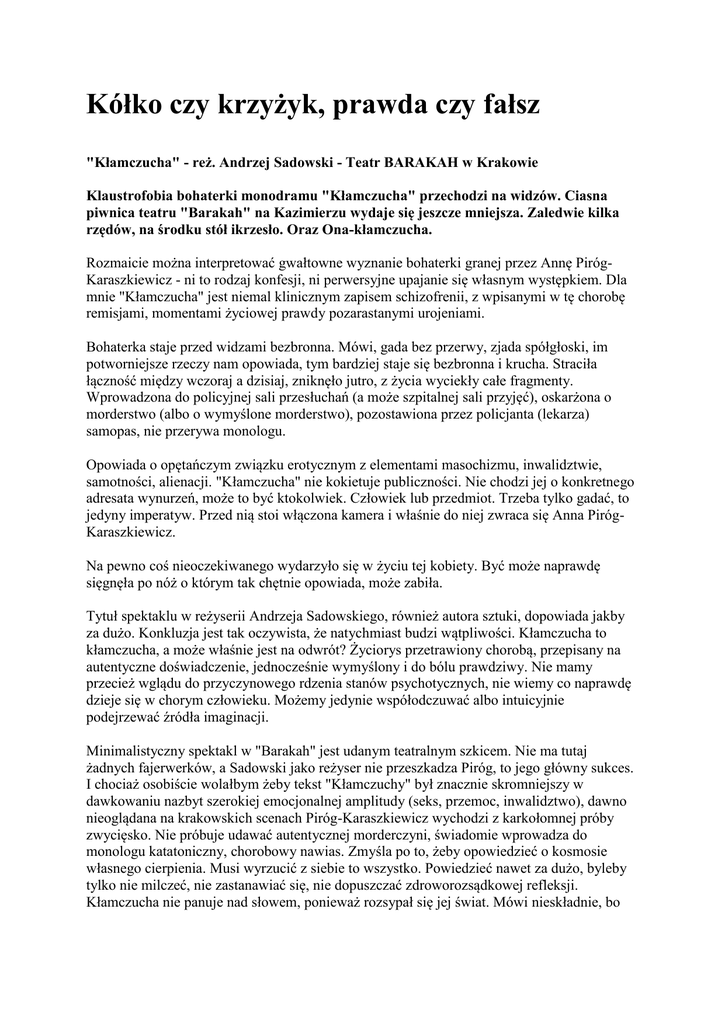 Kółko czy krzyżyk, prawda czy fałsz "Kłamczucha" - reż. Andrzej Sadowski - Teatr BARAKAH w Krakowie Klaustrofobia bohaterki monodramu "Kłamczucha" przechodzi na widzów. Ciasna piwnica teatru "Barakah" na Kazimierzu wydaje się jeszcze mniejsza. Zaledwie kilka rzędów, na środku stół ikrzesło. Oraz Ona-kłamczucha. Rozmaicie można interpretować gwałtowne wyznanie bohaterki granej przez Annę PirógKaraszkiewicz - ni to rodzaj konfesji, ni perwersyjne upajanie się własnym występkiem. Dla mnie "Kłamczucha" jest niemal klinicznym zapisem schizofrenii, z wpisanymi w tę chorobę remisjami, momentami życiowej prawdy pozarastanymi urojeniami. Bohaterka staje przed widzami bezbronna. Mówi, gada bez przerwy, zjada spółgłoski, im potworniejsze rzeczy nam opowiada, tym bardziej staje się bezbronna i krucha. Straciła łączność między wczoraj a dzisiaj, zniknęło jutro, z życia wyciekły całe fragmenty. Wprowadzona do policyjnej sali przesłuchań (a może szpitalnej sali przyjęć), oskarżona o morderstwo (albo o wymyślone morderstwo), pozostawiona przez policjanta (lekarza) samopas, nie przerywa monologu. Opowiada o opętańczym związku erotycznym z elementami masochizmu, inwalidztwie, samotności, alienacji. "Kłamczucha" nie kokietuje publiczności. Nie chodzi jej o konkretnego adresata wynurzeń, może to być ktokolwiek. Człowiek lub przedmiot. Trzeba tylko gadać, to jedyny imperatyw. Przed nią stoi włączona kamera i właśnie do niej zwraca się Anna PirógKaraszkiewicz. Na pewno coś nieoczekiwanego wydarzyło się w życiu tej kobiety. Być może naprawdę sięgnęła po nóż o którym tak chętnie opowiada, może zabiła. Tytuł spektaklu w reżyserii Andrzeja Sadowskiego, również autora sztuki, dopowiada jakby za dużo. Konkluzja jest tak oczywista, że natychmiast budzi wątpliwości. Kłamczucha to kłamczucha, a może właśnie jest na odwrót? Życiorys przetrawiony chorobą, przepisany na autentyczne doświadczenie, jednocześnie wymyślony i do bólu prawdziwy. Nie mamy przecież wglądu do przyczynowego rdzenia stanów psychotycznych, nie wiemy co naprawdę dzieje się w chorym człowieku. Możemy jedynie współodczuwać albo intuicyjnie podejrzewać źródła imaginacji. Minimalistyczny spektakl w "Barakah" jest udanym teatralnym szkicem. Nie ma tutaj żadnych fajerwerków, a Sadowski jako reżyser nie przeszkadza Piróg, to jego główny sukces. I chociaż osobiście wolałbym żeby tekst "Kłamczuchy" był znacznie skromniejszy w dawkowaniu nazbyt szerokiej emocjonalnej amplitudy (seks, przemoc, inwalidztwo), dawno nieoglądana na krakowskich scenach Piróg-Karaszkiewicz wychodzi z karkołomnej próby zwycięsko. Nie próbuje udawać autentycznej morderczyni, świadomie wprowadza do monologu katatoniczny, chorobowy nawias. Zmyśla po to, żeby opowiedzieć o kosmosie własnego cierpienia. Musi wyrzucić z siebie to wszystko. Powiedzieć nawet za dużo, byleby tylko nie milczeć, nie zastanawiać się, nie dopuszczać zdroworozsądkowej refleksji. Kłamczucha nie panuje nad słowem, ponieważ rozsypał się jej świat. Mówi nieskładnie, bo taka jest jej osobowość. Zbrodniarka zagaduje zbrodnię. Kółko czy krzyżyk, prawda czy fałsz... Łukasz Maciejewski Polska Gazeta Krakowska 2 maja 2013 Spektakle "Kłamczucha" - reż. Andrzej Sadowski - Teatr BARAKAH w Krakowie Teatry Teatr BARAKAH w Krakowie