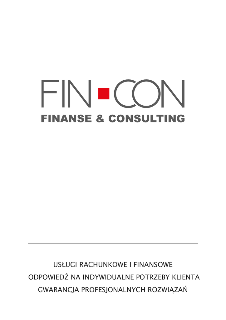 USŁUGI RACHUNKOWE I FINANSOWE ODPOWIEDŹ NA INDYWIDUALNE POTRZEBY KLIENTA GWARANCJA PROFESJONALNYCH ROZWIĄZAŃ Spis treści: Kim jesteśmy.........................................................3 Czym się zajmujemy..............................................4 Korzyści ze współpracy z FIN-CON........................5 Terminy realizacji usług........................................6 Wynagrodzenie......................................................6 Kontakt.................................................................7 Finanse & Consulting 2 KIM JESTEŚMY Jesteśmy grupą specjalistów z ponad 10 letnim doświadczeniem. Posiadamy licencję Min. Finansów Nr 29011/02. Różnorodność naszych klientów spowodowała, że poznaliśmy specyfikę wszelkich form organizacyjnych, np. spółek, fundacji, stowarzyszeń i innych wraz z ich potrzebami. Zapewniamy bezbłędną i rzetelną obsługę księgową oraz doradztwo. Będąc dla naszych klientów zaufanym partnerem w biznesie, dajemy im poczucie bezpieczeństwa w relacjach z fiskusem. Pomagamy w minimalizowaniu kosztów oraz doradzamy, jak poruszać się w zawiłych przepisach prawa gospodarczego. Zapewniając obsługę naszym Klientom współpracujemy z: - z radcami prawnymi w zakresie prawa gospodarczego, - biegłymi rewidentami w zakresie rachunkowości, - kancelariami w zakresie pomocy w udzielaniu finansowania dla naszych klientów, - inspektorami pracy w zakresie rozwiązywania trudnych spraw kadrowych. Każdego naszego Klienta traktujemy indywidualnie i wyjątkowo. Wiemy jak trudno prowadzi się dzisiaj biznes dlatego stworzyliśmy alternatywę obniżenia kosztów prowadzenia księgowości dla właścicieli firm, którzy podejmują codziennie ważne decyzje aby przetrwać w warunkach kryzysu i rozwijać firmę. Specjalizujemy się w obsłudze firm działających w branżach: • kancelarie prawne, • reklama i marketing, • gabinety medyczne i kliniki, • produkcja, • hurtownie i sklepy, • sprzedaż internetowa, • gastronomia, • usługi budowlane, • usługi coachingowe i szkoleniowe, Zaufały nam takie firmy jak: GO CULTURE Sp. z o. o., Jazz Bistro Group, JazzZone NUNUNU, ZEN JazzZone, JazzZone Piękna, Gwiazdeczka Sp. z o. o., Klinika MEDICAR, KBR Partners Sp. z o. o., UPSS Sp. z o. o., KSK COMPANY Sp. z o. o., LEMON S.C., PRO SPA CONSULTING, SUSHIBU, REMBUD, Co&Co, PIANO, Café Piwnica. Zadowolenie Klientów, z którymi pracujemy na co dzień pozyskujemy przez polecenia coraz więcej dużych i małych firm. powoduje, iż Finanse & Consulting 3 CZYM SIĘ ZAJMUJEMY Prowadzimy usługi rachunkowe na zasadzie outsourcingu dla: - średnich i małych firm, - osób prowadzących działalność gospodarczą. W pierwszym etapie analizujemy działalność firmy naszego Klienta i wspólnie ustalamy potrzeby , oczekiwania i zakres współpracy. Szanujemy czas naszych Klientów dlatego oferujemy możliwość odbierania dokumentów z siedziby firmy Klienta. Zajmujemy się całokształtem obsługi rachunkowo finansowej firm. W szczególności: • bieżącą obsługą rachunkową spółek kapitałowych i osobowych, • bieżącą obsługą rachunkową małych przedsiębiorców - KPiR, • sprawami kadrowymi i rozliczaniem płac pracowników, • rozliczaniem z ZUS I Urzędem Skarbowym w imieniu Klienta, • sporządzamy sprawozdania i analizy dla potrzeb zarządu i właścicieli firm, • sporządzamy sprawozdania finansowe okresowe i roczne, • prowadzimy ewidencję majątku i środków trwałych , • wyprowadzamy zaległości rachunkowe i nieprawidłowości po kontrolach skarbowych, • sporządzamy sprawozdania do GUS, NBP, NTRASTAT, • sporządzamy dokumentację wewnętrzną firmy wymaganą przepisami ( polityka rachunkowości, instrukcje inwentaryzacji, kasowe i inne ) • reprezentujemy naszych Klientów przed Urzędem Skarbowym, ZUS oraz podczas kontroli, • współpracujemy z biegłymi rewidentami w zakresie badania sprawozdań finansowych, • dokonujemy przekształceń i wyodrębnień zorganizowanych części przedsiębiorstw, • pomagamy w uzyskaniu kredytowania i leasingów dla naszych Klientów, Finanse & Consulting 4 • sporządzamy wewnętrzne uchwały zarządu i wspólników oraz dokonujemy zmian w KRS i innych instytucjach w imieniu naszych Klientów, • współpracujemy z firmami w zakresie pozyskiwania pracowników dla naszych Klientów, • współpracujemy z firmami w zakresie ubezpieczeń na preferencyjnych warunkach dla naszych Klientów, KORZYŚCI ZE WSPÓŁPRACY Z FIN-CON Gwarantujemy: 1. wysoką jakość usług 2. profesjonalne i indywidualne podejście 3. skuteczność i terminowość Współpraca z firma Fin-Con to obniżenie kosztów Państwa firmy w obszarze wewnętrznej obsługi księgowo-kadrowej. To również otrzymywanie na czas profesjonalnych raportów, rozliczeń, wyników, analiz oraz innych sprawozdań niezbędnych do podejmowania decyzji. Reprezentujemy Państwa przed urzędami – Urząd Skarbowy, ZUS, PIP, . Wszystkie kontrole związane z obszarem księgowo- kadrowym odbywają się w naszym biurze bez stresu i angażowania czasu naszych Klientów. ZAPEWNIAMY: • bardzo dobrą znajomość przepisów i zasad panujących w Polsce w obsłudze podatkowej, • działanie na terenie całego kraju; • kompleksową obsługę Państwa firmy; • oszczędność czasu naszych Klientów; • rzetelność i zaufanie – zdecydowana większość naszych Klientów współpracuje z nami przez wiele lat; • sprawdzone metody i narzędzia pracy; Finanse & Consulting 5 • szybkość i precyzja działania wynikająca z wieloletniego doświadczenia naszego zespołu Zaufało nam wiele firm, z którymi pracujemy od lat. Mamy nadzieję , iż nasza oferta będzie dla Państwa atrakcyjna i godna uwagi. TERMINY REALIZACJI USŁUG W każdym prawie podatkowym i gospodarczym wyznaczone są nieprzekraczalne terminy dokonywania rozliczeń. My proponujemy naszym Klientom znacznie wcześniejsze terminy rozl