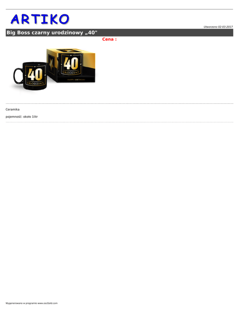 Utworzono 02-03-2017 Big Boss czarny urodzinowy „40" Cena : Ceramika pojemność: około 1litr Wygenerowano w programie www.oscGold.com