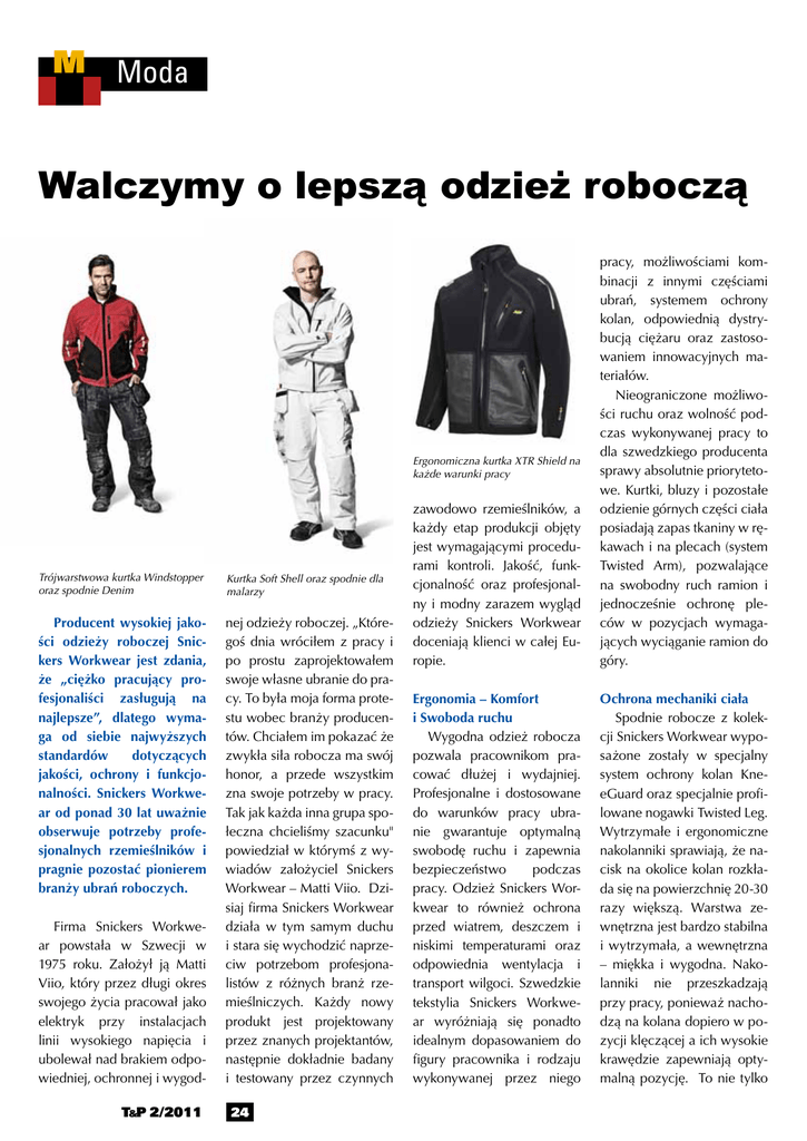 M Moda Walczymy o lepszą odzież roboczą zawodowo rzemieślników, a każdy etap produkcji objęty jest wymagającymi procedurami kontroli. Jakość, funkcjonalność oraz profesjonalny i modny zarazem wygląd odzieży Snickers Workwear doceniają klienci w całej Europie. pracy, możliwościami kombinacji z innymi częściami ubrań, systemem ochrony kolan, odpowiednią dystrybucją ciężaru oraz zastosowaniem innowacyjnych materiałów. Nieograniczone możliwości ruchu oraz wolność podczas wykonywanej pracy to dla szwedzkiego producenta sprawy absolutnie priorytetowe. Kurtki, bluzy i pozostałe odzienie górnych części ciała posiadają zapas tkaniny w rękawach i na plecach (system Twisted Arm), pozwalające na swobodny ruch ramion i jednocześnie ochronę pleców w pozycjach wymagających wyciąganie ramion do góry. Ergonomia – Komfort i Swoboda ruchu Wygodna odzież robocza pozwala pracownikom pracować dłużej i wydajniej. Profesjonalne i dostosowane do warunków pracy ubranie gwarantuje optymalną swobodę ruchu i zapewnia bezpieczeństwo podczas pracy. Odzież Snickers Workwear to również ochrona przed wiatrem, deszczem i niskimi temperaturami oraz odpowiednia wentylacja i transport wilgoci. Szwedzkie tekstylia Snickers Workwear wyróżniają się ponadto idealnym dopasowaniem do figury pracownika i rodzaju wykonywanej przez niego Ochrona mechaniki ciała Spodnie robocze z kolekcji Snickers Workwear wyposażone zostały w specjalny system ochrony kolan KneeGuard oraz specjalnie profilowane nogawki Twisted Leg. Wytrzymałe i ergonomiczne nakolanniki sprawiają, że nacisk na okolice kolan rozkłada się na powierzchnię 20-30 razy większą. Warstwa zewnętrzna jest bardzo stabilna i wytrzymała, a wewnętrzna – miękka i wygodna. Nakolanniki nie przeszkadzają przy pracy, ponieważ nachodzą na kolana dopiero w pozycji klęczącej a ich wysokie krawędzie zapewniają optymalną pozycję. To nie tylko Ergonomiczna kurtka XTR Shield na każde warunki pracy Trójwarstwowa kurtka Windstopper oraz spodnie Denim Kurtka Soft Shell oraz spodnie dla malarzy Producent wysokiej jakości odzieży roboczej Snickers Workwear jest zdania, że „ciężko pracujący profesjonaliści zasługują na najlepsze”, dlatego wymaga od siebie najwyższych standardów dotyczących jakości, ochrony i funkcjonalności. Snickers Workwear od ponad 30 lat uważnie obserwuje potrzeby profesjonalnych rzemieślników i pragnie pozostać pionierem branży ubrań roboczych. nej odzieży roboczej. „Któregoś dnia wróciłem z pracy i po prostu zaprojektowałem swoje własne ubranie do pracy. To była moja forma protestu wobec branży producentów. Chciałem im pokazać że zwykła siła robocza ma swój honor, a przede wszystkim zna swoje potrzeby w pracy. Tak jak każda inna grupa społeczna chcieliśmy szacunku" powiedział w którymś z wywiadów założyciel Snickers Workwear – Matti Viio. Dzisiaj firma Snickers Workwear działa w tym samym duchu i stara się wychodzić naprzeciw potrzebom profesjonalistów z różnych branż rzemieślniczych. Każdy nowy produkt jest projektowany przez znanych projektantów, następnie dokładnie badany i testowany przez czynnych Firma Snickers Workwear powstała w Szwecji w 1975 roku. Założył ją Matti Viio, który przez długi okres swojego życia pracował jako elektryk przy instalacjach linii wysokiego napięcia i ubolewał nad brakiem odpowiedniej, ochronnej i wygodT&P 2/2011 24 Moda M wygoda, ale przede wszystkim maksymalna ochrona kolan przed uszkodzeniami, wypadkami i niepotrzebnym nadwyrężeniem. Spodnie jak i nakolanniki Snickers Workwear posiadają certyfikat najnowszej normy ochrony kolan EN 14404. Przyszłość jest teraz: innowacyjne technologie i materiały Priorytetem producenta odzieży roboczej Snickers Workwear jest utrzymanie najwyższej jakości, ochrony oraz wygody, dlatego do produkcji swojej odzieży wyNakolanniki Snickers spełniające normę EN 14404 nej a strona zewnętrzna to specjalnie impregnowany poliester. Spodnie DuraTwill serii 3 to najlepiej sprzedający się model w Europie. Naj- nowszą technologią wprowadzoną przez producenta Snickers Workwear jest tkanina Superfabric, która gwarantuje odporność na przecięcia i zadrapania. Tkaniny Superfabric są elastyczne, chwytne i potrafią dopasować się do warunków zewnętrznych i wewnętrznych. „ Podczas testów na wycieranie przeprowadzanych w Szwecji materiał okazał się po prostu absolutnie niezawodny i lepszy od Cordury czy Kevlaru” podsumował Pan Krzysztof Biedulski (właściciel firmy Kris będącej wy- Kolekcja trudnopalna Antiflame Szwedzki producent pomyślał również o ochronie bioder, ramion, pleców oraz kręgosłupa i zaprojektował ochronny i funkcjonalny pas na narzędzia Snickers FlexiToolbelt. Zapewnia on idealne rozłożenie wagi oraz umożliwia pełen wybór worków i mocowań w zależności od potrzeby. Możliwość wyboru między samym pasem lub pasem na szelkach zapewni optymalną funkcjonalność i wygodę przy pracy z narzędziami. Ergonomiczne pasy narzędziowe takie jak FlexiToolbelt polecają sami specjaliści BHP. korzystuje tylko najnowsze technologie i innowacyjne rozwiązania. Należą do nich między innymi nowoczesne materiały membranowe Gore-Tex i Windstopper, jak również super wytrzymałe materiały Cordura i Kevlar używane w celu dodatkowego wzmocnienia najbardziej narażonych części ubrań (kieszeni, kolan oraz łokci). Odporna na brud i wodę tkanina DuraTwill stała się flagowym produktem producenta. Spodnie, ogrodniczki i bluzy z tego materiału posiadają wygodną i miłą w dotyku bawełnę od strony wewnętrz- Result 1/4box 4c 25 T&P 2/2011 M Moda łącznym importerem odzieży Snickers Workwear w Polsce). Wycinek z katalogu 2011 Oferta odzieży Snickers jest niemalże nieograniczona. Znajdziemy w niej spodnie, ogrodniczki, kurtki, odzież przeciwdeszczową, odblaskową, trudnopalną, odzież damską i dla m
