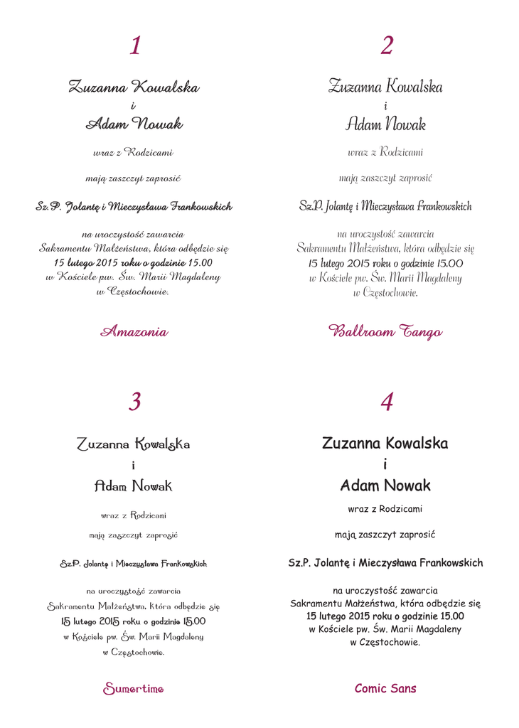1 2 Zuzanna Kowalska Zuzanna Kowalska i i Adam Nowak Adam Nowak wraz z Rodzicami wraz z Rodzicami mają zaszczyt zaprosić mają zaszczyt zaprosić Sz.P. Jolantę i Mieczysława Frankowskich Sz.P. Jolantę i Mieczysława Frankowskich na uroczystość zawarcia Sakramentu Małżeństwa, która odbędzie się 15 lutego 2015 roku o godzinie 15.00 w Kościele pw. Św. Marii Magdaleny w Częstochowie. na uroczystość zawarcia Sakramentu Małżeństwa, która odbędzie się 15 lutego 2015 roku o godzinie 15.00 w Kościele pw. Św. Marii Magdaleny w Częstochowie. Amazonia Ballroom Tango 3 4 Zuzanna Kowalska i Adam Nowak Zuzanna Kowalska i Adam Nowak wraz z Rodzicami wraz z Rodzicami mają zaszczyt zaprosić mają zaszczyt zaprosić Sz.P. Jolantę i Mieczysława Frankowskich Sz.P. Jolantę i Mieczysława Frankowskich na uroczystość zawarcia Sakramentu Małżeństwa, która odbędzie się 15 lutego 2015 roku o godzinie 15.00 w Kościele pw. Św. Marii Magdaleny w Częstochowie. na uroczystość zawarcia Sakramentu Małżeństwa, która odbędzie się 15 lutego 2015 roku o godzinie 15.00 w Kościele pw. Św. Marii Magdaleny w Częstochowie. Sumertime Comic Sans 5 6 Zuzanna Kowalska Zuzanna Kowalska i i Adam Nowak Adam Nowak wraz z Rodzicami wraz z Rodzicami mają zaszczyt zaprosić mają zaszczyt zaprosić Sz.P. Jolantę i Mieczysława Frankowskich Sz.P. Jolantę i Mieczysława Frankowskich na uroczystość zawarcia Sakramentu Małżeństwa, która odbędzie się 15 lutego 2015 roku o godzinie 15.00 w Kościele pw. Św. Marii Magdaleny w Częstochowie. na uroczystość zawarcia Sakramentu Małżeństwa, która odbędzie się 15 lutego 2015 roku o godzinie 15.00 w Kościele pw. Św. Marii Magdaleny w Częstochowie. Staropolski 8 Adobe Garmond 7 8 Zuzanna Kowalska Zuzanna Kowalska i i Adam Nowak Adam Nowak wraz z Rodzicami wraz z Rodzicami mają zaszczyt zaprosić mają zaszczyt zaprosić Sz.P. Jolantę i Mieczysława Frankowskich Sz.P. Jolantę i Mieczysława Frankowskich na uroczystość zawarcia Sakramentu Małżeństwa, która odbędzie się 15 lutego 2015 roku o godzinie 15.00 w Kościele pw. Św. Marii Magdaleny w Częstochowie. na uroczystość zawarcia Sakramentu Małżeństwa, która odbędzie się 15 lutego 2015 roku o godzinie 15.00 w Kościele pw. Św. Marii Magdaleny w Częstochowie. Kastler Lincoln 9 10 Zuzanna Kowalska i Adam Nowak Zuzanna Kowalska i Adam Nowak wraz z Rodzicami wraz z Rodzicami mają zaszczyt zaprosić mają zaszczyt zaprosić Sz.P. Jolantę i Mieczysława Frankowskich Sz.P. Jolantę i Mieczysława Frankowskich na uroczystość zawarcia Sakramentu Małżeństwa, która odbędzie się 15 lutego 2015 roku o godzinie 15.00 w Kościele pw. Św. Marii Magdaleny w Częstochowie. na uroczystość zawarcia Sakramentu Małżeństwa, która odbędzie się 15 lutego 2015 roku o godzinie 15.00 w Kościele pw. Św. Marii Magdaleny w Częstochowie. Nuance Palatino Linotype 11 12 Zuzanna Kowalska Zuzanna Kowalska i i Adam Nowak Adam Nowak wraz z Rodzicami wraz z Rodzicami mają zaszczyt zaprosić mają zaszczyt zaprosić Sz.P. Jolantę i Mieczysława Frankowskich Sz.P. Jolantę i Mieczysława Frankowskich na uroczystość zawarcia Sakramentu Małżeństwa, która odbędzie się 15 lutego 2015 roku o godzinie 15.00 w Kościele pw. Św. Marii Magdaleny w Częstochowie. na uroczystość zawarcia Sakramentu Małżeństwa, która odbędzie się 15 lutego 2015 roku o godzinie 15.00 w Kościele pw. Św. Marii Magdaleny w Częstochowie. Unicorn Zurich 13 14 Zuzanna Kowalska i Adam Nowak Zuzanna Kowalska i Adam Nowak wraz z Rodzicami wraz z Rodzicami mają zaszczyt zaprosić mają zaszczyt zaprosić Sz.P. Jolantę i Mieczysława Frankowskich Sz.P. Jolantę i Mieczysława Frankowskich na uroczystość zawarcia na uroczystość zawarcia Sakramentu Małżeństwa, która odbędzie się 15 lutego 2015 roku o godzinie 15.00 w Kościele pw. Św. Marii Magdaleny w Częstochowie. Sakramentu Małżeństwa, która odbędzie się 15 lutego 2015 roku o godzinie 15.00 w Kościele pw. Św. Marii Magdaleny w Częstochowie. Brameręczny Monotype Corsiva 15 16 Zuzanna Kowalska Zuzanna Kowalska i i Adam Nowak Adam Nowak wraz z Rodzicami wraz z Rodzicami mają zaszczyt zaprosić mają zaszczyt zaprosić Sz.P. Jolantę i Mieczysława Frankowskich Sz.P. Jolantę i Mieczysława Frankowskich na uroczystość zawarcia Sakramentu Małżeństwa, która odbędzie się 15 lutego 2015 roku o godzinie 15.00 w Kościele pw. Św. Marii Magdaleny w Częstochowie. na uroczystość zawarcia Sakramentu Małżeństwa, która odbędzie się 15 lutego 2015 roku o godzinie 15.00 w Kościele pw. Św. Marii Magdaleny w Częstochowie. Sureal Celine 17 18 Zuzanna Kowalska i Adam Nowak Zuzanna Kowalska i Adam Nowak wraz z Rodzicami wraz z Rodzicami mają zaszczyt zaprosić mają zaszczyt zaprosić Sz.P. Jolantę i Mieczysława Frankowskich Sz.P. Jolantę i Mieczysława Frankowskich na uroczystość zawarcia Sakramentu Małżeństwa, która odbędzie się 15 lutego 2015 roku o godzinie 15.00 w Kościele pw. Św. Marii Magdaleny w Częstochowie. na uroczystość zawarcia Sakramentu Małżeństwa, która odbędzie się 15 lutego 2015 roku o godzinie 15.00 w Kościele pw. Św. Marii Magdaleny w Częstochowie. Standardowy 5 Aphrodite 19 20 Zuzanna Kowalska Zuzanna Kowalska i Adam Nowak i Adam Nowak wraz z Rodzicami wraz z Rodzicami mają zaszczyt zapr osić mają zaszczyt zaprosić Sz.P. Jolantę i Mieczysława Frankowskich Sz.P. Jolantę i Mieczysława Frankowskich na ur oczystość zawarcia Sakramentu Małżeństwa, która odbędzie się 15 lutego 2015 r oku o godzinie 15.00 w Kościele pw. Św. Marii Magdaleny w Częstochowie. na uroczystość zawarcia Sakramentu Małżeństwa, która odbędzie się 15 lutego 2015 roku o godzinie 15.00 w Kościele pw. Św. Marii Magdaleny w Częstochowie. Wolfhanza Piranesi 21 22 Zuzanna Kowalska Zuzanna Kowalska i Adam Nowak i Adam Nowak wraz z Rodzicami mają zaszczyt zaprosić Sz.P. Jolantę i Miecz