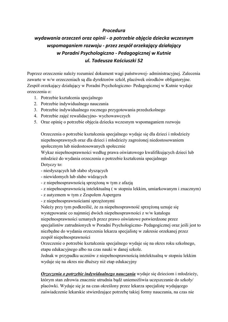 Procedura wydawania orzeczeń oraz opinii - o potrzebie objęcia dziecka wczesnym wspomaganiem rozwoju - przez zespół orzekający działający w Poradni Psychologiczno - Pedagogicznej w Kutnie ul. Tadeusza Kościuszki 52 Poprzez orzeczenie należy rozumieć dokument wagi państwowej- administracyjnej. Zalecenia zawarte w w/w orzeczeniach są dla dyrektorów szkół, placówek ośrodków obligatoryjne. Zespół orzekający działający w Poradni Psychologiczno- Pedagogicznej w Kutnie wydaje orzeczenia o: 1. Potrzebie kształcenia specjalnego 2. Potrzebie indywidualnego nauczania 3. Potrzebie indywidualnego rocznego przygotowania przedszkolnego 4. Potrzebie zajęć rewalidacyjno- wychowawczych 5. Oraz opinię o potrzebie objęcia dziecka wczesnym wspomaganiem rozwoju Orzeczenia o potrzebie kształcenia specjalnego wydaje się dla dzieci i młodzieży niepełnosprawnych oraz dla dzieci i młodzieży zagrożonej niedostosowaniem społecznym lub niedostosowanych społecznie Wykaz niepełnosprawności według prawa oświatowego kwalifikujących dzieci lub młodzież do wydania orzeczenia o potrzebie kształcenia specjalnego Dotyczy to: - niesłyszących lub słabo słyszących - niewidomych lub słabo widzących - z niepełnosprawnością sprzężoną w tym z afazją - z niepełnosprawnością intelektualną ( w stopniu lekkim, umiarkowanym i znacznym) - z autyzmem w tym z Zespołem Aspergera - z niepełnosprawnościami sprzężonymi Należy przy tym podkreślić, że za niepełnosprawność sprzężoną uznaje się występowanie co najmniej dwóch niepełnosprawności z w/w katalogu niepełnosprawności uznanych przez prawo oświatowe potwierdzone przez specjalistów zatrudnionych w Poradni Psychologiczno- Pedagogicznej oraz jeśli jest to niezbędne do wydania orzeczenia lekarza specjalistę w zakresie orzekanej przez zespół niepełnosprawności Orzeczenie o potrzebie kształcenia specjalnego wydaje się na okres roku szkolnego, etapu edukacyjnego albo na czas nauki w danej szkole. Jednak w przypadku uczniów z niepełnosprawnością intelektualną w stopniu lekkim wydaje się na okres nie dłuższy niż etap edukacyjny Orzeczenia o potrzebie indywidualnego nauczania wydaje się dzieciom i młodzieży, którym stan zdrowia znacznie utrudnia bądź uniemożliwia uczęszczanie do szkoły/ placówki. Wydaje się je na czas określony przez lekarza specjalistę wydającego zaświadczenie lekarskie stwierdzające potrzebę takiej formy nauczania, na czas nie krótszy niż 30 dni i nie dłuższy niż rok w przypadku uczniów szkół zawodowych- w tym wypadku niezbędne jest również zaświadczenie od lekarza medycyny pracy, który stwierdza,że stan zdrowia nie uniemożliwia kontynuowanie nauki w zawodzie Orzeczenia o potrzebie indywidualnego rocznego obowiązkowego przygotowania przedszkolnego wydaje się dla dzieci, których stan zdrowia uniemożliwia bądź znacznie utrudnia uczęszczanie do przedszkola lub oddziału przedszkolnego zorganizowanego przy szkole podstawowej- wydaje się je również na okres nie krótszy niż 30 dni na podstawie zaświadczenia lekarskiego ze wskazaniem czasu gdy ta forma kształcenia jest niezbędna. Orzeczenia o potrzebie zajęć rewalidacyjno- wychowawczych wydawane są dla dzieci i młodzieży z upośledzeniem umysłowym w stopniu głębokim. Orzeczenie to wydaje się na okres 5 lat – nie dłużej niż do końca roku szkolnego w roku kalendarzowym w której uczeń kończy 25 lat Zespół orzekający działający w Poradni Psychologiczno- Pedagogicznej w Kutnie wydaje również opinię o potrzebie objęcia dziecka wczesnym wspomaganiem rozwoju. Opinię taką wydaje się dzieciom na okres od chwili wykrycia niepełnosprawności do czasu podjęcia nauki w szkole. Zespół orzekający powoływany jest przez dyrektora Poradni. W jego skład wchodzą - dyrektor- jako przewodniczący zespołu orzekającego, lub upoważniona przez niego osoba - lekarz - psycholog - pedagog/ pedagog specjalny w zależności od niepełnosprawności - logopeda w przypadku zaburzeń w komunikacji - rehabilitant- jeśli niezbędny jest jego udział Procedura wydania orzeczenia 1. Złożenie wniosku o wydanie orzeczenia/ opinii przez rodzica bądź prawnego opiekuna 2. Powołanie zespołu orzekającego 3. Powiadomienie rodzica /opiekuna o terminie posiedzenia zespołu 4. Sporządzenie protokołu z posiedzenia zespołu orzekającego 5. Sporządzenie metryki rozpatrywanej sprawy- jakim jest wniosek o wydanie orzeczenia/ opinii 6. Opracowanie orzeczenia/ opinii 7. Odebranie osobiste bądź przesłanie rodzicom/ opiekunom orzeczenia Wniosek rodzica powinien zawierać dane rodziców/ opiekunów, określenie przyczyny i celu wydania orzeczenia/ opinii dla którego jest składany. Do wniosku wnioskodawca winien dołączyć wszystkie dokumenty w których jest posiadaniu uzasadniające potrzebę wydania takiego dokumentu oraz w przypadku ucznia opinię ze szkoły zawierającą wszystkie istotne dla postępowania informację w tym diagnozę funkcjonalną ucznia. Orzeczenia i opinie wydawane zespoły orzekające wydają większością głosów. W sytuacji gdy liczba głosów jest równa, głos decydujący ma przewodniczący zespołu. W przypadku nieuwzględnienia wniosku o wydanie orzeczenia lub opinii zespół wydaje odpowiednio orzeczenie o braku potrzeby wydania orzeczenia / opinii Od orzeczenia przysługuje wnioskodawcy 14 dni na odwołanie się . Odwołanie wnioskodawca kieruje do Kuratorium Oświaty w Łodzi z tym że za pośrednictwem zespołu orzekającego działającego w Poradni. Po złożeniu odwołania przewodniczący powołuje zespół o którym informuje wnioskodawcę, jeśli zespół podtrzymuje swoja decyzję wtedy dostarcza/przesyła dokumentacje dziecka do Kuratorium w Łodzi Od złożenia wniosku na rozpatrzenie sprawy poradnia ma 30 dni W ciągu 14 dni od dnia zespołu orzekającego należy wydać orzeczenie/ opinię Dyrektor Poradni Psychologiczno- Pedagogicznej w Kutnie mgr