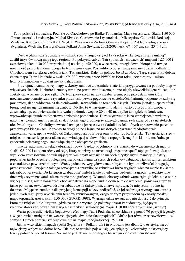 Jerzy Siwek, „ Tatry Polskie i Słowackie”, Polski Przegląd Kartograficzny, t.34, 2002, nr 4 Tatry polskie i słowackie. Podhale od Chochołowa po Białkę Tatrzańską. Mapa turystyczna. Skala 1:50 000. Oprac. autorskie i redakcyjne Michał Siwicki. Cieniowanie i rysunek skał Mieczysław Cukierski. Redakcja Wydawn. Kartograficzne Polkart. Wyd. 1. Warszawa – Zielona Góra – Zakopane: Zakład Kartograficzny Sygnatura, Wydawn. Kartograficzne Polkart Anna Siwicka, 2002/2003. Ark. 67×107 cm, skł. 23×14 cm. Duet wydawniczy Sygnatura – Polkart, specjalizujący się od 1998 roku w „kartografii tatrzańskiej”, zasilił turystów nową mapą tego regionu. Po pokryciu całych Tatr (polskich i słowackich) mapami 1:25 000 i częściowo także 1:30 000 przyszła kolej na skalę 1:50 000, a więc raczej przeglądową, biorąc pod uwagę możliwość przedstawienia topografii terenu górskiego. Pozwoliło to objąć mapą znaczny obszar Podhala, z Chochołowem i większą częścią Białki Tatrzańskiej. Dalej na północ, bo aż za Nowy Targ, sięga tylko dobrze znana mapa Tatry i Podhale w skali 1:75 000, wydana przez PPWK w 1990 roku, lecz niestety – mimo licznych wznowień – do dziś nie aktualizowana. Przy opracowaniu nowej mapy wykorzystano, co zrozumiałe, materiały przygotowane na potrzeby map w większych skalach. Niektóre elementy treści po prostu zmniejszono, a inne uległy niewielkiej generalizacji lub zostały opracowane od początku. Do tych pierwszych należy rzeźba terenu, przy przedstawianiu której mechaniczne pomniejszenie rysunku przyniosło pewne pogorszenie czytelności. Najmniej odporne okazały się poziomice, słabo widoczne na tle cieniowania, szczególnie na terenach leśnych. Trudno jednak o lepszy efekt, biorąc pod uwagę ich minimalną grubość. Myślę, że w następnym wydaniu warto by „coś z tym zrobić”, zaczynając np. od zwiększenia interwału poziomicowego z 20 do 40 m, a tylko tam gdzie to konieczne wprowadzając dwudziestometrowe poziomice pomocnicze. Dużą wytrzymałość na zmniejszenie wykazały natomiast cieniowanie i rysunek skał, chociaż jego drobniejsze szczegóły giną, zwłaszcza gdy są na stokach nieoświetlonych. Chciałbym zwrócić uwagę na jeszcze dwa składniki treści, których opracowanie poszło w przeciwnych kierunkach. Pierwszy to drogi polne i leśne, na niektórych obszarach niedostatecznie zgeneralizowane, np. na wschód od Zakopanego aż po Brzegi oraz w okolicy Kościeliska. Tak gęsta ich sieć – miejscami znacznie gęstsza niż na odpowiadającej skalowo Mapie topograficznej Polski – nie ma żadnego znaczenia orientacyjnego, stanowiąc zbędne obciążenie graficzne. Inaczej natomiast wygląda obraz zabudowy, bardzo uogólniony w stosunku do wcześniejszych map w skali 1:25 000 i całkiem różny od tego, który widzimy na urzędowej „pięćdziesiątce” topograficznej. Jest on wynikiem zastosowania obowiązującej w minionym okresie na mapach turystycznych maniery (niestety, popularnej także obecnie), polegającej na pokazywaniu wszystkich rodzajów zabudowy takim samym znakiem o charakterze powierzchniowym. Wtedy jednak ze względów cenzuralnych nie było możliwości innego jej przedstawienia. Przyjęcie takiego rozwiązania sprawiło, że zabudowa luźna wygląda więc na mapie tak samo jak zabudowa zwarta. Do kategorii „zabudowa” należą także pojedyncze budynki i zagrody, przedstawione dużo większymi znakami, niż na mapie topograficznej. W sumie obszary zabudowane zajmują lokalnie o wiele więcej miejsca, niż to konieczne, chociaż patrząc na mapę trudno odnieść takie wrażenie, ponieważ użyta tu jasno pomarańczowa barwa odsuwa zabudowę na dalszy plan, a nawet sprawia, że miejscami trudno ją dostrzec. Mając zrozumienie dla przyjętej koncepcji należy podkreślić, że jej realizacja wymaga stosowania jednolitych reguł przy wydzielaniu terenów zabudowanych, czego dobrym przykładem są Zasady redakcji mapy topograficznej w skali 1:50 000 (GUGiK 1998). Wymaga także uwagi, aby nie dopuścić do sytuacji, która ma miejsce koło Jurgowa, gdzie na mapie występuje pokaźny obszar zabudowany, będący w rzeczywistości zgrupowaniem starych pasterskich szałasów (na mapie 1:10 000 opisanych jako „szopy”). Warto podkreślić wielkie bogactwo treści mapy Tatr i Podhala, na co składa się ponad 70 pozycji legendy, a więc niewiele mniej niż na wcześniejszych „dwudziestkachpiątkach”. Obfite jest również nazewnictwo – w samych Tatrach bardziej szczegółowe niż na mapie topograficznej 1:50 000. Jak na wszystkich mapach spółki Sygnatura – Polkart, tak i tu widoczna jest dbałość o estetykę, na co największy wpływ ma dobór barw. Dla niej to właśnie pojawił się „ocieplający” kolor żółty, pokrywający tereny położone ponad lasami. Nie ma to jednak nic wspólnego z barwnym cieniowaniem stoków oświetlonych, znanym z map szwajcarskich i niemieckich. Dzięki temu zabiegowi obszar mapy został wyraźnie podzielony na trzy części: intensywnie cieniowane i żółto oświetlone najwyższe partie Tatr, zielone powierzchnie leśne i biały obszar Podhala. Tradycyjnie godny uwagi jest także rewers mapy, zawierający informator krajoznawczy i turystyczny, tym razem wyposażony tylko w niezbyt obszerny tekst, jak zwykle jednak ilustrowany pięknymi fotografiami. Warto zauważyć, że do każdej mapy Tatr wydawanej przez obie firmy dołączony jest inny zestaw fotografii, z których tyko kilka powtarza się. Atrakcyjnym pomysłem jest umieszczenie podstawowych informacji o 23 schroniskach polskich i słowackich (m. in. o warunkach zakwaterowania i wyżywienia oraz możliwości dotarcia) wraz z ich fotografiami. Znakiem czasu jest też mapa zasięgu telefonów komórkowych. Na koniec kilka słów o dwóch łatwych – mam nadzieję – do usunięcia niedoróbkach. Pierwsza sprawa to opuszczenie granic rezerwatów przyrody, mimo podanych n