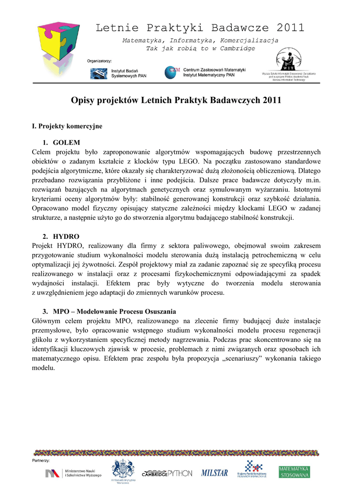 Opisy projektów Letnich Praktyk Badawczych 2011 I. Projekty komercyjne 1. GOLEM Celem projektu było zaproponowanie algorytmów wspomagających budowę przestrzennych obiektów o zadanym kształcie z klocków typu LEGO. Na początku zastosowano standardowe podejścia algorytmiczne, które okazały się charakteryzować dużą złożonością obliczeniową. Dlatego przebadano rozwiązania przybliżone i inne podejścia. Dalsze prace badawcze dotyczyły m.in. rozwiązań bazujących na algorytmach genetycznych oraz symulowanym wyżarzaniu. Istotnymi kryteriami oceny algorytmów były: stabilność generowanej konstrukcji oraz szybkość działania. Opracowano model fizyczny opisujący statyczne zależności między klockami LEGO w zadanej strukturze, a następnie użyto go do stworzenia algorytmu badającego stabilność konstrukcji. 2. HYDRO Projekt HYDRO, realizowany dla firmy z sektora paliwowego, obejmował swoim zakresem przygotowanie studium wykonalności modelu sterowania dużą instalacją petrochemiczną w celu optymalizacji jej żywotności. Zespół projektowy miał za zadanie zapoznać się ze specyfiką procesu realizowanego w instalacji oraz z procesami fizykochemicznymi odpowiadającymi za spadek wydajności instalacji. Efektem prac były wytyczne do tworzenia modelu sterowania z uwzględnieniem jego adaptacji do zmiennych warunków procesu. 3. MPO – Modelowanie Procesu Osuszania Głównym celem projektu MPO, realizowanego na zlecenie firmy budującej duże instalacje przemysłowe, było opracowanie wstępnego studium wykonalności modelu procesu regeneracji glikolu z wykorzystaniem specyficznej metody nagrzewania. Podczas prac skoncentrowano się na identyfikacji kluczowych zjawisk w procesie, problemach z nimi związanych oraz sposobach ich matematycznego opisu. Efektem prac zespołu była propozycja „scenariuszy” wykonania takiego modelu. II. Projekty badawcze 4. MIND Głównym celem projektu, przeprowadzonym przez osoby skupione wokół tematyki mindfulness, była weryfikacja hipotez dotyczących wpływu praktyki uważności na działanie procesów poznawczych: pamięci operacyjnej i funkcji uwagowych. W ramach projektu uczestnicy wzięli udział w eksperymencie badającym wpływ bodźców zewnętrznych na efektywność wykonywania zadań wymagających dużej koncentracji. Zapoznali się również z głównymi założeniami i sposobami praktykowania uważności. 5. MONEY Prace grupy skupiły się na analizie historii pieniądza, teorii ekonomicznych i funkcjonowania globalnego systemu finansowego celem rozważenia, co w przyszłości mogłoby stanowić podstawę pieniądza. Wyjątkowo dynamiczna sytuacja na światowych rynkach finansowych i surowcowych dawała okazję do uważnej obserwacji i analizy bieżących wydarzeń. Dodatkowo, stworzono repozytorium informacji dotyczących kluczowych zagadnień związanych z przedmiotem projektu. 6. NINJA W ramach projektu grupa miała za zadanie określenie wytycznych dla procesu efektywnego pozyskiwania projektów badawczych na rzecz instytucji naukowo-badawczej zajmującej się działaniami z zakresu industrial mathematics. Prace prowadzone były przy wykorzystaniu wiedzy oraz doświadczenia zdobytego w trakcie projektów SHOBO oraz SHURIKEN. Celem projektu była identyfikacja branż i przedsiębiorstw, dla których prace badawczo-rozwojowe mogą mieć kluczowe znaczenie. Ponadto uczestnicy projektu mieli możliwość zapoznania się z elementami business development. 7. RED - Rozwój Elektroniki Drukowanej Celem projektu RED było zbadanie aktualnego stanu technologii elektroniki drukowanej oraz próba określenia perspektyw jej rozwoju i możliwych zastosowań w okresie najbliższych lat. Grupa projektowa miała za zadanie wskazać nowatorskie i niestandardowe sposoby wykorzystania nowych możliwości jakie niesie ta technologia. Zakres merytoryczny prac obejmował m.in. sposoby wytwarzania, wykorzystywane materiały, możliwości realizacji poszczególnych produktów oraz opis rynków, na których urządzenia wytworzone dzięki nowoczesnej technologii znalazłyby zastosowanie. 8. SHOBO Celem projektu była analiza metod popularyzacji i promocji przedsięwzięć naukowych na przykładzie działań związanych z industrial mathematics. Uczestnicy projektu mieli okazję zapoznać się z różnymi sposobami rozpowszechniania informacji, ze szczególnym uwzględnieniem działań w Internecie. 9. SHURIKEN Celem projektu było zapoznanie zespołu z procesem przygotowywania materiałów informacyjnych na temat przedsięwzięć naukowych, na przykładzie industrial mathematics. W ramach projektu uczestnicy poznawali metody efektywnej analizy, selekcji oraz organizowania zasobów informacji celem ich skutecznej prezentacji. III. Projekty wspomagające 10. ADMIN Celem projektu było wsparcie działań praktyk od strony administracyjnej. Do zadań uczestników należało m.in. archiwizowanie dokumentacji oraz niezbędnych informacji o innych projektach, a także ich uczestnikach i liderach. Ważnym zadaniem było wyszukiwanie, a następnie dystrybucja wśród pozostałych praktykantów artykułów prasowych związanych z tematyką realizowanych projektów oraz dziedziną industrial mathematics. Zespół projektowy zajmował się także tworzeniem dokumentacji fotograficznej Letnich Praktyk Badawczych. 11. BOOTCAMP Bootcamp był intensywnym tygodniowym projektem mającym na celu wdrożenie do pracy na praktykach. Praktykanci zostali przeszkoleni w zakresie wyszukiwania informacji, pisania syntetycznych notatek oraz tworzenia i archiwizacji dokumentacji. W tym czasie odbyły się również wykłady z zakresu „sztuki prezentacji” oraz metodologii rozwiązywania problemów. Ważną częścią był trening pracy zespołowej, odbywający się równolegle z pozostałymi działaniami.