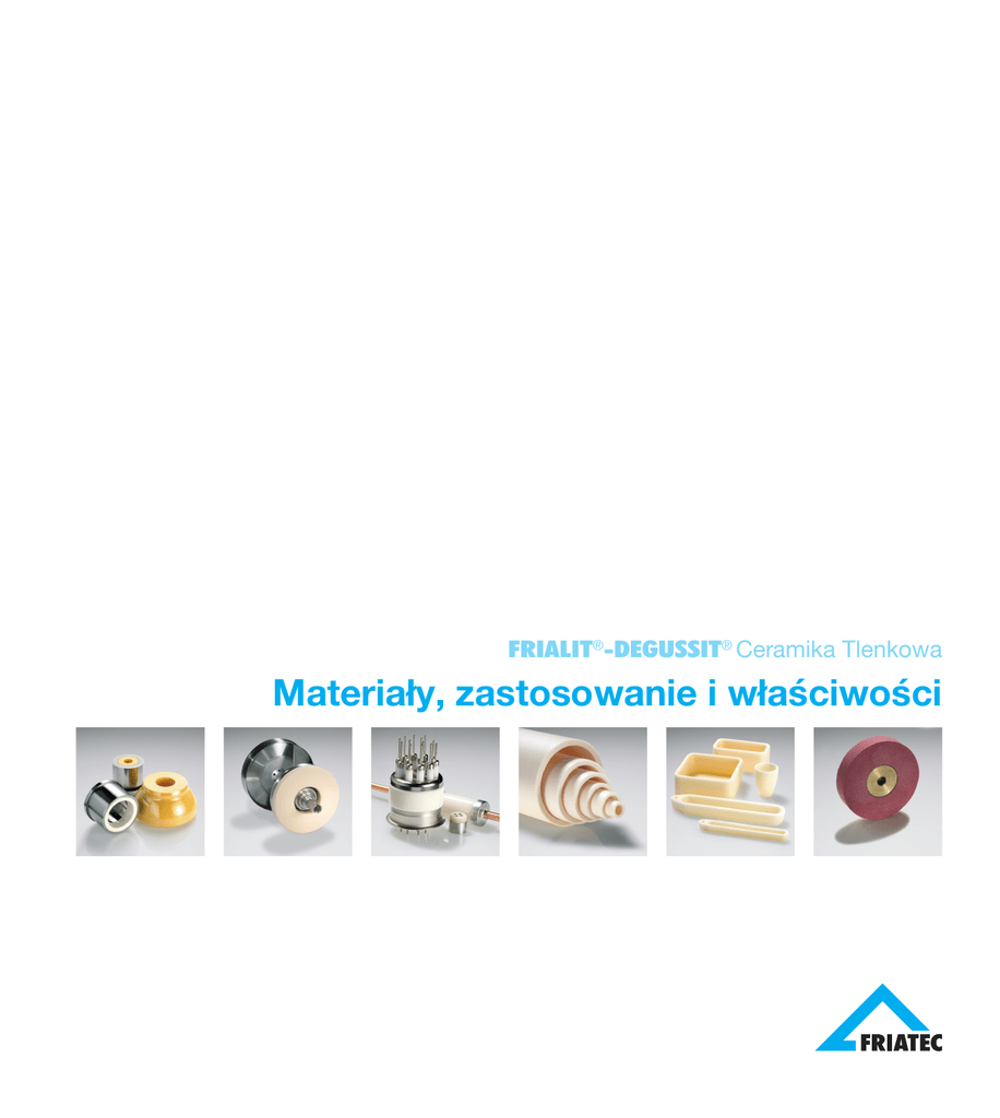 FRIALIT®-DEGUSSIT® Ceramika Tlenkowa Materiały, zastosowanie i właściwości Grupy i obszary zastosowania 02 – 03 Materiały i typowe zastosowania 04 – 05 Właściwości materiału 06 – 07 Grupy i obszary zastosowania Zaawansowana ceramika tlenkowa Frialit®-Degussit®, wraz z zespołem naszych doświadczonych technologów rozwiążą Twoje problemy. Im więcej wymogów stawia się naszym materiałom, tym bardziej przekonywujące stają się właściwości naszej ceramiki. Twój kontakt Globalna Sprzedaż Telefon: +49 621 486-1353 Sprzedaż Inżynierii Elektrycznej Telefon: +49 621 486-1366 Jesteśmy reprezentowani na całym świecie. Chętnie udostępnimy Ci kontakty do naszych zagranicznych partnerów. 02 FRIALIT®-DEGUSSIT® Oxide Ceramics Faks: +49 621 486-25 1353 Faks: +49 621 486-25 1366 Inżynieria elektryczna WW WW WW WW WW WW WW przepusty elektryczne i rury izolacyjne do urządzeń próżniowych sprzęt kontrolny do półprzewodników / fotowoltaiki aparatura do badań i rozwoju (akceleratory cząstek) elektronika wysokiej jakości elementy sond obudowy czujników technologia wydobywcza i lądowa (wysokie ciśnienia) Inżynieria mechaniczna WW WW WW WW WW WW WW WW WW WW Technologia Wysokotemperaturowa WW WW WW WW WW WW rury i pręty izolacyjne ochraniające i izolujące termopary, dla rur gazowych wlotowych i wylotowych rowkowane rury i rury grzewcze, podpory elementów grzejnych do pieców rury dyfuzyjne do przemysłu półprzewodników naczynia laboratoryjne m.in. tygle, łódeczki, tace, płyty do obróbki cieplnej i topienia w wysokich temperaturach tłoki do pomp dozujących nurniki do pomp wysokociśnieniowych pierścienie ślizgowe i uszczelnienia pomp tuleje ochronne i uszczelnienia wałów łożyska ślizgowe i łożyska toczne dysze prowadnice i szpule kształtki odporne na tarcie stożki i tuleje dla przewodów przemysłowych matryce prasujące Obróbka powierzchniowa WW drobne narzędzia do obróbki powierzchni np. osełki, pilniki, ściernice, tarcze ścierne do polerowania, docierania i gratowania metali, szkła i porcelany FRIALIT®-DEGUSSIT® Oxide Ceramics 03 Materiały i typowe zastosowania Materiał Właściwości Typowe zastosowania FRIALIT Czysty tlenek glinu Al2O3, gęsty, wyjątkowa Spasowane jednostki tłok / cylinder, łożyska F99,7 odporność na tarcie, korozję i bardzo dobre ślizgowe, wały i elementy zaworów (gniazda, właściwości elektroizolacyjne kule, płytki), przepusty elektryczne, ceramika FRIATEC Nazwa handlowa lutowana z metalami do izolatorów w technologii X-Ray i w akceleratorach cząstek, izolatory w ogniwach paliwowych, osłony czujników DEGUSSIT Czysty tlenek glinu Al2O3, gęsty, odporny na Narzędzia do precyzyjnej obróbki powierzchni DD57 tarcie, twardy, zwany także „sztuczny rubin”, twardych materiałów, osełki do noży. kolor czerwony DEGUSSIT Czysty tlenek glinu Al2O3, gęsty, doskonała Osłony termopar, elementy konstrukcyjne AL23 odporność na wysoką temperaturę, pieców, naczynia laboratoryjne m.in.: tygle, Al2O3 wytrzymałość elektryczna oraz odporność na łódeczki do spalań, płyty, okładziny reaktorów Tlenek glinu korozję, przeźroczysty dla mikrofal w przemyśle chemicznym, technologia mikrofalowa DEGUSSIT Czysty tlenek glinu Al2O3, lekko porowaty, Rury, naczynia laboratoryjne, konstrukcyjne AL24 dobra odporność na szok termiczny, ekstremal- elementy pieca na odporność na pełzanie DEGUSSIT Czysty tlenek glinu Al2O3, o dużej porowatości, Rury, naczynia laboratoryjne, konstrukcyjne AL25 dobra izolacja termiczna, najwyższa odporność elementy pieca na szok termiczny spośród wszystkich materiałów Al2O3 Al2O3 (+ZrO2) FRIALIT Tlenek glinu Al2O3 wzmocniony tlenkiem cyrko- Płyty drenażowe do produkcji papieru, Tlenek glinu, FZT nu ZrO2, gęsty, wysoka wytrzymałość mecha- przepływomierze elektromagnetyczne w drobnoziarnisty niczna, dobra odporność na szok termiczny, przemyśle chemicznym, kołki pozycjonujące w stabilizowany ekstremalna odporność na tarcie i korozję, przemyśle samochodowym drobne ziarna 04 FRIALIT®-DEGUSSIT® Oxide Ceramics Material Właściwości Typowe zastosowania FRIALIT Tlenek cyrkonu ZrO2 stabilizowany tlenkiem Nurniki wysokociśnieniowe, matryce do pras, FZM magnezu MgO, gęsty, wysoka wytrzymałość elementy młynów, puszki uszczelniające do mechaniczna i odporność na tarcie, wyjątkowa pomp magnetycznych, narzędzia do formo- odporność na korozję i szok termiczny wania metali DEGUSSIT Tlenek cyrkonu ZrO2 stabilizowany tlenkiem Tygle, miseczki do spalań, sondy lambda FZY itru Y2O3, wysoka odporność na korozję i FRIATEC Nazwa handlowa ZrO2 wytrzymałość temperaturowa, przepuszczalny Tlenek cyrkonu dla jonów tlenu FRIALIT Tetragonalny tlenek cyrkonu ZrO2 stabilizowany Elementy tnące, płyty ochronne przed FZM/K tlenkiem itru Y2O3, gęsty, bardzo mała wielkość ścieraniem ziaren, najwyższa wytrzymałość na zerwanie i odporność na tarcie SiC FRIALIT Węglik krzemu spiekany SSiC, wysoka Łożyska ślizgowe, pierścienie ślizgowe, tuleje Węglik krzemu SiC 198D wytrzymałość na tarcie, dobra odporność na ślizgowe, uszczelnienia korozję, doskonałe właściwości ślizgowe Si3N4 FRIALIT Wysokiej czystości azotek krzemu, wysoka Elementy formujące metal, rolki do wyoblania, Azotek krzemu HP 79 odporność na tarcie, doskonała wytrzymałość płyty na zginanie, najwyższa odporność na szok temperaturowy FRIALIT®-DEGUSSIT® Oxide Ceramics 05 Właściwości Materiałów Materiał Al2O3 Ceramika Tlenkowa FRIALIT DEGUSSIT DEGUSSIT DEGUSSIT DEGUSSIT FRIALIT F99,7 DD57 AL23 AL24 AL25 FZT g/cm3 3,90 - 3,95 3,70 - 3,80 3,70 - 3,95 3,40 - 3,60 2,80 - 3,10 4,05 - 4,15 Porowatość otwarta % 0 0 0 0-5 20 - 30 0 Wielkość ziaren µm 10 10 10 40 70 5 Twardość (Knoop, 100g) N/mm2 (MPa) 23 000 23 000 23 000 - - 20 000 Wytrzymałość na ściskanie N/mm2 (MPa) 3 500 3 000 3 500 1 000 300 3 000 Wytrzymałość na zginanie N/mm2 (MP