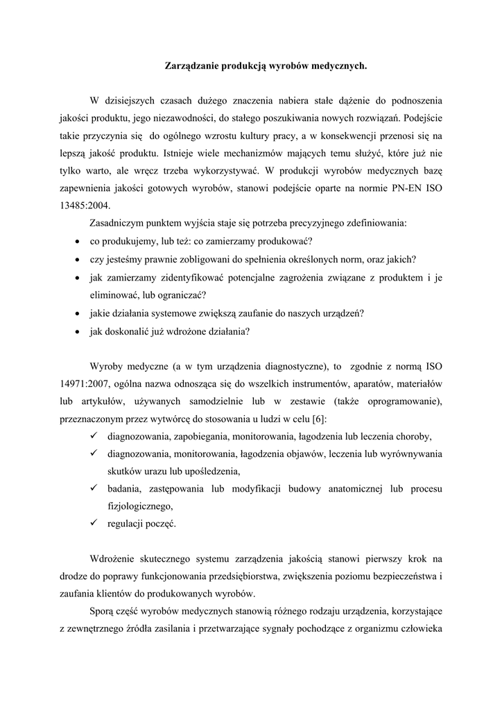 Zarządzanie produkcją wyrobów medycznych. W dzisiejszych czasach dużego znaczenia nabiera stałe dążenie do podnoszenia jakości produktu, jego niezawodności, do stałego poszukiwania nowych rozwiązań. Podejście takie przyczynia się do ogólnego wzrostu kultury pracy, a w konsekwencji przenosi się na lepszą jakość produktu. Istnieje wiele mechanizmów mających temu służyć, które już nie tylko warto, ale wręcz trzeba wykorzystywać. W produkcji wyrobów medycznych bazę zapewnienia jakości gotowych wyrobów, stanowi podejście oparte na normie PN-EN ISO 13485:2004. Zasadniczym punktem wyjścia staje się potrzeba precyzyjnego zdefiniowania: • co produkujemy, lub też: co zamierzamy produkować? • czy jesteśmy prawnie zobligowani do spełnienia określonych norm, oraz jakich? • jak zamierzamy zidentyfikować potencjalne zagrożenia związane z produktem i je eliminować, lub ograniczać? • jakie działania systemowe zwiększą zaufanie do naszych urządzeń? • jak doskonalić już wdrożone działania? Wyroby medyczne (a w tym urządzenia diagnostyczne), to zgodnie z normą ISO 14971:2007, ogólna nazwa odnosząca się do wszelkich instrumentów, aparatów, materiałów lub artykułów, używanych samodzielnie lub w zestawie (także oprogramowanie), przeznaczonym przez wytwórcę do stosowania u ludzi w celu [6]: 9 diagnozowania, zapobiegania, monitorowania, łagodzenia lub leczenia choroby, 9 diagnozowania, monitorowania, łagodzenia objawów, leczenia lub wyrównywania skutków urazu lub upośledzenia, 9 badania, zastępowania lub modyfikacji budowy anatomicznej lub procesu fizjologicznego, 9 regulacji poczęć. Wdrożenie skutecznego systemu zarządzenia jakością stanowi pierwszy krok na drodze do poprawy funkcjonowania przedsiębiorstwa, zwiększenia poziomu bezpieczeństwa i zaufania klientów do produkowanych wyrobów. Sporą część wyrobów medycznych stanowią różnego rodzaju urządzenia, korzystające z zewnętrznego źródła zasilania i przetwarzające sygnały pochodzące z organizmu człowieka na informację, lub oddziałujące w sposób czynny na ten organizm. Proces projektowania wyrobów poprzedza rozpoznanie potrzeb rynku medycznego, gromadzenie literatury specjalistycznej i zasięganie opinii fachowców. Projektant musi rozumieć istotę procesów zachodzących w organizmie człowieka, celem uwzględnienia ich w swoim projekcie. Całościowe gromadzenie wiedzy stanowi dane wejściowe do dalszego procesu projektowania. W niektórych przypadkach nie jest możliwe, by jednorazowo powstał kompletny projekt. Koniecznym może być sprawdzenie wielu różnych rozwiązań, zwłaszcza dotyczących punktów krytycznych. Stałym elementem rozważanym na każdym etapie jest bezpieczeństwo pacjenta i obsługi. Poszukiwanie najlepszego rozwiązania ma doprowadzić do powstania wyrobu prototypowego, które będzie poddawane szeregowi testów, badań klinicznych lub oceny klinicznej. Warto zauważyć, że pełny cykl pomiarowy opiera się na wykorzystaniu zasady sprzężenia zwrotnego, jako sposobu kontroli tego procesu. Istnieje tutaj pełna analogia do cyklu Deminga, który oparł się na tej powszechnej w przyrodzie zasadzie. Mamy więc łatwo dostrzegalny związek pomiędzy procesami zachodzącymi w urządzeniu pomiarowym, a procesami zachodzącymi w organizacji, która to urządzenie wytwarza. Systemowe zarządzanie jakością w produkcji wyrobów medycznych Dwoma głównymi organami, tworzącymi normy o zasięgu światowym, są: IEC (International Electrotechnical Commision) oraz ISO (International Standard Organization). IEC koncentruje się na normach w dziedzinie elektrotechniki i elektroniki. ISO zajmuje się normami z innych dziedzin. Swoją działalność opierają na komitetach technicznych, zapewniając im pomoc administracyjną i usługi sekretariatu, gromadząc do współpracy ekspertów. Wyniki ich prac publikowane są jako normy IEC lub normy ISO. Organizacje normalizacyjne Europy Zachodniej utworzyły CEN (Commite Europenne de Normalization) chcąc zapobiec, by normy Wspólnoty Europejskiej i normy EFTA (European Free Trade Agreement) nie były rozbieżne. Podział tematyki jest podobny do układu międzynarodowego; CEN obejmuje wszystkie dziedziny techniki, z wyjątkiem elektrotechniki, która należy do zakresu działania CENELEC. Wprowadzone procedury gwarantują, że normy są akceptowane zarówno jako europejskie, jak i jako międzynarodowe. Normy międzynarodowe i normy europejskie są drukowane i zatwierdzane jako normy krajowe. W 1985 r. zastosowano nowe podejście. Zgodnie z nowym artykułem 100a, wprowadzonym przez Akt Wspólnego Rynku, dyrektywy ustalają wyłącznie zasadnicze wymagania (bezpieczeństwa) i są podstawą dla prawa krajowego, natomiast szczegóły techniczne pozostawiono zharmonizowanym (z dyrektywą) normom europejskim. Zgodnie z nowym podejściem [1]: 1) harmonizacja prawa została ograniczona do wprowadzania do prawa krajowego wymagań zasadniczych; 2) przygotowanie pomocniczych wymagań technicznych pozostawiono organizacjom normalizacyjnym; 3) takie wymagania techniczne mają status norm dobrowolnych; 4) jednak władze krajowe zostały zobowiązane do traktowania wyrobów spełniających wymagania norm zharmonizowanych jako spełniających wymagania zasadnicze. Zarządzanie jakością w produkcji wyrobów medycznych, rządzi się właściwie tymi samymi prawami, co każda inna dziedzina działalności człowieka. Zatem co szczególnego wyróżnia tę branżę? Jest to bezpośredni związek z życiem i zdrowiem jednostki ludzkiej, wymagający wzmożonej czujności. Dlatego też zaleca się, by nawet do norm dobrowolnych podejść tak, jakby były one obowiązkowe. Działalność wspomnianych wyżej komitetów normalizacyjnych jest w tym świetle użyteczna, jasno wytycza kierunki działalności dla firm medycznych. Szczególnego znaczenia nabiera nadzorowanie prawidłowego funkcjonowania procesu p