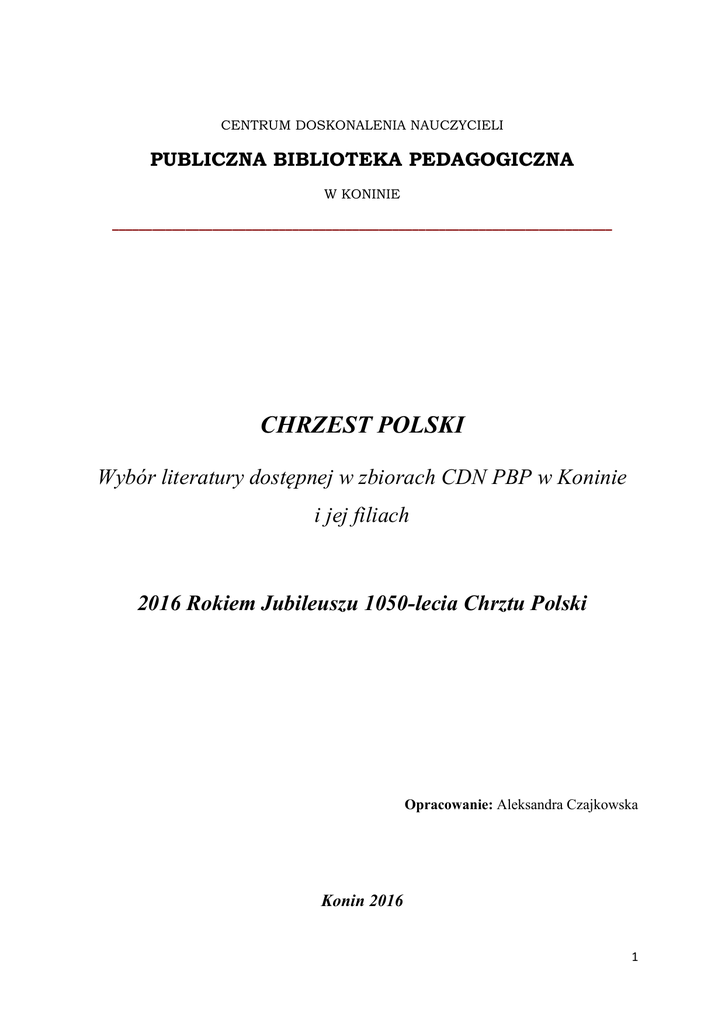 CENTRUM DOSKONALENIA NAUCZYCIELI PUBLICZNA BIBLIOTEKA PEDAGOGICZNA W KONINIE ___________________________________________________________________________ CHRZEST POLSKI Wybór literatury dostępnej w zbiorach CDN PBP w Koninie i jej filiach 2016 Rokiem Jubileuszu 1050-lecia Chrztu Polski Opracowanie: Aleksandra Czajkowska Konin 2016 1 UCHWAŁA SEJMU RZECZYPOSPOLITEJ POLSKIEJ z dnia 22 grudnia 2015 r. w sprawie ustanowienia roku 2016 Rokiem Jubileuszu 1050-lecia Chrztu Polski W 1050. rocznicę przyjęcia chrztu przez księcia Mieszka I Sejm Rzeczypospolitej Polskiej czci pamięć tego przełomowego w historii naszego Narodu wydarzenia. Chrzest władcy Polan i jego dworu, a w konsekwencji Chrzest Polski, odbył się w Wigilię Paschalną, 14 kwietnia 966 roku. Akt ten miał decydujące znaczenie dla procesu jednoczenia plemion polskich pod władzą Piastów i kształtowania się chrześcijańskiej tożsamości naszego Narodu. Św. Jan Paweł II w przemówieniu do polskich biskupów z 14 lutego 1998 roku tak mówił o znaczeniu przyjęcia chrztu: „Polska weszła w krąg kultury chrześcijańskiego Zachodu i zaczęła budować swą przyszłość na fundamencie Ewangelii. Od tamtych czasów staliśmy się pełnoprawnymi członkami europejskiej rodziny narodów ze wszystkimi wynikającymi z tego konsekwencjami. Wespół z innymi narodami Europy jesteśmy współtwórcami, a zarazem dziedzicami jej bogatej historii i kultury”. Obchodzone 50 lat temu w 1966 roku uroczystości „Sacrum Millennium Poloniae” były nie tylko masową demonstracją wiary, ale też wyrazem oporu wobec komunistycznej władzy. Stały się poprzez to kamieniem milowym na polskiej drodze do wolności. Sejm Rzeczypospolitej Polskiej ustanawia rok 2016 Rokiem Jubileuszu 1050-lecia Chrztu Polski. Wyraża także nadzieję, że rocznicowe obchody będą drogą pojednania i odbudowy wspólnoty w oparciu o ponadtysiącletnią tradycję chrześcijańską naszego Narodu. Marszałek Sejmu: M. Kuchciński W związku z Jubileuszem zapraszamy Państwa do zapoznania się z wykazem dostępnej w naszych zbiorach literatury oraz materiałów internetowych. 2 WYDAWNICTWA ZWARTE 1. 966. CHRZEST Polski / Krzysztof Ożóg ; sł. wstępne Andrzeja Dudy. - Kraków : Biały Kruk, 2015 Sygnatura: 99360 (Konin) Sygnatura: 29953 (Słupca) 2. CHRZEST Polski / Jerzy Dowiat. - Warszawa : Wiedza Powszechna, 1997 Sygnatura: 72287 (Konin) Sygnatura: 2340, 3584 (Słupca) Sygnatura: 2461, 2699 (Turek) 3. CHRZEST Polski i woja Mściwoja / Eliza Piotrowska. – Poznań : Wydawnictwo Miejskie Posnania, 2016 Sygnatura: 99635 (Konin) 4. DZIEJE chrześcijaństwa polskiego / Jerzy Kłoczowski. - Warszawa : Grupa Wydawnicza Bertelsmann Media : Świat Książki, 2000 Sygnatura: 73995 (Konin) 5. KRONIKA polska / Anonim tzw. Gall . - Wrocław : Zakład Narodowy im. Ossolińskich, 1968 i kolejne Sygnatura: 38322 – 38323, 8991; 92719, 89420 (Konin) Sygnatura: 21561 (Koło) Sygnatura: 3265, 5874 – 5875, 8987, 15220, 20031 (Słupca) Sygnatura: 15296 - 15297 (Turek) 6. KRONIKA Thietmara / z tekstu łac. przetł., wstępem poprzedził i koment. opatrzył Marian Zygmunt Jedlicki. - Poznań : Instytut Zachodni, 1953 Sygnatura: 5601 (Konin) 7. METRYKA chrztu Mieszka I i jej geneza / Jerzy Dowiat. - Warszawa : Państwowe Wydawnictwo Naukowe, 1961 Sygnatura: 3736 (Koło) Sygnatura: 2045 (Słupca) 8. MIESZKO Pierwszy / Jerzy Strzelczyk ; Wydział Kultury i Sztuki Urzędu Wojewódzkiego w Poznaniu. - Poznań : "Abos", 1992 Sygnatura: 27755 (Kolo) 9. MIESZKO I / Gerard Labuda. - Wrocław : Zakład Narodowy im. Ossolińskich, 2002 Sygnatura: 79430 (Konin) Sygnatura: 33332 (Koło) 10. MIESZKO I / Jerzy Strzelczyk. - Poznań : Wydawnictwo Poznańskie, 2013 Sygnatura: 99639 (Konin) Sygnatura: 29949 (Słupca) 11. MIESZKO I i jego czasy / Stanisław Rosik. - Wrocław : Wydawnictwo Dolnośląskie, 2001 Sygnatura: 29593 (Słupca) 3 12. MIESZKO I jako budowniczy państwa polskiego / Stanisław Zakrzewski. - Kraków : Universitas, 2006 Sygnatura: 86504 (Konin) 13. MIESZKO I ok. 930-992 / Andrzej F. Grabski. - Warszawa : Wydawnictwo Ministerstwa Obrony Narodowej, 1973 Sygnatura: 13496 (Turek) 14. OD CHRZTU do chrystianizacji : Polska, Ruś, Litwa / Marceli Kosman. - Warszawa : "Książka i Wiedza", 1992 Sygnatura: 60461(Konin) 15. POCZĄTKI chrześcijaństwa w Polsce / Bogusław Gierlach. - Warszawa : "Iskry", 1988 Sygnatura: 53390 - 53391 (Konin) Sygnatura: 29966 (Turek) 16. POCZĄTKI Polski : z dziejów Słowian w I tysiącleciu n.e.. [T. 5] / Henryk Łowmiański ; [oprac. graf.] Zygmunt Górnicki. - Warszawa : Państwowe Wydawnictwo Naukowe, 1973, s. 575-595 : Przyjęcie chrztu i początki organizacji kościelnej Sygnatura: 14553(Konin) Sygnatura: 11909 (Koło) 17. PIERWSZE państwo polskie / Gerard Labuda. - Kraków : Krajowa Agencja Wydawnicza, 1989 Sygnatura: 56275(Konin) Sygnatura: 20514 (Słupca) Sygnatura: 30869 (Turek) 18. POLSKA państwem średniowiecznej Europy / Jerzy Dowiat. - Warszawa : Państwowe Wydawnictwo Naukowe, 1968 Sygnatura: 9463 (Konin) Sygnatura: 4559 (Słupca) 19. Polska X-XI wieku / Stanisław Kętrzyński ; [oprac. i posł. Aleksander Gieysztor]. Warszawa : Państwowe Wydawnictwo Naukowe, 1961 Sygnatura: 4670 (Konin) 20. STOSUNEK prawny Polski do Cesarstwa do r. 1000 / Marian Zygmunt Jedlicki. Wyd. 2. - Wodzisław Śląski :Wydawnictwo Templum, 2011 Sygnatura: 29950 (Słupca) 21. STUDIA nad początkami państwa polskiego. T. 1 / Gerard Labuda; [przedm. Aleksander Gieysztor]. - Wyd. 2 poszerz. i uzup. - Poznań : Wydawnictwo Naukowe Uniwersytetu im. Adama Mickiewicza, 1987 [M.in. Przyjęcie chrztu przez Mieszka I w r. 966. Przyczyny i skutki ] Sygnatura: 49718 (Konin) Sygnatura: 24487 (Koło) Sygnatura: 18707 (Słupca) 4 22. STUDIA nad początkami państwa polskiego. T. 2 / Gerard Labuda. - Poznań : Wydawnictwo Naukowe Uniwersytetu im. Adama Mickiewicza, 1988 Sygnatura: 52042 (Konin) Sygnatura: 25215 (Koło) Sygnatura: 19409 (Słupca) Sygnatura: 29502 (T
