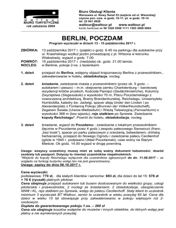 Biuro Obsługi Klienta BIURO TURYSTYCZNE rok założenia 2004 Warszawa ul. Nowy Świat 53 (wejście od ul. Wareckiej) czynne pon.-czw. w godz. 10-17, pt. w godz. 10-14 tel. 22 841 4928 [email protected] www.waltour.pl konto bankowe nr 50 1020 5558 1111 1393 3000 0004 ______________________________________________________________________________ BERLIN, POCZDAM Program wycieczki w dniach 13 - 15 października 2017 r. ZBIÓRKA: POWRÓT: NOCLEG: 13 października 2017 r. (piątek) o godz. 6.45 na parkingu dla autokarów przy ul. Krasińskiego wzdłuż jezdni prowadzącej z pl. Wilsona w kierunku Wisłostrady, wyjazd o godz. 7.00. 15 października 2017 r. (niedziela) ok. godz. 21.00 tamże. w Berlinie, pokoje 2-os. z łazienkami 1. dzień przejazd do Berlina, wstępny objazd krajoznawczy Berlina z przewodnikiem., zakwaterowanie w hotelu, obiadokolacja, nocleg. 2. dzień śniadanie, zwiedzanie miasta z przewodnikiem (przez ok. 5 godz. – autokarem i pieszo) – m.in. obejrzenie zamku Charlotenburg – barokowej rezydencji królów pruskich, Kościoła Pamięci (Gedächtniskirche), Kolumny Zwycięstwa (Siegessäule) o wysokości 70 m, Placu Poczdamskiego z nowoczesną architekturą, Bramy Brandenburskiej, Reichstagu, Uniwersytetu Humboldta, katedry św. Jadwigi, spacer aleją Under den Linden i po Alexanderplatz z Fontanną Pokoju (Brunnen der Völkerfreundschaft), Zegarem Świata (Urania-Weltzeituhr) i Wieżą Telewizyjną (Fernsehturm) o wysokości 368 m (bez wjazdu), rejs statkiem po Sprewie. Zwiedzanie kopuły Reichstagu*. Powrót do hotelu, obiadokolacja, nocleg. 3. dzień śniadanie, wyjazd do Poczdamu - zwiedzanie z lokalnym przewodnikiem (łącznie w Poczdamie przez 4 godz.) zespołu pałacowego Sanssouci (franc. „bez trosk”), spacer po parku pałacowym z oranżerią, belwederem, chińską herbaciarnią, przejazd do Nowego Ogrodu i zwiedzanie pałacu Cecilienhof (gdzie w 1945 r. podpisano Układ Poczdamski), czas wolny na Starym Mieście. Ok godz. 14.00 wyjazd w drogę powrotną. Uwaga: wszyscy uczestnicy muszą mieć ze sobą ważny dokument tożsamości: dowód osobisty lub paszport. Dotyczy to również uczestników niepełnoletnich. *Wejście do kopuły Reichstagu wyłącznie dla uczestników zgłoszonych do dn. 11.09.2017 – ze względu na funkcję budynku wstęp ten nie jest gwarantowany. Uwaga: zapisy do dnia 06.10.2017 r. Cena wycieczki: podstawowa: 770 zł, dla stałych klientów i seniorów: 693 zł, dla dzieci do lat 15: 578 zł + 70 € (ryczałt) płatnych pilotowi Cena obejmuje przejazd autokarem lub busem dostosowanym do wielkości grupy, usługi pilotarskie i przewodnickie, 2 noclegi ze śniadaniami, 2 obiadokolacje, ubezpieczenie NNW i KL, rejs statkiem po Sprewie, wstęp do pałacu Cecilienhoff. Stały klient to uczestnik minimum 3 wycieczek BT Waltour, senior to uczestnik w wieku powyżej 60 lat. Cena dla dzieci w wieku 15 lat obowiązuje przy zakwaterowaniu w pokoju większym niż 2osobowym. Dopłata do gwarantowanego pokoju 1.os. – 260 zł Cena nie obejmuje kosztów wstępów do muzeów i innych obiektów, do których wstęp jest płatny a nie wymienionych powyżej. Biuro Obsługi Klienta BIURO TURYSTYCZNE rok założenia 2004 Warszawa ul. Nowy Świat 53 (wejście od ul. Wareckiej) czynne pon.-czw. w godz. 10-17, pt. w godz. 10-14 tel. 22 841 4928 [email protected] www.waltour.pl konto bankowe nr 50 1020 5558 1111 1393 3000 0004 Zapisy, informacje: BT WALTOUR Warszawa ul. Nowy Świat 53 czynne w pon.-czw. w godz. 10-17, pt. w godz. 10-14. Rezerwacje telefoniczne pod nr tel. 22 841 4928 przyjmowane są w godzinach pracy Biura. Rezerwacje drogą mailową są ważne po potwierdzeniu dostępności miejsca przez Biuro. Rezerwacje bez wpłaty zaliczki są ważne o ile nie ustalono innego terminu przez 7 dni i w tym czasie należy wpłacić zaliczkę. Dopłaty należy dokonać najpóźniej na 21 przed wycieczką zagraniczną, na 14 dni przed wycieczką wielodniową krajową i na 7 dni przed wycieczką jednodniową krajową. W przypadku braku zaliczki bądź dopłaty w terminach ustalonych z Klientem, Biuro zastrzega sobie prawo do anulowania rezerwacji bez powiadamiania Klienta. Wpłat można dokonywać gotówką w siedzibie Biura lub przelewem na konto BT Waltour Zalecamy wykupienie u dowolnego ubezpieczyciela ubezpieczenia kosztów rezygnacji z uczestnictwa w imprezie turystycznej przed datą jej rozpoczęcia przez uczestnika z przyczyn od niego niezależnych. Zajmowanie miejsc w autokarze rozpoczyna się najwcześniej 15 min. przed odjazdem, wg kolejności wpłat. W przypadku niskiej frekwencji wycieczka może być odwołana. Biuro zastrzega sobie prawo do dokonywania drobnych zmian w programie w trakcie jego realizacji w tym zmiany kolejności odwiedzanych obiektów - wynikających z przyczyn niezależnych od Biura. O ostatecznej kolejności zwiedzania obiektów decyduje pilot/przewodnik prowadzący wycieczkę. Biuro nie gwarantuje wejścia do wnętrz wszystkich oglądanych obiektów. Pilot/przewodnik prowadzący wycieczkę nie oprowadza po ekspozycjach muzealnych. Biuro nie gwarantuje realizacji zgłoszeń dotyczących diet specjalistycznych przy organizacji posiłków będących w cenie wycieczki. Przy powrocie z wycieczki, w Warszawie, obowiązuje jeden przystanek dla wysiadających. Prosimy o zapoznanie się z informacjami organizacyjnymi dotyczącymi wycieczek. BT WALTOUR jest wpisane do Rejestru Organizatorów Turystyki i Pośredników Turystycznych Województwa Mazowieckiego pod numerem 740. SERDECZNIE ZAPRASZAMY