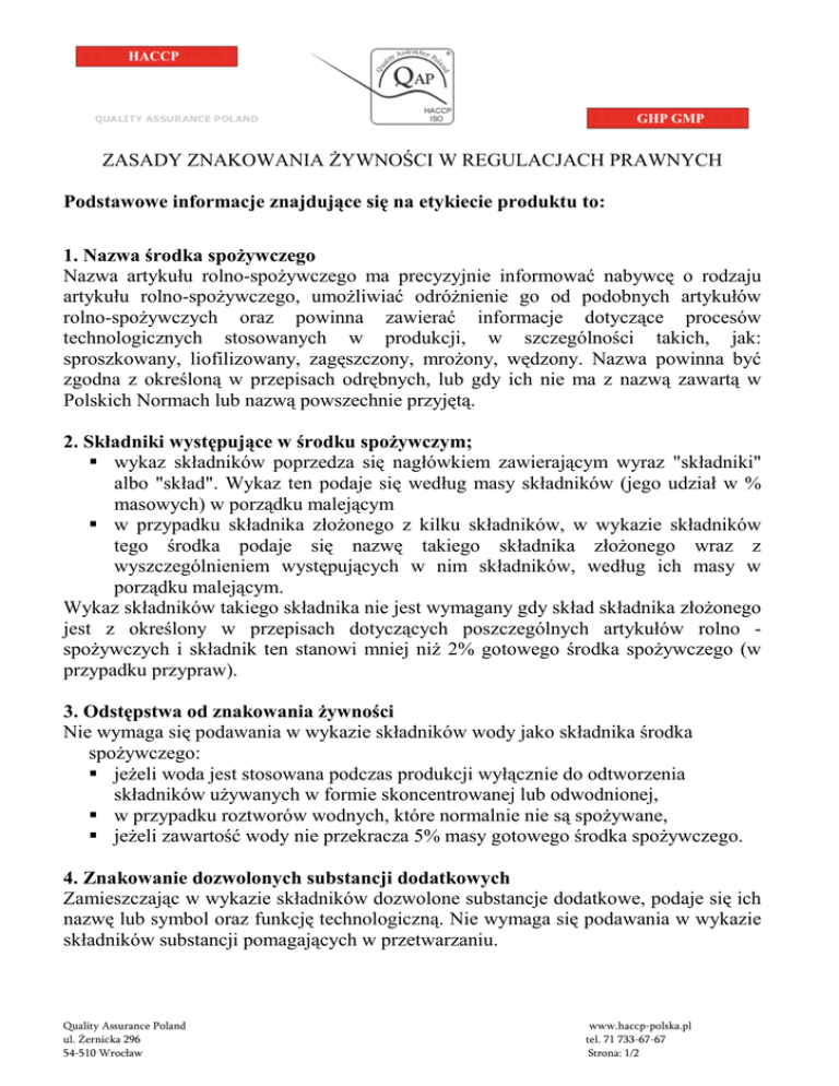 ZASADY ZNAKOWANIA ŻYWNOŚCI W REGULACJACH PRAWNYCH Podstawowe informacje znajdujące się na etykiecie produktu to: 1. Nazwa środka spożywczego Nazwa artykułu rolno-spożywczego ma precyzyjnie informować nabywcę o rodzaju artykułu rolno-spożywczego, umożliwiać odróżnienie go od podobnych artykułów rolno-spożywczych oraz powinna zawierać informacje dotyczące procesów technologicznych stosowanych w produkcji, w szczególności takich, jak: sproszkowany, liofilizowany, zagęszczony, mrożony, wędzony. Nazwa powinna być zgodna z określoną w przepisach odrębnych, lub gdy ich nie ma z nazwą zawartą w Polskich Normach lub nazwą powszechnie przyjętą. 2. Składniki występujące w środku spożywczym; wykaz składników poprzedza się nagłówkiem zawierającym wyraz "składniki" albo "skład". Wykaz ten podaje się według masy składników (jego udział w % masowych) w porządku malejącym w przypadku składnika złożonego z kilku składników, w wykazie składników tego środka podaje się nazwę takiego składnika złożonego wraz z wyszczególnieniem występujących w nim składników, według ich masy w porządku malejącym. Wykaz składników takiego składnika nie jest wymagany gdy skład składnika złożonego jest z określony w przepisach dotyczących poszczególnych artykułów rolno spożywczych i składnik ten stanowi mniej niż 2% gotowego środka spożywczego (w przypadku przypraw). 3. Odstępstwa od znakowania żywności Nie wymaga się podawania w wykazie składników wody jako składnika środka spożywczego: jeżeli woda jest stosowana podczas produkcji wyłącznie do odtworzenia składników używanych w formie skoncentrowanej lub odwodnionej, w przypadku roztworów wodnych, które normalnie nie są spożywane, jeżeli zawartość wody nie przekracza 5% masy gotowego środka spożywczego. 4. Znakowanie dozwolonych substancji dodatkowych Zamieszczając w wykazie składników dozwolone substancje dodatkowe, podaje się ich nazwę lub symbol oraz funkcję technologiczną. Nie wymaga się podawania w wykazie składników substancji pomagających w przetwarzaniu. Quality Assurance Poland ul. Żernicka 296 54-510 Wrocław www.haccp-polska.pl tel. 71 733-67-67 Strona: 1/2 5. Data minimalnej trwałości albo termin przydatności do spożycia; Datę minimalnej trwałości w oznakowaniu środka spożywczego podaje się, określając w kolejności dzień, miesiąc i rok, z tym że w przypadku środków spożywczych o trwałości: nie przekraczającej 3 miesięcy można podać jedynie dzień i miesiąc; od 3 do 18 miesięcy można podać jedynie miesiąc i rok; powyżej 18 miesięcy można podać jedynie rok. 6. Sposób przygotowania środków spożywczych Sposób przygotowania lub stosowania, jeżeli brak tej informacji mógłby spowodować niewłaściwe postępowanie ze środkiem spożywczym; 7. Dane producenta lub podmiotu wprowadzającego żywność do obrotu: producenta środka spożywczego lub wprowadzającego środek spożywczy do obrotu w kraju, kraj, w którym wyprodukowano środek spożywczy lub w którym dokonano przetworzenia zmieniającego właściwości środka spożywczego, w przypadku gdy brak tej informacji mógłby wprowadzić konsumenta w błąd; 8. Podstawowe definicje paczkujący –zgodnie z ustawą rozumie się przedsiębiorcę który odmierza porcje produktu, umieszcza je w opakowaniu jednostkowym i wprowadza towar paczkowany do obrotu po raz pierwszy; dla potrzeb ustawy przedsiębiorca wprowadzający na polski obszar celny towary paczkowane, zwany "importerem", traktowany jest jako paczkujący, towar paczkowany - produkt przeznaczony do sprzedaży, umieszczony w opakowaniu jednostkowym dowolnego rodzaju, którego deklarowana ilość, odmierzona bez udziału nabywcy, nie może zostać zmieniona bez otworzenia, uszkodzenia lub wyraźnego naruszenia opakowania. Quality Assurance Poland ul. Żernicka 296 54-510 Wrocław www.haccp-polska.pl tel. 71 733-67-67 Strona: 2/2