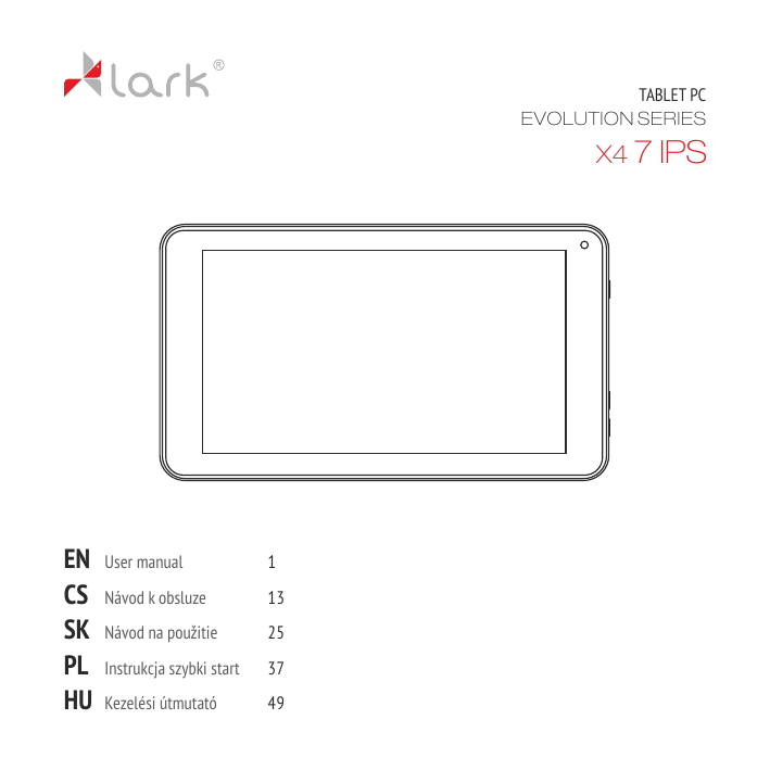 TABLET PC EVOLUTION SERIES X4 7 IPS EN CS SK PL HU User manual 1 Návod k obsluze 13 Návod na použitie 25 Instrukcja szybki start 37 Kezelési útmutató 49 Before you begin Thank you for choosing Lark Evolution X4 7 IPS tablet . We wish you many satisfaction from its use. Tablet PC is a multi-functional device, which can be used for work and education and for entertainment as well. Thanks to the tablet you have the Internet always in your reach, without need of bulky personal computers of previous generation. Android 4.4 KitKat and Google Play enable access to plenty of useful applications, for both business and entertainment purposes. Clear and intuitive interface gives you the pleasure of dailyuse of the tablet. Please read the user guide and keep it for further reference.The user guide contains important information regarding safe and effective use of the tablet. The producer mayintroduce changes in the device and the user guide. Please refer to the www.lark.com.pl website in case of questions or doubts concerning use of the device. 1 Before you begin Safetyand handling Prevent your tablet and accessories from getting wet. Getting electrical equipment wet not only causes serious damage, but it is also a threat to the user (risk of electric shock). Protect your device against shocks, falls and vibrations. Protect the device from high and low temperatures. Do not drop, bend, puncture, insert foreign objects, or place heavyobjects on your tablet. Do not use unauthorized accessories, as the maydamage the tablet and void manufacturer's warranty. Important safetyinstructions Be sure to follow instructions bellow. Make sure that theyare known to all users of your tablet, including children.. Never use your tablet while driving. Hospitals and other medical facilities may be prohibited from using electronic devices, including tablets. Always follow these restrictions. Turn off the tablet in the plane for the whole flight or during take-off and landing, according to the instructions given bythe aircraft personnel. Switch off the device near important electronic devices, which could be disrupted bypossible interference. Do not attempt to disassemble, modifyor repair the tablet. Always entrust these tasks to authorized specialist. Protect your tablet from strong magnetic fields.These fields can damage magnetic storage media. Do not use the tablet in veryhigh temperatures or in areas at high risk of fire or explosion, such as petrol stations. 2 Before you begin Supervise the use of the device bychildren, do not let them playwith the tablet unattended. Prevent the tablet from getting wet, for instance do not use or store it in the bathroom. The symbol to the left means that according to European Union laws and regulations your product and/or its battery shall be disposed of separately from household waste. When this product reaches its end of life, take it to a collection point designated by local authorities. The separate collection and recycling of your product and/or its battery at the time of disposal will help conserve natural resources and ensure that it is recycled in a manner that protects human health and the environment. 3 Product overview Parts and buttons of the device 2 1 1. Touch screen 2. Front camera 4 Product overview 3 6 7 8 9 10 5 4 3. Speaker 7. 4. RESET button 8. Micro USB port 5. MicroSD card slot 9. Power adapter port 6. Power ON/OFF button 10. Volume up / Volume down 5 Earphone jack Getting started Battery charging Please charge the battery before first use. 1. Connect Table to the AC charger, and the charger to AC power outlet. 2. Check charging lights. Red light means that device is charging, green that the charge has been completed. ATTENTION! The battery will fully charge in around 4 hours. Using the device during charging will make charging process longer. Disconnect the ac charger from your tablet when the battery power is full or when you wish to stop the charging. You can only use identical battery as a replacement. Physical damages to the battery may cause a fire or electric shock. 6 Using your tablet Buttons functions Power button - press and hold for a few seconds to turn on the device Volume UP - press and hold Volume Up button to increase the volume Volume Down - press and hold Volume Down button to decrease the volume Powering on/off the device Turning on After pressing and holding the ON/OFF button for 2 seconds the start screen will appear. Turning off To turn off the device press and hold the ON/OFF button for 2 seconds. Locking the screen To unlock the screen swipe the lock icon upwards 7 Using your tablet Multi-touch screen Never before have the use of an electronic device was so easy and natural. The screen responds to even gentle brush, understand a few fingers touch applied simultaneously, eg. 'pinching' shrink the image, and spreading the fingers apart-expand it. You can rotate the image with two fingers, like a piece of paper on the table. The capacitive touch screen is also indispensable for gaming use. Using the multitouch screen Tap gently on the screen with your fingertip to launch an application, select an item, open a menu, or type text using the onscreen keyboard. Touch The device is operated by touching appropriate place on the screen. Swipe or slide Move your finger in a vertical or horizontal direction on the screen to scroll through the content. Drag Touch, hold and drag an item to the desired position. Rotate the screen The tablet has a built-in motion sensor that supports the screen auto-rotation feature. By default, this feature is enabled. When you rotate the tablet, the screen automatically rotates to landscape or portrait view which is very convenient during internet browsing, watching the movies, pictures, etc. Navigating through the screens Home screen surface is greater than the display surface, so it is possible to affix the more shortcuts, applications and widgets. Switching between home screen pages is possible by dragging th