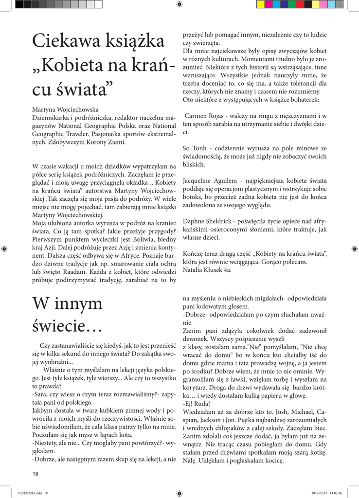 Ciekawa książka „Kobieta na krańcu świata” przeżyć lub pomagać innym, niezależnie czy to ludzie czy zwierzęta. Dla mnie najciekawsze były opisy zwyczajów kobiet w różnych kulturach. Momentami trudno było je zrozumieć. Niektóre z tych historii są wstrząsające, inne wzruszające. Wszystkie jednak nauczyły mnie, że trzeba doceniać to, co się ma, a także tolerancji dla rzeczy, których nie znamy i czasem nie rozumiemy. Oto niektóre z występujących w książce bohaterek: Martyna Wojciechowska Dziennikarka i podróżniczka, redaktor naczelna ma- Carmen Rojas - walczy na ringu z mężczyznami i w gazynów National Geographic Polska oraz National ten sposób zarabia na utrzymanie siebie i dwójki dzieGeographic Traveler. Pasjonatka sportów ekstremal- ci. nych. Zdobywczyni Korony Ziemi. So Tonh - codziennie wyrusza na pole minowe ze świadomością, że może już nigdy nie zobaczyć swoich W czasie wakacji u moich dziadków wypatrzyłam na bliskich. półce serię książek podróżniczych. Zaczęłam je przeglądać i moją uwagę przyciągnęła okładka ,, Kobiety Jacqueline Aguilera - najpiękniejsza kobieta świata na krańcu świata’’ autorstwa Martyny Wojciechow- poddaje się operacjom plastycznym i wstrzykuje sobie skiej .Tak zaczęła się moja pasja do podróży. W wiele botoks, bo przecież żadna kobieta nie jest do końca miejsc nie mogę pojechać, tam zabierają mnie książki zadowolona ze swojego wyglądu. Martyny Wojciechowskiej. Moja ulubiona autorka wyrusza w podróż na kraniec Daphne Sheldrick - poświęciła życie opiece nad afryświata. Co ją tam spotka? Jakie przeżyje przygody? kańskimi osieroconymi słoniami, które traktuje, jak Pierwszym punktem wycieczki jest Boliwia, biedny własne dzieci. kraj Azji. Dalej podróżuje przez Azję i zmienia kontynent. Dalsza część odbywa się w Afryce. Poznaje bar- Kończę teraz drugą część ,,Kobiety na krańcu świata’’, dzo dziwne tradycje jak np. smarowanie ciała ochrą która jest równie wciągająca. Gorąco polecam. lub święto Raadam. Każda z kobiet, które odwiedzi Natalia Kłusek 4a. próbuje podtrzymywać tradycję, zarabiać na to by W innym świecie… Czy zastanawialiście się kiedyś, jak to jest przenieść się w kilka sekund do innego świata? Do zakątka swojej wyobraźni... Właśnie o tym myślałam na lekcji języka polskiego. Jest tyle książek, tyle wierszy... Ale czy to wszystko to prawda? -Sara, czy wiesz o czym teraz rozmawialiśmy?- zapytała pani od polskiego. Jakbym dostała w twarz kubkiem zimnej wody i powróciła z moich myśli do rzeczywistości. Właśnie sobie uświadomiłam, że cała klasa patrzy tylko na mnie. Poczułam się jak mysz w łapach kota. -Niestety, ale nie... Czy mogłaby pani powtórzyć?- wyjąkałam. -Dobrze, ale następnym razem skup się na lekcji, a nie na myśleniu o niebieskich migdałach- odpowiedziała pani lodowatym głosem. -Dobrze- odpowiedziałam po czym słuchałam uważnie. Zanim pani zdążyła cokolwiek dodać zadzwonił dzwonek. Wszyscy pośpiesznie wyszli z klasy, zostałam sama."Nie" pomyślałam, "Nie chcę wracać do domu" bo w końcu kto chciałby iść do domu gdzie mama i tata prowadzą wojnę, a ja jestem po środku? Dobrze wiem, że mnie to nie ominie. Wygramoliłam się z ławki, wzięłam torbę i wyszłam na korytarz. Droga do drzwi wydawała się bardzo krótka… i wtedy dostałam kulką papieru w głowę. -Ej! Ruda! Wiedziałam aż za dobrze kto to. Josh, Michael, Caspian, Jackson i Jon. Piątka najbardziej zarozumiałych i wrednych chłopaków z całej szkoły. Zaczęłam biec. Zanim zdołali coś jeszcze dodać, ja byłam już na zewnątrz. Nie tracąc czasu pobiegłam do domu. Gdy stałam przed drzwiami spotkałam moją szarą kotkę, Nalę. Uklękłam i pogłaskałam kocicę. 18 1-2012-2013.indd 18 2013-01-17 14:03:16