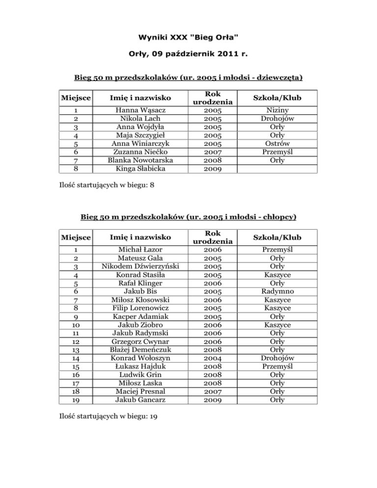 Wyniki XXX "Bieg Orła" Orły, 09 październik 2011 r. Bieg 50 m przedszkolaków (ur. 2005 i młodsi - dziewczęta) Miejsce Imię i nazwisko 1 2 3 4 5 6 7 8 Hanna Wąsacz Nikola Lach Anna Wojdyła Maja Szczygieł Anna Winiarczyk Zuzanna Niećko Blanka Nowotarska Kinga Słabicka Rok urodzenia 2005 2005 2005 2005 2005 2007 2008 2009 Szkoła/Klub Niziny Drohojów Orły Orły Ostrów Przemyśl Orły Ilość startujących w biegu: 8 Bieg 50 m przedszkolaków (ur. 2005 i młodsi - chłopcy) Miejsce Imię i nazwisko 1 2 3 4 5 6 7 8 9 10 11 12 13 14 15 16 17 18 19 Michał Łazor Mateusz Gala Nikodem Dźwierzyński Konrad Stasiła Rafał Klinger Jakub Bis Miłosz Kłosowski Filip Lorenowicz Kacper Adamiak Jakub Ziobro Jakub Radymski Grzegorz Cwynar Błażej Demeńczuk Konrad Wołoszyn Łukasz Hajduk Ludwik Grin Miłosz Laska Maciej Presnal Jakub Gancarz Ilość startujących w biegu: 19 Rok urodzenia 2006 2005 2005 2005 2006 2005 2006 2005 2005 2006 2006 2006 2008 2004 2008 2008 2008 2007 2009 Szkoła/Klub Przemyśl Orły Orły Kaszyce Orły Radymno Kaszyce Kaszyce Orły Kaszyce Orły Orły Orły Drohojów Przemyśl Orły Orły Orły Orły Bieg 400 m dziewcząt (ur. 03-04 kl. I-II) Miejsce Nazwisko i imię 1 2 3 4 5 6 7 8 9 10 11 12 13 14 15 16 17 18 19 20 Martyna Stachniak Karolina Flader Martyna Strzelec Zuzanna Wielgosz Natalia Sobolewska Julia Gorzelnik Aleksandra Bazan Martyna Hajduk Weronika Pelc Martyna Szczygieł Marlena Kuliga Natalia Wołoszyn Gabriela Grędus Kamila Sus Aleksandra Dobosz Zuzanna Kotowicz Natalia Kowalska Andżelika Słabicka Nela Szmuc Wiktoria Madejowska Rok urodzenia 2003 2003 2003 2004 2003 2003 2003 2004 2003 2004 2004 2004 2003 2003 2003 2003 2003 2004 2004 2004 Szkoła/Klub S.P. nr 4 Przemyśl S.P. nr 4 Przemyśl S.P. nr 6 Przemyśl S.P. Niziny S.P. Niziny S.P. nr 6 Przemyśl S.P. Radymno S.P. nr 4 Przemyśl S.P. Małkowice S.P. Kaszyce Halicz Ustrzyki Dolne S.P. Drohojów S.P. Niziny S.P. Zadąbrowie S.P. Orły S.P. Orły S.P. Trójczyce S.P. Orły S.P. Orły S.P. Orły Ilość startujących w biegu: 20 Bieg 400 m chłopców (ur. 03-04 kl. I-II) Miejsce Imię i nazwisko 1 Hubert Świecarz Rok urodzenia 2003 2 Antoni Iglantowicz 2003 3 4 5 6 7 8 9 10 11 12 13 14 15 16 17 18 Gabriel Hołyszko Maciej Grabowski Michał Koba Marcin Wąsacz Damian Samborski Jakub Barszczak Tobiasz Lorenowicz Mateusz Trojnar Gracjan Czapla Rafał Burbyło Arkadiusz Winiarczyk Jakub Masternak Miłosz Demeńczuk Cyprian Kapłon Jakub Zwoliński Miłosz Sait 2003 2004 2003 2003 2003 2003 2003 2004 2003 2003 2003 2003 2003 2004 2004 2004 Szkoła/Klub S.P. Radymno UKS SzkłoKorzeniowski S.P. Drohojów S.P. Kaszyce S.P. Orły S.P. Niziny S.P. Radymno S.P. Małkowice S.P. Trójczyce S.P. nr 14 Przemyśl S.P. Trójczyce S.P. Radymno S.P. Ostrów S.P. Orły S.P. Orły S.P. Niziny S.P. nr 15 Przemyśl S.P. Zadąbrowie 19 20 21 22 Michał Cwynar Michał Piwiński Mateusz Śliwiński Norbert Baran 2004 2003 2003 2004 S.P. Orły S.P. Trójczyce S.P. nr 2 Przemyśl S.P. Kaszyce Ilość startujących w biegu: 22 Bieg 500 m dziewcząt (ur. 01-02 kl. III-IV) Miejsce Imię i nazwisko 1 2 3 4 5 6 7 8 9 10 11 12 13 14 15 16 17 18 19 20 21 22 23 24 25 26 27 28 29 30 31 Weronika Kołek Monika Kotlińska Magdalena Golec Emilia Grabowska Julia Warecka Aleksandra Kawecka Wiktoria Picur Julia Lula Natalia Brzezicka Sara Szlachta Monika Karuś Paulina Ilba Martyna Presnal Klaudia Laska Aleksandra Szałyga Marlena Kucab Agnieszka Bereźnicka Karolina Hendzel Justyna Wojtanowska Agata Zacharko Aleksandra Matwijczak Ewa Czternastek Aleksandra Bereźnicka Aleksandra Kukurska Martyna Kordiak Ewelina Gomułczak Sara Ustianowska Aleksandra Stachiak Wiktoria Cioch Emilia Wrona Marlena Niebylska Ilość startujących w biegu: 31 Rok Szkoła/Klub urodzenia 2002 MOSiR Krosno 2001 S.P. Miękisz Stary 2002 S.P. Trójczyce 2002 S.P. Kaszyce 2001 S.P. nr 4 Przemyśl 2001 S.P. nr 4 Przemyśl 2001 S.P. Kaszyce 2001 S.P. nr 4 Przemyśl 2001 S.P. Kaszyce 2001 S.P. nr 4 Przemyśl 2001 S.P. Zadąbrowie 2001 S.P. Walawa 2002 S.P. Drohojów 2001 S.P. Orły 2001 S.P. Orły 2002 S.P. Małkowice 2002 S.P. Zadąbrowie 2001 S.P. Kaszyce 2001 S.P. Buszkowice 2001 S.P. nr 5 Przemyśl 2001 S.P. Radymno 2001 S.P. Radymno 2002 S.P. Zadąbrowie 2002 S.P. nr 4 Przemyśl 2002 S.P. Małkowice 2001 S.P. Kaszyce 2002 Muzyczna w Przemyślu 2001 S.P. nr 4 Przemyśl 2001 S.P. Trójczyce 2002 S.P. Małkowice 2002 S.P. Orły Bieg 500 m chłopców (ur. 01-02 kl. III-IV) Miejsce Imię i nazwisko 1 2 3 4 5 6 7 8 9 10 11 12 13 14 15 16 17 18 19 20 21 22 23 24 25 26 27 28 29 30 31 32 33 34 35 Michał Pawlików Krystian Korzeń Kacper Wielgosz Dawid Ferenc Krystian Babiarz Paweł Stachyra Adrian Starzyk Adrian Łakomczak Daniel Grzegorzak Arkadiusz Hanas Norbert Krupiński Szymon Pęcak Wojciech Droński Tomasz Hołub Gabriel Rzepski Michał Niemiec Kacper Hundz Kamil Łysik Jakub Pelc Adrian Krupiński Patryk Peszko Gracjan Brzezicki Hubert Ratuszniak Jakub Wołoszyn Krystian Makuła Patryk Wywrot Dominik Grabowski Dominik Szmuc Olaf Szczygieł Krzysztof Woś Kamil Leja Jakub Sowa Filip Piestrak Konrad Gac Jakub Jawniak Rok urodzenia 2001 2001 2001 2001 2001 2001 2001 2001 2001 2001 2001 2001 2001 2002 2001 2001 2001 2002 2001 2001 2001 2002 2001 2001 2001 2001 2002 2002 2002 2001 2002 2001 2002 2001 2001 Szkoła/Klub S.P. nr 4 Przemyśl S.P. Radymno S.P. Niziny S.P. Orły S.P. Małkowice S.P. Wyszatyce S.P. nr 4 Przemyśl S.P. Niziny S.P. Kaszyce S.P. Radymno S.P. Radymno S.P. Buszkowice S.P. Niziny S.P. Kaszyce S.P. Walawa S.P. Drohojów S.P. Drohojów S.P. Zadąbrowie S.P. Małkowice S.P. Radymno S.P. Niziny S.P. Kaszyce S.P. Trójczyce S.P. Drohojów S.P. Drohojów S.P. nr 15 Przemyśl S.P. Trójczyce S.P. Orły S.P. Orły S.P. Drohojów S.P. Drohojów S.P. Zadąbrowie S.P. Małkowice S.P. Drohojów S.P. Niziny Ilość startujących w biegu: 35 Bieg 900 m dziewcząt (ur. 99-00 kl. V-VI) Miejsce Imię i nazwisko 1 2 3 Gabriela Sidor Angelika Semerko Weronik