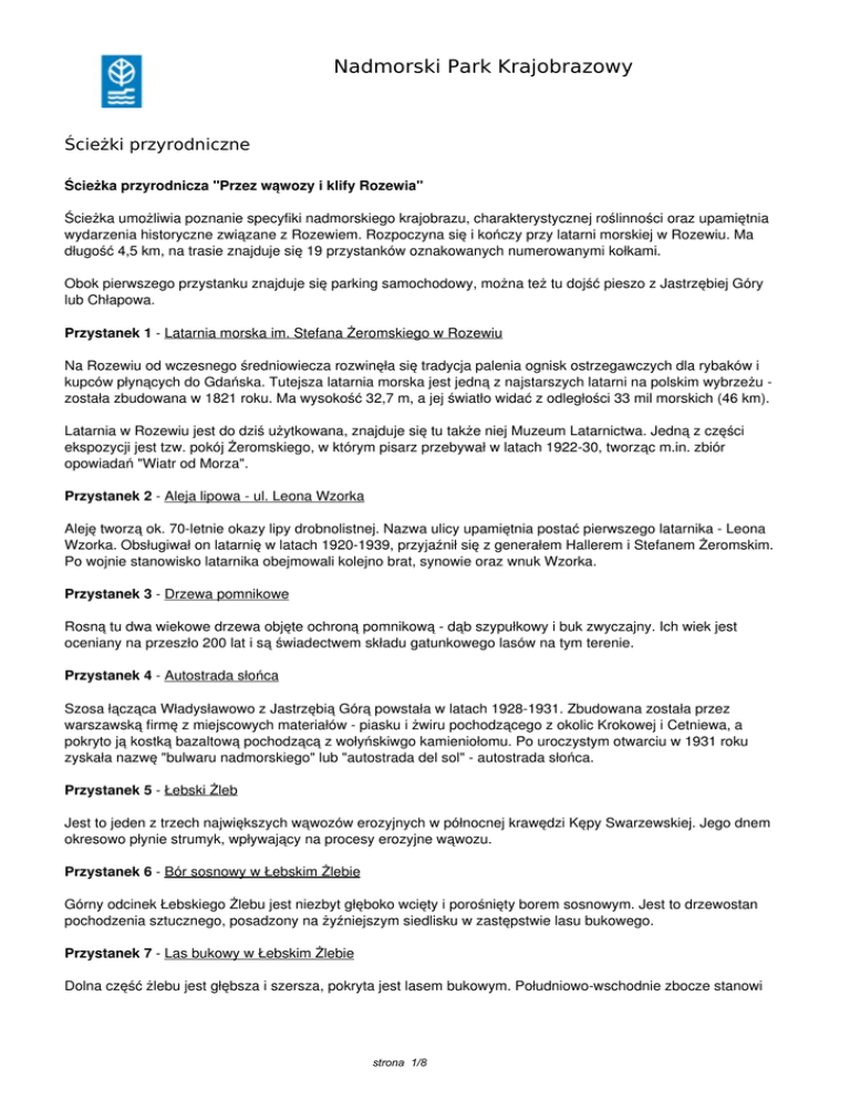 Nadmorski Park Krajobrazowy Ścieżki przyrodniczne Ścieżka przyrodnicza "Przez wąwozy i klify Rozewia" Ścieżka umożliwia poznanie specyfiki nadmorskiego krajobrazu, charakterystycznej roślinności oraz upamiętnia wydarzenia historyczne związane z Rozewiem. Rozpoczyna się i kończy przy latarni morskiej w Rozewiu. Ma długość 4,5 km, na trasie znajduje się 19 przystanków oznakowanych numerowanymi kołkami. Obok pierwszego przystanku znajduje się parking samochodowy, można też tu dojść pieszo z Jastrzębiej Góry lub Chłapowa. Przystanek 1 - Latarnia morska im. Stefana Żeromskiego w Rozewiu Na Rozewiu od wczesnego średniowiecza rozwinęła się tradycja palenia ognisk ostrzegawczych dla rybaków i kupców płynących do Gdańska. Tutejsza latarnia morska jest jedną z najstarszych latarni na polskim wybrzeżu została zbudowana w 1821 roku. Ma wysokość 32,7 m, a jej światło widać z odległości 33 mil morskich (46 km). Latarnia w Rozewiu jest do dziś użytkowana, znajduje się tu także niej Muzeum Latarnictwa. Jedną z części ekspozycji jest tzw. pokój Żeromskiego, w którym pisarz przebywał w latach 1922-30, tworząc m.in. zbiór opowiadań "Wiatr od Morza". Przystanek 2 - Aleja lipowa - ul. Leona Wzorka Aleję tworzą ok. 70-letnie okazy lipy drobnolistnej. Nazwa ulicy upamiętnia postać pierwszego latarnika - Leona Wzorka. Obsługiwał on latarnię w latach 1920-1939, przyjaźnił się z generałem Hallerem i Stefanem Żeromskim. Po wojnie stanowisko latarnika obejmowali kolejno brat, synowie oraz wnuk Wzorka. Przystanek 3 - Drzewa pomnikowe Rosną tu dwa wiekowe drzewa objęte ochroną pomnikową - dąb szypułkowy i buk zwyczajny. Ich wiek jest oceniany na przeszło 200 lat i są świadectwem składu gatunkowego lasów na tym terenie. Przystanek 4 - Autostrada słońca Szosa łącząca Władysławowo z Jastrzębią Górą powstała w latach 1928-1931. Zbudowana została przez warszawską firmę z miejscowych materiałów - piasku i żwiru pochodzącego z okolic Krokowej i Cetniewa, a pokryto ją kostką bazaltową pochodzącą z wołyńskiwgo kamieniołomu. Po uroczystym otwarciu w 1931 roku zyskała nazwę "bulwaru nadmorskiego" lub "autostrada del sol" - autostrada słońca. Przystanek 5 - Łebski Żleb Jest to jeden z trzech największych wąwozów erozyjnych w północnej krawędzi Kępy Swarzewskiej. Jego dnem okresowo płynie strumyk, wpływający na procesy erozyjne wąwozu. Przystanek 6 - Bór sosnowy w Łebskim Żlebie Górny odcinek Łebskiego Żlebu jest niezbyt głęboko wcięty i porośnięty borem sosnowym. Jest to drzewostan pochodzenia sztucznego, posadzony na żyźniejszym siedlisku w zastępstwie lasu bukowego. Przystanek 7 - Las bukowy w Łebskim Żlebie Dolna część żlebu jest głębsza i szersza, pokryta jest lasem bukowym. Południowo-wschodnie zbocze stanowi strona 1/8 granicę rezerwatu "Przylądek Rozewski". Przystanek 8 - Ujście strumyka do morza Strumyk ma długość kilkuset metrów, do ujścia pokonuje 50 metrów różnicy poziomów. Przy silnych opadach strumyk przyjmuje formę warkoczowego cieku o przeplatających się ramionach. Przystanek 9 - Opaska betonowa chroniąca klif Przylądek Rozewski od wieków podlegał intensywnej abrazji. Dawny brzeg morski w tym miejscu sięgał zapewne kilka kilometrów dalej na północ. W 1927 roku zbudowano betonową opaskę o długości ok. 800 m, od tego czasu klif stał się martwy - przestał się cofać. Jest to również miejsce ważne dla historii Polski - odbyły się tu dwie bitwy morskie floty gdańskiej z okrętami krzyżackimi, przymusowe lądowanie króla Zygmunta III Wazy (1598) oraz lądowanie wojsk szwedzkich w okresie "potopu". Przystanek 10 - Bukowy las pomorski Zbocza i obniżenia terenu są porośnięte przez buczynę pomorską. W drzewostanie obok buka domieszkowo występuje jawor. W runie występuje marzanka wonna, fiołek leśny, gwiazdnica wielkokwiatowa, kukułka plamista, wawrzynek wilczełyko, jaskier kaszubski. Przystanek 11 - Bukowy las na zboczu Na stromym zboczu można zaobserwować wariant zboczowy buczyny pomorskiej. Charakterystyczne gatunki dla tego zbiorowiska to kostrzewa leśna, paprotka zwyczajna, czerniec gronkowy, trzmielina europejska. Przystanek 12 - Pomniki wydarzeń historycznych Znajdują się tu dwa pamiątkowe obeliski. Pierwszy z nich upamiętnia żołnierzy poległych w 1920 r. podczas walk o Rozewie, drugi - polskich lotników z 1939 roku. Przystanek 13 - Martwy klif W obrębie klifu rozewskiego utworzono system studzienek i drenów, które odprowadzają wodę z wysięków do betonowej opaski. Chroni to rozewski klif i przeszło 200-letni drzewostan bukowy przed tworzeniem się osuwisk na stromym zboczu. Przystanek 14 - Żyzny grąd niski Zbiorowisko to pokrywa przymorską równinę akumulacyjną między opaską betonową a zboczem. Grądy występują na stosunkowo wilgotnych siedliskach i charakteryzują się bogatym, wielogatunkowym składem. Na Rozewiu w drzewostanie grądu dominuje buk, domieszkowo występuje dąb szypułkowy, jawor, wiąz szypułkowy. Drugie piętro drzewostanu tworzy grab, podszyt składa się z krzewów leszczyny i porzeczki czerwonej. W runie występują m.in. gatunki objęte ochroną - listera jajowata i marzanka wonna. Przystanek 15 - Kamienista plaża u podnóża klifu Wąska, kamienista plaża jest utworzona z materiału wypłukanego z klifu wysoczyzny morenowej. Taka plaża jest charakterystyczna dla klifów zbudowanych z glin zwałowych. Najpowszechniej występują tutaj różnej wielkości kawałki granitów, poza tym można tu spotkać dioryty, porfiry, gnejsy, kwarcyty, piaskowce. Można także znaleźć tu kawałki wapieni z różnego rodzaju skamieniałościami. Obok skał występują tu także okruchy minerałów (głównie kwarc w różnej postaci) oraz kamienie półszlachetne - agaty, granaty, ametysty. Przystanek 16 - Wylot Lisiego Jaru W tym miejscu według podań przymusowo wylądował 