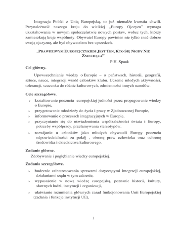 Integracja Polski z Uni Europejsk , to ju niemal e kwestia chwili. Przynale no naszego kraju do wielkiej „Europy Ojczyzn” wymaga ukształtowania w nowym społecze stwie nowych postaw, wobec tych, którzy zamieszkuj kraje wspólnoty. Obywatel Europy powinien nie tylko zna dobrze swoj ojczyzn , ale by obywatelem bez uprzedze . „PRAWDZIWYM EUROPEJCZYKIEM JEST TEN, KTO SI NIGDY NIE ZNIECH CA” P.H. Spaak Cel główny. Upowszechnianie wiedzy o Europie – o pa stwach, historii, geografii, sztuce, nauce, integracji w ród członków klubu. Uczenie młodych aktywno ci, tolerancji, szacunku do ró nic kulturowych, odmienno ci innych narodów. Cele szczegółowe. kształtowanie poczucia europejskiej jedno ci przez propagowanie wiedzy o Europie, przygotowanie młodzie y do ycia i pracy w Zjednoczonej Europie, informowanie o procesach integracyjnych w Europie, przyczynianie si do u wiadomienia współzale no ci wiata i Europy, potrzeby współpracy, przełamywania stereotypów, rozwijanie u członków jako młodych obywateli Europy poczucia odpowiedzialno ci za pokój , obron praw człowieka oraz ochron rodowiska i dziedzictwa kulturowego. Zadanie główne. Zdobywanie i pogł bianie wiedzy europejskiej. Zadania szczegółowe. budzenie zainteresowania sprawami dotycz cymi integracji europejskiej, działaniami rz du w tym zakresie, wyposa enie w now wiedz europejsk , poznanie historii, kultury, sławnych ludzi, instytucji i organizacji, ułatwianie rozumienia głównych zasad funkcjonowania Unii Europejskiej (zadania i funkcje instytucji UE), 1 przygotowanie do samodzielno ci w zdobywaniu informacji na temat Unii, posługiwanie si nowoczesnymi ródłami informacji i umiej tno ci ich wykorzystania, wskazywanie konkretnych form i mo liwo ci współpracy młodzie y w Unii Europejskiej, postrzeganie integracji w kontek cie procesów zachodz cych na wiecie i w Europie, poznanie korzy ci i zagro e płyn cych z uczestnictwa w Unii Europejskiej oraz skutków integracji dla ka dego mieszka ca Polski. Uwagi. Szkolny Klub Europejski to forma współpracy nauczycieli i uczniów, działa na zasadzie koła zainteresowa . Metody pracy: praca w grupach, analiza tekstu ródłowego, pogadanka, debata, „burza mózgów”, wiczenia w grupach, minisonda , inscenizacja. Formy pracy: indywidualna, zespołowa, zbiorowa. rodki dydaktyczne: atlas, widokówki, encyklopedie, tekst ródłowy, plansze o instytucjach Unii Europejskiej, wzory walut euro, tabele przelicznikowe, wyniki bada CBOS. 2 Program pracy Szkolnego Klubu Europejskiego w 2003 r. Zadania Potrzebne rodki Termin Realizatorzy Odpowiedzialny Zadania w Klubie o charakterze organizacyjnym 1. Ogłoszenie konkursu na motto, nazw i logo Klubu. kartony, flamastry do 15 III 2003 Partycja i Ula Sekretarz 2. Przeprowadzenie demokratycznych wyborów. karty do głosowania, urna do 15 XII 2002 uczestnicy Klubu Opiekun 3. Opracowanie Statutu. wzory Statutów do 10 II 2003 grupa „inicjatywna” Opiekun 4. Zało enie kroniki klubowej ksi ka „kronika”, zdj cia, flamastry w miar potrzeb Marta Sekretarz 5. Opracowanie ulotki o tematyce europejskiej. komputer, kolorowy papier kolorowy tusz do 20 V 2003 Rafał i Kasia Opiekun, prezes do 1. I 2003 Zarz d Opiekun, prezes 6.Opracowanie programu pracy komputer, Zadania w szkole o charakterze edukacyjno-wychowawczym. 1. Opracowanie scenariuszy lekcji. literatura metodyczna, i o tematyce europejskiej, atlas, przewodnik po Europie, encyklopedia do 15 III 2003 Opiekun Opiekun 2. Przeprowadzenie lekcji scenariusze I, II, III 2003 Opiekun Opiekun 3. Sporz dzenie albumów encyklopedia, ulotki informacyjne, skoroszyty i koszulki, papier do ko ca roku szkolnego Eliza, Marta, Kasia i Małgosia Bartek Monika, Karolina Diana europejskich. o pa stwach Europy. 4. Urz dzenie Biblioteczki Integracji materiały z CIE, Europejskiej. pozycje ksi kowe, broszurki, czasopisma, opracowania referatowe 3 sukcesywnie Zadania Potrzebne rodki Termin 5. Wykonanie plakatów, haseł i plansz karton, komputer, edukacyjnych 6. Zorganizowanie seminarium: a) opracowanie wyst pie , b) opracowanie scenariusza „Kowalski w Europie”, c) przeprowadzenie prareferendum. 7. Zorganizowanie „Pikniku Europejskiego” a) prezentacja wybranych pa stw, b) inscenizacje i scenki, c) piosenki i układy taneczne, d) Eurokuchnia 8. Eksponowanie tematyki europejskiej w pracowni ekonomicznej i na tablicach korytarzowych pt. „Spacerkiem po Europie”. 9. Organizowanie „Dni Europy” w szkole 10. Organizowanie konkursów o Unii Europejskiej papier samoprzylepny materiały z Internetu, materiały z CIE, karty głosowania, urna na seminarium do 25 IV kartony, flamastry, w miar markery, szablony potrzeb liter, papier samoprzylepny, szpilki, pinezki rekwizyty, stroje, kartony, albumy, encyklopedie, przewodniki po Europie kartony, flamastry, szablony, zestawy pyta Albert Joanna, Marta, do 25 IV Anna, Wioleta, Marta rekwizyty, stroje, albumy, kasety, warzywa, sałatki, pizza, spaghetti, kawa cappuccino Realizatorzy Odpowiedzialny uczestnicy Klubu Bartek Opiekun Opiekun, prezes Rafał, Joanna, Anna Opiekun, prezes raz w m-cu Zarz d Opiekun, prezes X XI Marta Monika Opiekun, prezes Zadania pozaszkolne polegaj ce na pozyskaniu grup wsparcia. 1. Poszukiwanie grup wsparcia w szkole, samorz dzie i rodowisku. 2. Współpraca z mediami (TV Kra nik, lokalna prasa). Joanna i Eliza w miar potrzeb Joanna zaproszenie 3. Uczestniczenie w imprezach o tematyce europejskiej. 4. Nawi zanie współpracy z innymi klubami. w miar potrzeb w miar potrzeb zaproszenie w miar potrzeb Opiekun Opiekun Opiekun, prezes Opiekun, prezes Prezes Prezes Oczekiwane efekty. zdobywaj now wiedz i umiej tno ci nie pod presj ocen, ale dlatego, e co ich interesuje, bawi, anga uje, rozumiej poczucie europejskiej jedno ci i najwa niejszych osi gni w dziedzinie demokracji, posiadaj wiedz o historii, kulturze, gospodarce i yciu mieszka ców Unii Europejskiej, uczestnicz w budowie nowego ładu europejskiego przez rozwijanie 