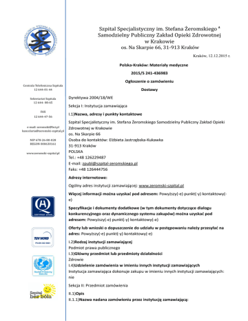Szpital Specjalistyczny im. Stefana Żeromskiego Samodzielny Publiczny Zakład Opieki Zdrowotnej w Krakowie os. Na Skarpie 66, 31-913 Kraków Kraków, 12.12.2015 r. Polska-Kraków: Materiały medyczne 2015/S 241-436983 Ogłoszenie o zamówieniu Centrala Telefoniczna Szpitala 12 644-01-44 Sekretariat Szpitala 12 644- 08-65 FAX 12 644-47-56 e-mail: [email protected] [email protected] NIP 678-26-80-028 REGON 000630161 www.zeromski-szpital.pl Dostawy Dyrektywa 2004/18/WE Sekcja I: Instytucja zamawiająca I.1)Nazwa, adresy i punkty kontaktowe Szpital Specjalistyczny im. Stefana Żeromskiego Samodzielny Publiczny Zakład Opieki Zdrowotnej w Krakowie os. Na Skarpie 66 Osoba do kontaktów: Elżbieta Jastrzębska-Kukawka 31-913 Kraków POLSKA Tel.: +48 126229487 E-mail: [email protected] Faks: +48 126444756 Adresy internetowe: Ogólny adres instytucji zamawiającej: www.zeromski-szpital.pl Więcej informacji można uzyskać pod adresem: Powyższy(-e) punkt(-y) kontaktowy(e) Specyfikacje i dokumenty dodatkowe (w tym dokumenty dotyczące dialogu konkurencyjnego oraz dynamicznego systemu zakupów) można uzyskać pod adresem: Powyższy(-e) punkt(-y) kontaktowy(-e) Oferty lub wnioski o dopuszczenie do udziału w postępowaniu należy przesyłać na adres: Powyższy(-e) punkt(-y) kontaktowy(-e) I.2)Rodzaj instytucji zamawiającej Podmiot prawa publicznego I.3)Główny przedmiot lub przedmioty działalności Zdrowie I.4)Udzielenie zamówienia w imieniu innych instytucji zamawiających Instytucja zamawiająca dokonuje zakupu w imieniu innych instytucji zamawiających: nie Sekcja II: Przedmiot zamówienia II.1)Opis II.1.1)Nazwa nadana zamówieniu przez instytucję zamawiającą: Dostawa sprzętu jednorazowego użytku. II.1.2)Rodzaj zamówienia oraz lokalizacja robót budowlanych, miejsce realizacji dostawy lub świadczenia usług Dostawy Kupno Główne miejsce lub lokalizacja robót budowlanych, miejsce realizacji dostawy lub świadczenia usług: Magazyn Medyczny Szpitala specjalistycznego im. S. Żeromskiego SP ZOZ w Krakowie, os. Na Skarpie 66. Kod NUTS PL213 II.1.3)Informacje na temat zamówienia publicznego, umowy ramowej lub dynamicznego systemu zakupów (DSZ) Ogłoszenie dotyczy zamówienia publicznego II.1.4)Informacje na temat umowy ramowej II.1.5)Krótki opis zamówienia lub zakupu Przedmiotem zamówienia jest dostawa sprzętu jednorazowego użytku zwanego dalej wyrobami medycznymi w następującym zestawieniu: grupa 1 – podkłady i pościel z włókniny grupa 2 – podkłady w rolce grupa 3 – fartuchy higieniczne grupa 4 -fartuchy foliowe grupa 5 -foliowe i włókninowe ochraniacze na buty grupa 6 – koszula p/operacyjna z włókniny grupa 7 – pieluchomajtki grupa 8 – podkłady chłonne grupa 9 – podpaski ginekologiczne grupa 10 -pojemnik do transportu narzędzi do sterylizacji grupa 11 – elektroda bierna. Szczegółowy opis zawiera załącznik nr 6 do SIWZ. 2. Minimalny okres przydatności do użycia oferowanego wyrobu medycznego powinien wynosić minimum 12 miesięcy od daty dostawy. 3. Zamawiający zastrzega sobie prawo zamówienia mniejszej niż określone powyżej ilości wyrobów medycznych w przypadku zmniejszenia się jego zapotrzebowania. Zamawiający określił maksymalną ilość materiałów medycznych przewidzianą do zakupu. Zamawiający zastrzega sobie prawo zamówienia mniejszej niż określone powyżej ilości materiałów medycznych w przypadku zmniejszenia się jego zapotrzebowania, z tym że Zamawiający zakupi minimum 50 % ilości materiałów medycznych. 4. Dostawa wyrobów medycznych do siedziby Zamawiającego nastąpi na koszt i ryzyko Wykonawcy. 5. Zaoferowane wyroby medyczne muszą spełniać wymagania ustawy z dnia 20 maja 2010 r. o wyrobach medycznych ( tekst jednolity Dz. U. z 2015 poz. 876 z późn. zm.), tj. posiadać wpisy i świadectwa wydane przez uprawnione organy: a) deklarację zgodności CE producenta (dotyczy wszystkich klas wyrobu medycznego), b) certyfikat jednostki notyfikującej (dotyczy klasy wyrobu medycznego: I sterylna, I z funkcją pomiarową, IIa, IIb, III), c) zgłoszenie/powiadomienie/wniosek do Prezesa Urzędu Rejestracji Produktów Leczniczych, Wyrobów Medycznych i Produktów Biobójczych. d) w przypadku produktów, które nie podlegają przepisom ustawy z dnia 20 maja 2010 r. o Wyrobach Medycznych, Wykonawca zobowiązany jest dołączyć do oferty inne niż wyżej wymienione, odpowiednie dokumenty dopuszczające te produkty do obrotu i stosowania. ( dotyczy grupy 4 poz. 1, grupy 5, grupy 10). II.1.6)Wspólny Słownik Zamówień (CPV) 33140000, 33771100, 33771200 II.1.7)Informacje na temat Porozumienia w sprawie zamówień rządowych (GPA) Zamówienie jest objęte Porozumieniem w sprawie zamówień rządowych (GPA): nie II.1.8)Części To zamówienie podzielone jest na części: tak Oferty można składać w odniesieniu do jednej lub więcej części II.1.9)Informacje o ofertach wariantowych Dopuszcza się składanie ofert wariantowych: nie II.2)Wielkość lub zakres zamówienia II.2.1)Całkowita wielkość lub zakres: II.2.2)Informacje o opcjach Opcje: tak Proszę podać opis takich opcji: Zamawiający zastrzega sobie prawo zamówienia mniejszej niż określone powyżej ilości materiałów medycznych w przypadku zmniejszenia się jego zapotrzebowania, z tym że Zamawiający zakupi minimum 50 % ilości materiałów medycznych. II.2.3)Informacje o wznowieniach Jest to zamówienie podlegające wznowieniu: nie II.3)Czas trwania zamówienia lub termin realizacji Okres w miesiącach: 24 (od udzielenia zamówienia) Informacje o częściach zamówienia Część nr: 1 Nazwa: Grupa 1 1)Krótki opis Dostawa sprzętu jednorazowego użytku zgodnie z opisem przedmiotu zamówienia określonym w załączniku nr 6 do specyfikacji. Minimalny okres przydatności do użycia oferowanych materiałów opatrunkowych powinien wynosić minimum 12 miesięcy od daty dostawy. Zamawiający określił maksymalną ilość materiałów medycznych przewidziana
