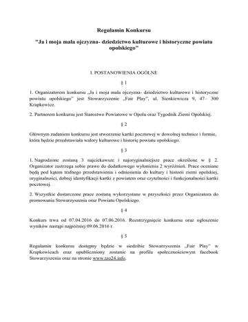 Regulamin Konkursu "Ja i moja mała ojczyzna- dziedzictwo kulturowe i historyczne powiatu opolskiego" I. POSTANOWIENIA OGÓLNE §1 1. Organizatorem konkursu „Ja i moja mała ojczyzna- dziedzictwo kulturowe i historyczne powiatu opolskiego” jest Stowarzyszenie „Fair Play”, ul. Sienkiewicza 9, 47– 300 Krapkowice. 2. Partnerem konkursu jest Starostwo Powiatowe w Opolu oraz Tygodnik Ziemi Opolskiej. §2 Głównym zadaniem konkursu jest stworzenie kartki pocztowej w dowolnej technice i formie, która będzie przedstawiała walory kulturowe i historię powiatu opolskiego. §3 1. Nagrodzone zostaną 3 najciekawsze i najoryginalniejsze prace określone w § 2. Organizator zastrzega sobie prawo do dodatkowego wyłonienia 2 wyróżnień. Prace oceniane będą pod kątem trafnego przedstawienia i odniesienia do kultury i historii ziemi opolskiej, oryginalności, dobrej identyfikacji kartki z powiatem oraz czytelności i funkcjonalności kartki pocztowej. 2. Wszystkie dostarczone prace zostaną wykorzystane w przyszłości przez Organizatora do promowania Stowarzyszenia oraz Powiatu Opolskiego. §4 Konkurs trwa od 07.04.2016 do 07.06.2016. Rozstrzygnięcie konkursu oraz ogłoszenie wyników nastąpi najpóźniej 09.06.2016 r. §5 Regulamin konkursu dostępny będzie w siedzibie Stowarzyszenia „Fair Play” w Krapkowicach oraz upubliczniony zostanie na profilu społecznościowym facebook Stowarzyszenia oraz na stronie www.tzo24.info. II. UCZESTNICY KONKURSU §6 1. Konkurs ma charakter otwarty, zaproszenie obejmuje wszystkich mieszkańców powiatu opolskiego. Technika wykonywania jak i format prac jest dowolnym, jednakże do konkursu dopuszcza się prace wykonane ręcznie, nie komputerowo. 2. Osoby niepełnoletnie muszą dołączyć do prac pisemną zgodę rodziców bądź prawnych opiekunów na udział w konkursie. III. ZASADY UCZESTNICTWA W KONKURSIE §7 1. Każdy uczestnik może nadesłać od 1 do 3 prac. 2. Prace należy nadsyłać na Konkurs jako przesyłkę pocztową lub przesyłkę kurierską (na koszt nadsyłającego) bądź osobiście dostarczyć do siedziby organizatora. 3. Organizator zastrzega sobie prawo do wyłączenia z udziału w Konkursie prac o niskiej jakości. 4. Do dużej koperty (zaadresowanej na: Stowarzyszenie „Fair Play”, ul. Sienkiewicza 9, 47-300 Krapkowice z dopiskiem: KONKURS „ Opolska pocztówka”) należy włożyć pracę bądź prac oraz osobną kartkę, która zawierać będzie informacje z danymi, identyfikującymi autora: imię, nazwisko, adres zamieszkania, telefon, e-mail (nieobowiązkowo), oraz następującą, podpisaną klauzulą: "Wyrażam zgodę na przetwarzanie moich danych osobowych przez Organizatora Konkursu "Ja i moja mała ojczyznadziedzictwo kulturowe i historyczne powiatu opolskiego", w celach wynikających z regulaminu tego Konkursu, zgodnie z ustawą z dnia 29 sierpnia 1997 roku o ochronie danych osobowych (Dz. U. z 1997 r., nr 133, poz. 883 z późniejszymi zmianami). Poprzez dostarczenie prac na Konkurs nieodpłatnie przenoszę na Organizatora wszelkie autorskie prawa majątkowe do nich, na wszystkich polach eksploatacji, o których mowa w art. 50 Ustawy z dnia 4 lutego 1994 roku o prawie autorskim i prawach pokrewnych (Dz. U. Z 2000 r., Nr 80, poz. 904 z późn. zmianami)." 5. Osoby niepełnoletnie dołączają w zaklejonej kopercie pisemną zgodę rodziców lub opiekunów na udział w Konkursie. Jednocześnie rodzice lub opiekunowie podpisują, wraz z biorącym udział w Konkursie, oświadczenie, o którym mowa w pkt. 4 6. W Konkursie mogą brać udział jedynie te prace, które nie zostały nigdzie publikowane, ani nie brały udziału w żadnym innym konkursie. 7. Organizator zastrzega sobie prawo do dyskwalifikowania prac nie spełniających wymienionych wyżej wymogów. 8. Organizator nie zwraca prac biorących udział w Konkursie, prac zdyskwalifikowanych jak również z niego wyłączonych. IV. TERMIN I WARUNKI DOSTARCZENIA PRAC §8 1. Prace będą przyjmowane jedynie w formie fizycznej. 2. Termin zgłaszania prac upływa dnia 07.06.2016 r. 3. Prace przesłane po terminie nie będą brane pod uwagę. 4. Laureaci konkursu otrzymają telefoniczne zawiadomienie zawierające informacje dotyczące terminu uroczystego wręczenia nagród. 5. Organizatorzy nie ponoszą odpowiedzialności za uszkodzenia powstałe podczas dostarczania prac. 6. Prace przechodzą na własność Organizatora i nie będą zwracane. V. KOMISJA KONKURSOWA §9 1. Komisja Konkursowa będzie składać się z trzech przedstawicieli Stowarzyszenia 2. Decyzje Komisji Konkursowej są ostateczne. VI. POSTANOWIENIA KOŃCOWE § 10 1. Wszelkie pytania dotyczące Konkursu należy kierować do Organizatora mailowo lub telefonicznie: e – mail: [email protected], tel. kom. 692 190 982 2. W przypadkach nie przewidzianych w regulaminie rozstrzyga Organizator 3. Organizator zastrzega sobie prawo zmiany niniejszego regulaminu.
