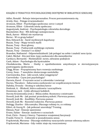 KSIĄŻKI O TEMATYCE PSYCHOLOGICZNEJ DOSTĘPNE W BIBLIOTECE SZKOLNEJ Adler, Ronald - Relacje interpersonalne. Proces porozumiewania się. Ariely, Dan - Potęga irracjonalności Aronson, Elliot - Psychologia spoleczna: serce i umysł Aronson, Elliot - Człowiek istota społeczna Augostynek, Andrzej - Psychopatologia człowieka dorosłego Baumeister, Roy - Mit dobrego samopoczucia Beck, Aaron - Miłość nie wystarczy Berne - W co grają ludzie? Bon, Edward de - Sześć myślowych kapeluszy Buzan, Tony - Mapy twoich myśli Buzan, Tony - Rusz głową Buzan, Tony - Podręcznik szybkiego czytania Buzan, Tony - Zmiana! I co dalej? Branden, Nathaniel - Odpowiedzialność. Jak polegać na sobie i znaleźć sens życia Cakrt, Michal - Kto jest kim: typy osobowości dla menedżerów Carducci, Bernardo - Nieśmiałość: nowe, odważne podejście Cash, Adam - Psychologia dla bystrzaków Chodakowska, Maria - Osoby z upośledzeniem umysłowym w stereotypowym postrzeganiu społecznym Clegg, Brian - Przyspieszony kurs rozwoju osobistego Covey, Sean - 7 nawyków skutecznego nastolatka Czerniawska, Ewa - Jaki uczeń, takie osiągnięcia? Czerwińska - Czym jest psychologia? Darwin, Karol - O wyrazie uczuć u człowieka i zwierząt Davies, Theodore - Zaburzenia osobowości we współczesnym świecie Dębska, Urszula - Strateg w szkolnej ławce Dodziuk, A. - Bliskość, która uzdrawia i uszczęśliwia Dominian, Jack - Cykle afirmacji ludzkich Dorota Krzemionka (red.) - Bliżej siebie. Rozmowy z mistrzami Dowell, Josh Mc - Jak poznać prawdziwą miłość. Pierwsza pomoc. Dowell, Josh Mc - Konflikty. Pierwsza pomoc Dowell, Josh Mc - Rozwód rodziców. Pierwsza pomoc Duhigg, Charles - Siła nawyku. Dlaczego robimy to, co robimy Eifert, dr Georg H. - Jak pokonać anoreksję? Trening Ekman, Paul - Emocje ujawnione Evans, Dylan - Emocje: naukowo o uczuciach Evat, Chris - Dawcy i biorcy. Tajemnice wzajemnej fascynacji Frankl, Victor E. - Człowiek w poszukiwaniu sensu Frąckowiak, Marzena - Dlaczego niektórzy nauczyciele zawsze odnoszą sukces Frąckowiak, Marzena - Gdy rodzic staje się roszczeniowy Freud, Zygmunt - Wstęp do psychoanalizy Fromm, Erich - Zapomniany język - wstęp do rozumienia snów, baśni Galloway, Charles - Psychologia uczenia się i nauczania Goleman, Daniel - Inteligencja emocjonalna Goleman, Daniel - Intelogencja emocjonalna w praktcye Hamer, Hanna - Rozwój umiejętności społecznych Hamlin, Sonya - Jak mówić, żeby nas słuchali Hassan, Stephen - Psychomanipulacja w sektach Havas, Herald - Jestem genialny, czyli jak wykorzystać w 100% swój potencjał umysłowy Hayers, Steven C. - W pułapce myśli Herbert, Martin - Rozwód w rodzinie Holler, Ingrid - Porozumienie bez przemocy. Ćwiczenia Jabłoński, Kuba - Rozwód: jak go przeżyć? Jagieła, Jarosław - Rozważne zaangażowanie Jaskulska, Sylwia - Lekcje (nie)wychowawcze? Jahnston, Joni E. - psychologia dla żółtodziobów Johnstone, Matthew - Mój czarny pies Depresja Johnstone, Matthew - Życie pod psem, który wabi się Depresja Joule, Robert - Gra w manipulacje Jung, Carl Gustaw - Picasso Jung, Carl Gustaw - Psychologia i poezja Karowska, Dorota - Kto nie daje się reklamie Kaźmierczak, Maria - E jak empatia Kendall, Philip C. - Zaburzenia okresu dzieciństwa i adolescencji Kępiński, Antoni - Melancholia Klasyfikacja Zaburzeń Psychicznych - ICD 10 Kofta, Mirosław - Złudzenia, które pozwalają żyć Kołodziejczyk, Jakub - Dyscypliny trzeba uczyć Korczyński, Stanisław - Stres w środowisku edukacyjnym młodzieży Kozielecki, Józef - Koncepcje psychologiczne człowieka Kozielecki, Józef - Rozwiązywanie problemów Król-Fijewska, Maria - Stanowczo, łagodnie, bez lęku Kubler-Ross, Elisabeth - Dzieci i śmierć - jak dzieci i rodzice radzą sobie ze śmiercią Kuziak, Michał - Jak mówić, rozmawiać, przemawiać? Larsson, Liv - Porozumienie bez przemocy w związkach Leary, Mark - Wywieranie wrażenia na innych Legumi, Marco - Techniki i sposoby animowania grup Levine, Peter A. - 12 stopniowy program wychodzenia z traumy Lew-Starowicz, Zbigniew - Nowoczesne wychowanie seksualne Lilienfeld, Scott O. - 50 wielkich mitów psychologii popularnej Lipczyński, Andrzej - Psychologiczna interwencja w sytuacjach kryzysowych Łosiak, Władysław - Psychologia emocji Łoskot, Małgorzata - Własny styl nauczyciela Łuba, Małgorzata - Nauczyć samego siebie Łukaszewski, Wiesław - Wielki pytania psychologii Maxwell, John C. - Być liderem. Ponadczasowe zasady przewodzenia grupom i organizacjom McGill, Tom - Przezwyciężyć uzależnienie McGinnis, Alan Loy - Potęga optymizmu Mierwińska, Jadwiga - Błyskawiczny kurs szybkiego czytania Mika, Stanisław - O różnych drogach samodoskonalenia Mika, Stanisław - Psychologia społeczna Millon, Theodore - Zaburzenia osobowości we współczesnym świecie Munchheusen, Marco von - Tak poskromisz swojego wewnętrznego lenia! Obuchowska, Irena - Drogi dorastania Oldham, John - Twój psychologiczny autoportret Pachowicz, Matylda - Drogowskazy na drodze do szczęścia i samorealizacji Padesky, Christine A. - Umysł ponad nastrojem Piaget, Jean - Inteligencja Piekarska, Joanna - Panaceum na wszystkie problemy? Pietucha, Piotr - Dożywotni kochankowie. Tajemnica udanego związku Pinker, Steven - Tabula Rasa. Spory o naturę ludzką Przetacznikowa, Maria - Podstawy rozwoju psychicznego dzieci i młodzieży Przewęda, Ryszard - Rozwój somatyczny i motoryczny Rosenberg, Marshall B. - Rozwiązywanie konfliktów poprzez porozumiennie bez przemocy Rosenberg, Marshall B. - Porozumienie bez przemocy. O języku serca Rożek, Tomasz - Nauka po prostu - wywiady z wybitnymi Rybakiewicz, Elżbieta - Człowiek wśród ludzi Rybarczyk, Krystyna - Emocje a płeć Rylke, Hanna - Pokolenie zmian. Czego boją się dorośli Rzepa, Teresa - Psychologia komunikacji dla menedżerów Sadowski, Bogdan - Biologiczne podstawy zachowania się ludzi i zwierząt Seligman, Martin - Optymizmu można się nauczyć 