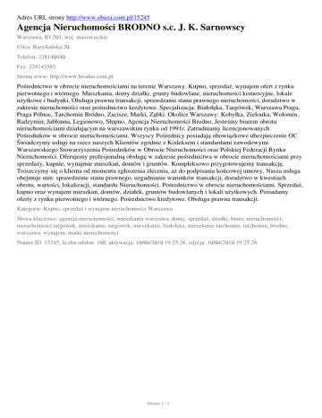 Adres URL strony http://www.ebaza.com.pl/15245 Agencja Nieruchomości BRODNO s.c. J. K. Sarnowscy Warszawa, 03-203, woj. mazowieckie Ulica: Bazyliańska 20 Telefon: 228140440 Fax: 228143585 Strona www: http://www.brodno.com.pl Pośrednictwo w obrocie nieruchomościami na terenie Warszawy. Kupno, sprzedaż, wynajem ofert z rynku pierwotnego i wtórnego. Mieszkania, domy działki, grunty budowlane, nieruchomości komercyjne, lokale użytkowe i budynki. Obsługa prawna transakcji, sprawdzanie stanu prawnego nieruchomości, doradztwo w zakresie nieruchomości oraz pośrednictwo kredytowe. Specjalizacja: Białołęka, Targówek, Warszawa Praga, Praga Północ, Tarchomin Bródno, Zacisze, Marki, Ząbki. Okolice Warszawy: Kobyłka, Zielonka, Wołomin, Radzymin, Jabłonna, Legionowo, Słupno. Agencja Nieruchomości Brodno. Jesteśmy biurem obrotu nieruchomościami działającym na warszawskim rynku od 1991r. Zatrudniamy licencjonowanych Pośredników w obrocie nieruchomościami. Wszyscy Pośrednicy posiadają obowiązkowe ubezpieczenie OC Świadczymy usługi na rzecz naszych Klientów zgodnie z Kodeksem i standardami zawodowymi Warszawskiego Stowarzyszenia Pośredników w Obrocie Nieruchomości oraz Polskiej Federacji Rynku Nieruchomości. Oferujemy profesjonalną obsługę w zakresie pośrednictwa w obrocie nieruchomościami przy sprzedaży, kupnie, wynajmie mieszkań, domów i gruntów. Kompleksowo przygotowujemy transakcję. Troszczymy się o klienta od momentu zgłoszenia zlecenia, aż do podpisania końcowej umowy. Nasza usługa obejmuje min: sprawdzenie stanu prawnego, uzgadnianie warunków transakcji, doradztwo w kwestiach obrotu, wartości, lokalizacji, standardu Nieruchomości. Pośrednictwo w obrocie nieruchomościami. Sprzedaż, kupno oraz wynajem mieszkań, domów, działek, gruntów budowlanych i lokali użytkowych. Posiadamy oferty z rynku pierwotnego i wtórnego. Pośrednictwo kredytowe. Obsługa prawna transakcji. Kategorie: Kupno, sprzedaż i wynajem nieruchomości Warszawa Słowa kluczowe: agencja nieruchomości, mieszkania warszawa, domy, sprzedaż, działki, biuro, nieruchomości, nieruchomości targówek, mieszkanie, targówek, mieszkania, białołęka, mieszkanie tarchomin, tarchomin, brodno, warszawa, wynajem, marki nieruchomości Numer ID: 15245, liczba odsłon: 108, aktywacja: 10/04/2010 19:25:26, edycja: 10/04/2010 19:25:26 Strona 1 / 1