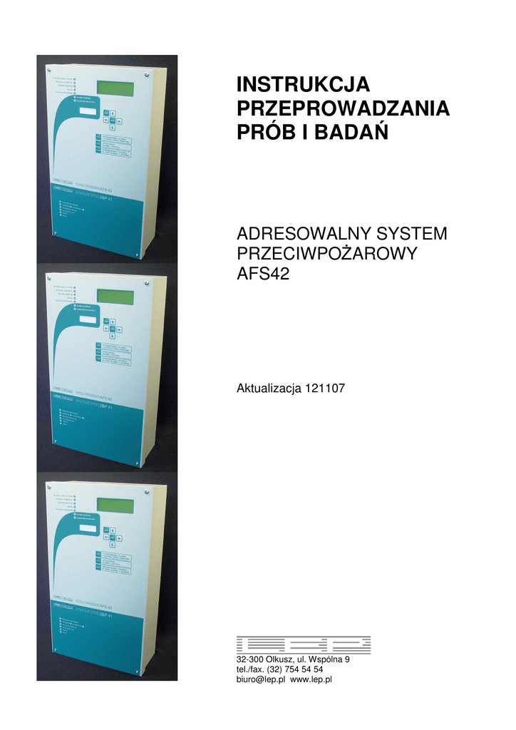 INSTRUKCJA PRZEPROWADZANIA PRÓB I BADAŃ ADRESOWALNY SYSTEM PRZECIWPOŻAROWY AFS42 Aktualizacja 121107 32-300 Olkusz, ul. Wspólna 9 tel./fax. (32) 754 54 54 [email protected] www.lep.pl IPiB - Instrukcja Przeprowadzania Prób i Badań: SYSTEM AFS42 121107 Strona 2 z 3 Wyniki sprawdzeń i pomiarów należy wpisać do Protokołu badań i testów sprawności funkcjonowania systemu AFS42 1. Sprawdzenie baterii podtrzymującej zegar czasu rzeczywistego. Zmierzyć napięcie na zaciskach baterii. Prawidłowa wartość 2.8V - 3.1V DC 2. Sprawdzenie stanu akumulatorów. Sprawdzić stan akumulatorów zainstalowanych w centrali zgodnie z wytycznymi producenta akumulatorów. 3. Podłączenie centrali AFS do zasilania - sygnalizacja stanu pracy. Po podłączeniu do centrali AFS42 akumulatorów, linii dozorowych podłączyć zasilanie 230VAC. Na wyświetlaczu powinien pojawić się na około 5 sekund ekran powitalny: SYSTEM P.POZ. AFS42 WERSJA: AC5 AS5 a następnie zmienić się na ekran główny: SYSTEM P.POZ. AFS42 2011.01.01 16:15:32 TRYB=CN W: , , , ENT– ENT–MENU, D:WYL P=01 Na panelu czołowym powinna zaświecić się kontrolka: ZASILANIE PODSTAWOWE oraz w zależności od konfiguracji systemu dodatkowo mogą zaświecić się kontrolki: PERSONEL NIEOBECNY i BLOKADA CZĘŚCI SYSTEMU. Na panelu zasilacza powinny zaświecić się kontrolki: ZASILANIE PODSTAWOWE, ŁADOWANIE KONSERWACJA, AKU NAŁADOWANY 25V, AKU SPRAWNY 24V. W zależności od stanu naładowania akumulatora kontrolka KONSERWACJA może pulsować. 4. Pomiary linii dozorowej. Do pomiarów potrzebny jest: - multimetr - rezystor obciążający R, wartość około 330 Ohm, moc 2W 4.1. Pomiary rezystancji. Odłączyć linię dozorową od zacisków centrali z obu stron. Najłatwiej linię dozorową można odłączyć poprzez wysunięcie kostek śrubowych ze szpilek wlutowanych w płytę centrali Zmierzyć rezystancje: a) Pomiędzy przewodami linii dozorowej, które będą podłączone do zacisków –LA i –LB centrali - rezystancja przewodu "–" pętli. Wynik zapisać jako [R_LAB_GND] - prawidłowa wartość < 37 Ohm b) Pomiędzy przewodami ekranu na obu końcach linii dozorowej - rezystancja ekranu pętli. Wynik zapisać jako [R_EKR] - prawidłowa wartość < 77 Ohm 4.2. Pomiar prądu zasilania linii dozorowej. Podłączyć końcówki linii dozorowej +LA przez amperomierz do zacisku +24RS i -LA do GND. (uwaga na polaryzację). Odczekać kilka sekund na ustabilizowanie się pracy linii. Wszystkie czujki OSD23 i ROP42 powinny być w stanie dozoru. LEP - ul. Wspólna 9, 32-300 Olkusz, tel/fax 32 754 54 54, 55 [email protected], www.lep.pl IPiB - Instrukcja Przeprowadzania Prób i Badań: SYSTEM AFS42 121107 Strona 3 z 3 Odczytać prąd zasilania linii dozorowej i zapisać jako [I_LINII]. Prawidłowa wartość to ilość elementów linii dozorowej (czujek OSD23 lub ROP42) przemnożona przez 0.45mA. 4.3. Test obciążenia od strony LB. Podłączyć linię dozorową tylko do zacisków +LA i –LA centrali. Linię dozorową odłączyć od zacisków +LB i –LB centrali. Przy pomiarach wskazania będą się wahać, do odczytu przyjmować wartość maksymalną. a) Zmierzyć napięcie pomiędzy zaciskami linii dozorowej +LA i –LA . Wynik zapisać jako [U_OBC_LB_1] - prawidłowa wartość wynosi ok. 21VDC. b) Zmierzyć napięcie pomiędzy końcówkami linii dozorowej +LB i –LB (są odłączone od centrali) Wynik zapisać jako [U_OBC_LB_2] - prawidłowa wartość wynosi od 18VDC do 21VDC. c) Podłączyć pomiędzy końcówki linii dozorowej +LB i –LB (są odłączone od centrali) rezystor obciążający R. d) Zmierzyć napięcie pomiędzy zaciskami linii dozorowej +LB i –LB (są odłączone od centrali) Wynik zapisać jako [U_OBC_LB_3] - prawidłowa wartość powinna być niższa od U_OBC_LB_2 i wynosić od 15VDC do 21VDC). 4.4. Test obciążenia od strony LA. Podłączyć linię dozorową tylko do zacisków +LB i –LB centrali. Linię dozorową odłączyć od zacisków +LA i –LA centrali. Przy pomiarach wskazania będą się wahać, do odczytu przyjmować wartość maksymalną. a) Zmierzyć napięcie pomiędzy zaciskami linii dozorowej +LB i –LB. Wynik zapisać jako [U_OBC_LA_1] - prawidłowa wartość wynosi ok. 21VDC. b) Zmierzyć napięcie pomiędzy końcówkami linii dozorowej +LA i –LA (są odłączone od centrali) Wynik zapisać jako [U_OBC_LA_2] - prawidłowa wartość wynosi od 18VDC do 21VDC. c) Podłączyć pomiędzy końcówki linii dozorowej +LA i –LA (są odłączone od centrali) rezystor obciążający R. d) Zmierzyć napięcie pomiędzy zaciskami linii dozorowej +LA i –LA (są odłączone od centrali) Wynik zapisać jako [U_OBC_LA_3] - prawidłowa wartość powinna być niższa od U_OBC_LA_2 i wynosić od 15VDC do 21VDC). 5. Test kontrolek LED i sygnału dźwiękowego Wykonać test kontrolek LED i test sygnału dźwiękowego (menu główne: USTAWIENIA \ TEST) 6. Test klawiszy (przycisków) Wykonać test klawiszy (menu główne: USTAWIENIA \ TEST KLAWISZY) 7. Sprawdzenie wyjść urządzeń wykonawczych. Zgodnie z planem projektu załączyć każde urządzenie wykonawcze za pomocą opcji TEST umieszczonej w konfiguracji urządzenia wykonawczego (menu główne: UW W SYSTEMIE \ UW00:nazwa \ TEST) 8. Sprawdzenie zadziałania czujek pożarowych i ręcznych ostrzegaczy pożarowych pracujących w linii dozorowej. 8.1. Na czas sprawdzania czujek pożarowych i ręcznych ostrzegaczy pożarowych ustawić pracę centrali AFS42 w trybie PERSONEL NIEOBECNY (uprości to sygnalizowanie, ponieważ każdy alarm będzie alarmem II-go stopnia). 8.2. Posługując się planem projektu, dla każdej czujki OSD23 i ROP42 pojedynczo wywołać alarm i sprawdzić czy centrala AFS42 sygnalizuje stan alarmu z odpowiedniego adresu. Następnie skasować alarm i poczekać aż centrala wróci do stanu dozoru a następnie przejść do sprawdzenia następnej czujki lub ręcznego ostrzegacza pożarowego (w przypadku stref należy uwzględnić alarmo