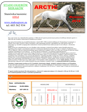 STADO OGIERÓW SIERAKÓW ARCTIC Stanówka/nasienie: 600zł Nowość 2016 www.stadoogieow.eu tel: 603 562 934 Siwy ogier Arctic rasy würtemberskiej urodzony w 2004 roku był ogierem premiowanym podczas kwalifikacji młodych ogierów w 2006 roku dla Związków Hodowlanych Południowych Niemiec. Jego ojciec holsztyńskiej rasy Acordelli dwukrotnie w latach 2005 i 2006 uzyskał kwalifikację do Niemieckiego Czempioantu w skokach. Przez ogiery Acord II i Ahorn Z pochodzi z rodu znakomitego skoczka i reproduktora rasy selle francais Alme. W rodowodzie og. Acordelli występują takie znakomitości światowej hodowli koni skokowych jak Cor de la Bryere i dwukrotnie Landgraf I. Matką Arctica jest würtemberskiej rasy siwa Headline córka cenionego w hodowli koni półkrwi ogiera Heraldik pełnej krwi angielskiej, który niegdyś z powodzeniem startował w konkurencji ujeżdżenia do klasy St. Georg i w skokach w konkursach klasy 130 cm. Babka kl. Lady jest córką holsztyńskiego ogiera Landioso po Landgraf I od kl. Up to Date I po Calvados II, który jest synem wybitnego reproduktora Cor de la Bryere – sf i klaczy Biserta po Raimond - syn polskiego angloaraba Ramzes. Prabaka ze strony matki ogiera Arctic klacz Peggy dwukrotnie w swoim rodowodzie posiada krew polskiego ogiera czystej krwi arabskiej Fetysz. Obok sław o dużej wartości użytkowej jak ogiery Alme Z, Cor de la Bryere i Landgraf I, rodowówd ogiera Arctic uzupełniają cenne reproduktory rasy czystych jak pełnej krwi angielskiej Heraldik, Cottage Son, Furioso, Rantzau, Ladykiller, Ultimate oraz z krwią orientalną polskiej hodowli dwukrotnie angloarabski Ramzes i dwukrotnie czystej krwi arabskiej Fetysz. Ogier Arctic reprezentuje sobą doskonały typ rasowy, płciowy i użytkowy o dużej urodzie. Arctic wyróżnił się dużą wartością użytkową podczas 70 dniowego testu, indeks ogólny 125,85 punktów, indeks ujeżdżeniowy 112,47, indeks skokowy 132,16. Zdecydowana większość ocen w próbie dzielności powyżej 8 punktów za galop 8,5 pkt, a za skoki pod jeźdźcami 9,5 punktów. Charakter i temperament oceniono na 9,5 i 9 punktów, konstytucja, impuls, jezdność i zdolności skokowe na 9,0 punktów W roku 2010 jako sześciolatek z notą 8,3 punktów ogier Arctic uzyskał kwalifikację do Niemieckiego Czempionatu w konkurencji skoków. W swojej karierze sportowej startował w skokach w konkursach 120-130 cm na 17 startów zajął 12 miejsc do trzeciej pozycji w tym w 7 odniósł zwycięstwa. W sporcie użytkowanych jest 28 sztuk potomstwa, z których 21 zajmowało miejsca 1-8 w klasach L-120 cm, M-130 cm i S-140 cm. W hodowli posiada 22 córki, w tym klacze premiowane. Rasa: würtemberska Urodzony: 24.05.2004r. Wymiary: 167-195-21 HEADLINE LAYDY ACORDELLI HERALDIK xx CORINA ACORD II AHORN Z RIBECKA COR DE LA BRYERE RAGNA CARMEL xx HERALDIKA xx LANDIOSO PEGGY