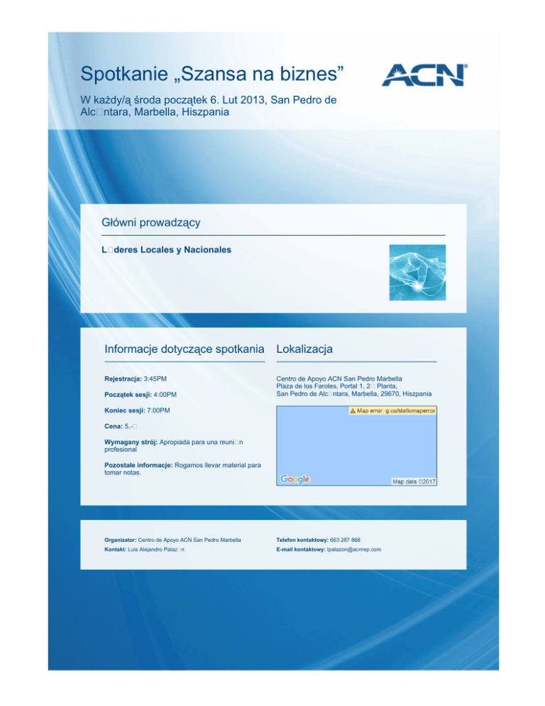 Spotkanie „Szansa na biznes” W każdy/ą środa początek 6. Lut 2013, San Pedro de Alc�ntara, Marbella, Hiszpania Główni prowadzący L�deres Locales y Nacionales Informacje dotyczące spotkania Lokalizacja Rejestracja: 3:45PM Centro de Apoyo ACN San Pedro Marbella Plaza de los Faroles, Portal 1, 2� Planta, San Pedro de Alc�ntara, Marbella, 29670, Hiszpania Początek sesji: 4:00PM Koniec sesji: 7:00PM Cena: 5,-� Wymagany strój: Apropiada para una reuni�n profesional Pozostałe informacje: Rogamos llevar material para tomar notas. Organizator: Centro de Apoyo ACN San Pedro Marbella Telefon kontaktowy: 663 287 868 Kontakt: Luis Alejandro Palaz�n E-mail kontaktowy: [email protected]