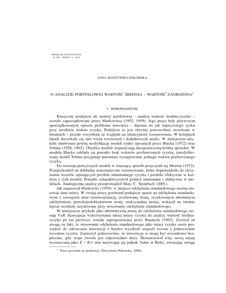 O ANALIZIE PORTFELOWEJ WARTOŚĆ ŚREDNIA – WARTOŚĆ ZAGROŻONA1