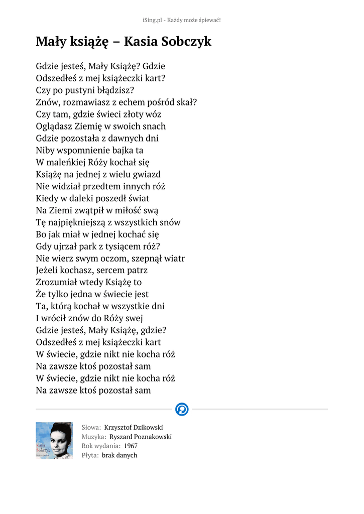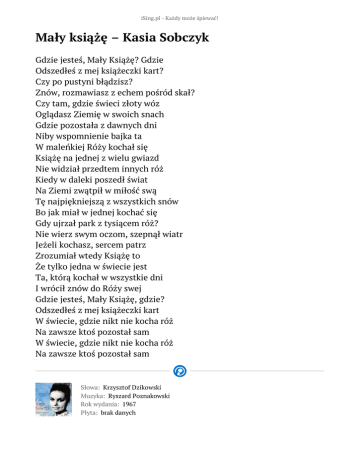iSing.pl - Każdy może śpiewać! Mały książę – Kasia Sobczyk Gdzie jesteś, Mały Książę? Gdzie Odszedłeś z mej książeczki kart? Czy po pustyni błądzisz? Znów, rozmawiasz z echem pośród skał? Czy tam, gdzie świeci złoty wóz Oglądasz Ziemię w swoich snach Gdzie pozostała z dawnych dni Niby wspomnienie bajka ta W maleńkiej Róży kochał się Książę na jednej z wielu gwiazd Nie widział przedtem innych róż Kiedy w daleki poszedł świat Na Ziemi zwątpił w miłość swą Tę najpiękniejszą z wszystkich snów Bo jak miał w jednej kochać się Gdy ujrzał park z tysiącem róż? Nie wierz swym oczom, szepnął wiatr Jeżeli kochasz, sercem patrz Zrozumiał wtedy Książę to Że tylko jedna w świecie jest Ta, którą kochał w wszystkie dni I wrócił znów do Róży swej Gdzie jesteś, Mały Książę, gdzie? Odszedłeś z mej książeczki kart W świecie, gdzie nikt nie kocha róż Na zawsze ktoś pozostał sam W świecie, gdzie nikt nie kocha róż Na zawsze ktoś pozostał sam Słowa: Krzysztof Dzikowski Muzyka: Ryszard Poznakowski Rok wydania: 1967 Płyta: brak danych