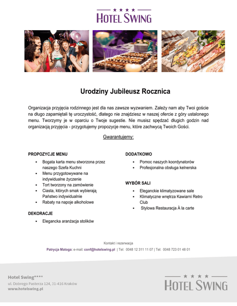 Urodziny Jubileusz Rocznica Organizacja przyjęcia rodzinnego jest dla nas zawsze wyzwaniem. Zależy nam aby Twoi goście na długo zapamiętali tę uroczystość, dlatego nie znajdziesz w naszej ofercie z góry ustalonego menu. Tworzymy je w oparciu o Twoje sugestie. Nie musisz spędzać długich godzin nad organizacją przyjęcia - przygotujemy propozycje menu, które zachwycą Twoich Gości. Gwarantujemy: PROPOZYCJE MENU DODATKOWO Bogata karta menu stworzona przez naszego Szefa Kuchni Menu przygotowywane na indywidualne życzenie Tort tworzony na zamówienie Ciasta, których smak wybierają Państwo indywidualnie Rabaty na napoje alkoholowe Pomoc naszych koordynatorów Profesjonalna obsługa kelnerska WYBÓR SALI Eleganckie klimatyzowane sale Klimatyczne wnętrza Kawiarni Retro Club Stylowa Restauracja À la carte DEKORACJE Elegancka aranżacja stolików Kontakt i rezerwacja Patrycja Matoga: e-mail: [email protected] | Tel: 0048 12 311 11 07 | Tel: 0048 723 01 48 01