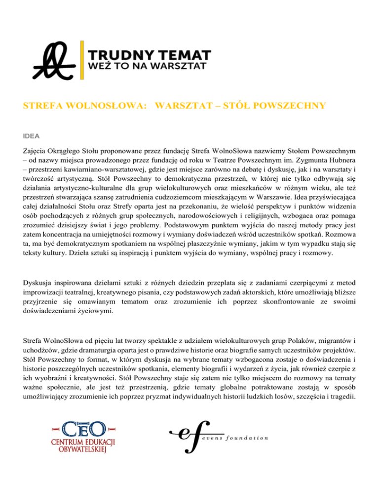 STREFA WOLNOSŁOWA: WARSZTAT – STÓŁ POWSZECHNY IDEA Zajęcia Okrągłego Stołu proponowane przez fundację Strefa WolnoSłowa nazwiemy Stołem Powszechnym – od nazwy miejsca prowadzonego przez fundację od roku w Teatrze Powszechnym im. Zygmunta Hubnera – przestrzeni kawiarniano-warsztatowej, gdzie jest miejsce zarówno na debatę i dyskusję, jak i na warsztaty i twórczość artystyczną. Stół Powszechny to demokratyczna przestrzeń, w której nie tylko odbywają się działania artystyczno-kulturalne dla grup wielokulturowych oraz mieszkańców w różnym wieku, ale też przestrzeń stwarzająca szansę zatrudnienia cudzoziemcom mieszkającym w Warszawie. Idea przyświecająca całej działalności Stołu oraz Strefy oparta jest na przekonaniu, że wielość perspektyw i punktów widzenia osób pochodzących z różnych grup społecznych, narodowościowych i religijnych, wzbogaca oraz pomaga zrozumieć dzisiejszy świat i jego problemy. Podstawowym punktem wyjścia do naszej metody pracy jest zatem koncentracja na umiejętności rozmowy i wymiany doświadczeń wśród uczestników spotkań. Rozmowa ta, ma być demokratycznym spotkaniem na wspólnej płaszczyźnie wymiany, jakim w tym wypadku stają się teksty kultury. Dzieła sztuki są inspiracją i punktem wyjścia do wymiany, wspólnej pracy i rozmowy. Dyskusja inspirowana dziełami sztuki z różnych dziedzin przeplata się z zadaniami czerpiącymi z metod improwizacji teatralnej, kreatywnego pisania, czy podstawowych zadań aktorskich, które umożliwiają bliższe przyjrzenie się omawianym tematom oraz zrozumienie ich poprzez skonfrontowanie ze swoimi doświadczeniami życiowymi. Strefa WolnoSłowa od pięciu lat tworzy spektakle z udziałem wielokulturowych grup Polaków, migrantów i uchodźców, gdzie dramaturgia oparta jest o prawdziwe historie oraz biografie samych uczestników projektów. Stół Powszechny to format, w którym dyskusja na wybrane tematy wzbogacona zostaje o doświadczenia i historie poszczególnych uczestników spotkania, elementy biografii i wydarzeń z życia, jak również czerpie z ich wyobraźni i kreatywności. Stół Powszechny staje się zatem nie tylko miejscem do rozmowy na tematy ważne społecznie, ale jest też przestrzenią, gdzie tematy globalne potraktowane zostają w sposób umożliwiający zrozumienie ich poprzez pryzmat indywidualnych historii ludzkich losów, szczęścia i tragedii. Forma zajęć Stołu Powszechnego umożliwia nie tylko wymianę doświadczeń, historii i wspólną próbę zrozumienia poruszanych tematów, ale również pomaga w zbudowaniu grupy, integracji osób biorących udział w zajęciach. Sprzyja przekraczaniu barier – językowych i kulturowych, związanych z szukaniem porozumienia w różnorodnej grupie. Wspiera w walce z indywidualnymi lękami i ograniczeniami utrudniającymi przekazanie w otwartej dyskusji swoich poglądów, opinii, doświadczeń. Metoda pracy teatralnej Strefy WolnoSłowej oparta jest na przekonaniu, że nie ma na świecie rzeczy, które by nas nie dotyczyły oraz że teatr zmienia przede wszystkim tych, którzy go tworzą. Są to osoby bezpośrednio w niego zaangażowane – twórcy, bądź publiczność, która ma szansę uczestniczyć w interaktywnych przedstawieniach. Stół Powszechny jest zarówno dyskusją, jak i warsztatem, a w określonym kontekście może stać się również swoistym działaniem performatywnym. METODOLOGIA PRACY 1. Temat Pierwszym etapem w zorganizowaniu zajęć metodą Stołu Powszechnego jest wspólne z grupą wybranie tematu, wokół którego prowadzony będzie warsztat. Ważne, aby w wyborze tematu uczestniczyła cała grupa, by mogła zadecydować czy temat, który weźmie na warsztat jest dziś ważny politycznie i społecznie, wzbudza kontrowersje, wywołuje skrajne emocje czy opinie. 2. Inspiracje – research i pierwsze spotkanie warsztatowe Po wybraniu tematu, z którym chcemy się zmierzyć i o którym podyskutować, przechodzimy do skompletowania różnego rodzaju materiałów, jakie wykorzystane zostaną podczas warsztatu i umożliwią spojrzenie na problem z różnych perspektyw. Ten etap pracy jest szczególnie ważny, ponieważ tworzy bazę i inspirację do wszystkich pozostałych działań warsztatowych, a materiałami, które wybierzemy będzie stymulowana dyskusja warsztatu. Dobrze, jeśli materiały pochodzą z różnych źródeł – zarówno z internetu, prasy, dzieł artystycznych, jak i zaczerpnięte są z indywidualnych doświadczeń uczestników (opowieści, wspomnień, zdjęć, sytuacji, jakie zdarzyły się w ich życiu). Jeśli to możliwe, najlepiej, aby w kolekcjonowaniu inspiracji i przygotowaniu materiałów uczestniczyła cała grupa. Na ten etap każdy z uczestników powinien mieć około tygodnia czasu – od momentu, kiedy wybrany został temat warsztatu. Po tygodniu indywidualnych poszukiwań grupa spotyka się na pierwszym warsztacie, gdzie następuje wymiana inspiracji (opowieści, fragmentów tekstów). Następnie wszystkie inspiracje zostają “wrzucone” do jednego worka, z którego prowadzący/prowadząca wybierze do dalszej pracy te, które wzbudziły największe zainteresowanie/kontrowersje/emocje w grupie. Ten etap pracy ma służyć nie tylko zgromadzeniu materiałów do dalszej pracy nad warsztatem, ale również dać szansę uczestnikom na zrobienie swoistego researchu na wybrany temat. Prowadzącym pomaga również w zorientowaniu się, skąd najczęściej młodzi czerpią wiedzę o świecie oraz jakiego rodzaju materiały wybierają jako cenne i opiniotwórcze. Ważne, aby na tym etapie zwracać uwagę na to, czy zebrane materiały pochodzą z rzetelnych źródeł, czy nie są sfabrykowanymi filmikami na youtubie bądź rodzajem politycznej propagandy. Nie znaczy to, że mamy szukać “jedynych słusznych materiałów informacyjnych” – wręcz przeciwnie, przyda się wszystko, co krąży w przestrzeni publicznej na dany temat, ponieważ dzięki