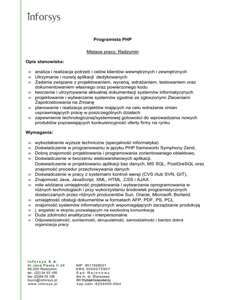 Programista PHP Miejsce pracy: Radzymin Opis stanowiska: • • • • • • • analiza i realizacja potrzeb i celów klientów wewnętrznych i zewnętrznych Utrzymanie i rozwój aplikacji dedykowanych Zadania związane z projektowaniem, wyceną, wdrażaniem, testowaniem oraz dokumentowaniem własnego oraz powierzonego kodu tworzenie i utrzymywanie aktualnej dokumentacji systemów informatycznych projektowanie i wytwarzanie systemów zgodnie ze zgłoszonymi Zleceniami Zapotrzebowania na Zmianę planowanie i realizacja projektów mających na celu wdrażanie zmian usprawniających pracę w poszczególnych działach zapewnienie technologicznej/systemowej gotowości do wprowadzania nowych produktów poprawiających konkurencyjność oferty firmy na rynku Wymagania: • • • • • • • • • wykształcenie wyższe techniczne (specjalność informatyka) Doświadczenie w programowaniu w języku PHP frameworki Symphony Zend, Dobrą znajomość projektowania i programowania zorientowanego obiektowo, Doświadczenie w tworzeniu wielowarstwowych aplikacji, Doświadczenie w projektowaniu aplikacji baz danych, MS SQL, PostGreSQL oraz znajomość procedur przechowywania danych Doświadczenie w pracy z systemami kontroli wersji (CVS i/lub SVN, GIT), Znajomość Java, JavaScript, XML, HTML ,CSS i AJAX mile widziana umiejętność projektowania i wytwarzania oprogramowania w różnych technologiach i przy wykorzystaniu środowisk programistycznych dostarczanych przez różnych producentów Sun, Oracle, Microsoft, Borland. umiejętność obsługi dokumentów w formatach AFP, PDF, PS, PCL znajomość systemów informatycznych wspomagających zarządzanie produkcją • j. angielski w stopniu pozwalającym na swobodną komunikację • Odpowiedzialność, sumienność, skrupulatność, samodzielność i bardzo dobra organizacja pracy • Duże zdolności analityczne i interpersonalne Infors ys S. A. Al.Jana Pawła II 24 05-250 Radzymin tel.: (22) 54 53 100 fax: (22)54 53 126 [email protected] ww w. i nfo rs ys .pl NIP 9511928021 KRS 0000270907 Sąd Rejonowy dla m. st. Warszawy XIV Wydział Gospodarczy kap.zakł.:6254000,00zł Oferowane warunki pracy: • pracę w dynamicznie rozwijającej się firmie, • • • rodzaj umowy: kontrakt, komputer, dostęp do narzędzi, dedykowanego oprogramowania, telefon. Ciekawą pracę w młodym, ambitnym zespole. Aplikacje proszę kierować na adres: [email protected] Infors ys S. A. Al.Jana Pawła II 24 05-250 Radzymin tel.: (22) 54 53 100 fax: (22)54 53 126 [email protected] ww w. i nfo rs ys .pl NIP 9511928021 KRS 0000270907 Sąd Rejonowy dla m. st. Warszawy XIV Wydział Gospodarczy kap.zakł.:6254000,00zł