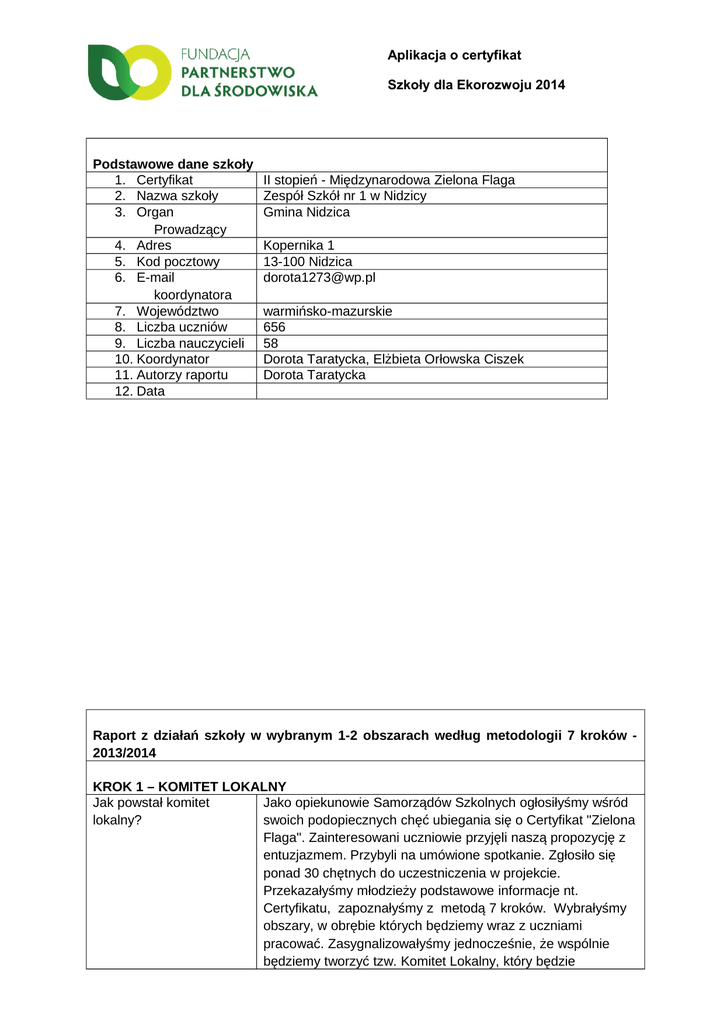 Aplikacja o certyfikat Szkoły dla Ekorozwoju 2014 Podstawowe