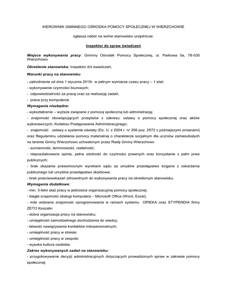 KIEROWNIK GMINNEGO OŚRODKA POMOCY SPOŁECZNEJ W WIERZCHOWIE ogłasza nabór na wolne stanowisko urzędnicze: Inspektor do spraw świadczeń Miejsce wykonywania pracy: Gminny Ośrodek Pomocy Społecznej, ul. Parkowa 5a, 78-530 Wierzchowo Określenie stanowiska: Inspektor d/s świadczeń, Warunki pracy na stanowisku - zatrudnienie od dnia 1 stycznia 2015r w pełnym wymiarze czasu pracy – 1 etat; - wykonywanie czynności biurowych; - odpowiedzialność za pracę oraz za realizację zadań, - praca przy komputerze Wymagania niezbędne: - wykształcenie – wyższe związane z pomocą społeczną lub administracją; - znajomość obowiązujących przepisów z zakresu: ustawy o pomocy społecznej oraz aktów wykonawczych, Kodeksu Postępowania Administracyjnego; - znajomość ustawy o systemie oświaty (Dz. U. z 2004 r. nr 256 poz. 2572 z późniejszymi zmianami) oraz Regulaminu udzielania pomocy materialnej o charakterze socjalnym dla uczniów zamieszkałych na terenie Gminy Wierzchowo uchwalonym przez Radę Gminy Wierzchowo - sumienność, terminowość, rzetelność; - nieposzlakowana opinia, pełna zdolność do czynności prawnych oraz korzystanie z pełni praw publicznych; - brak skazania prawomocnym wyrokiem sądu za umyślne przestępstwo ścigane z oskarżenia publicznego lub umyślne przestępstwo skarbowe; - brak przeciwwskazań zdrowotnych do wykonywania pracy na określonym stanowisku. Wymagania dodatkowe: - min. 3-letni staż pracy w jednostce organizacyjnej pomocy społecznej; - biegła znajomość obsługi komputera – Microsoft Office (Word, Excel), - mile widziana znajomość oprogramowania w ramach systemu OPIEKA oraz STYPENDIA firmy ZETO Koszalin - dobra organizacja pracy na stanowisku; - umiejętność samodzielnego dochodzenia do wiedzy; - łatwość nawiązywania kontaktów interpersonalnych; - umiejętność pracy w stresie; - umiejętność pracy w zespole; - wysoka kultura osobista. Zakres wykonywanych zadań na stanowisku: - przygotowywanie decyzji administracyjnych dotyczących prowadzonych spraw w zakresie pomocy społecznej; - sporządzanie list wypłat , zleceń przelewu na konto, zleceń do wypłaty wszystkich świadczeń przyznanych decyzją administracyjną; - prowadzenie w ramach systemu OPIEKA spraw związanych z przyznawaniem , naliczaniem, sporządzeniem decyzji administracyjnych wydrukiem LIST PŁAC- należnych składek na ubezpieczenie społeczne i zdrowotne, świadczeń pomocy społecznej ; - prowadzenie niezbędnych rejestrów osób korzystających z pomocy społecznej; - bieżące i prawidłowe sporządzanie sprawozdawczości udzielonych świadczeń z pomocy społecznej, również w wersji elektronicznej; - wprowadzanie danych do systemu komputerowego niezbędnych do opracowania decyzji administracyjnej; - przyjmowanie wniosków oraz kompletowanie dokumentacji związanych z przyznaniem pomocy materialnej o charakterze socjalnym. - przygotowanie i prowadzenie dokumentacji zgodnie z ustawą z dnia 7 września 1991 r. o systemie oświaty (Dz. U. z 2004 r. nr 256 poz. 2572 z późniejszymi zmianami) oraz Regulaminem udzielania pomocy materialnej o charakterze socjalnym dla uczniów zamieszkałych na terenie Gminy Wierzchowo uchwalonym przez Radę Gminy Wierzchowo - opracowywanie decyzji administracyjnych stanowiących podstawę do wypłaty lub odmowy wypłaty wnioskowanej pomocy materialnej o charakterze socjalnym. - prowadzenie całości spraw związanych z trybem odwoławczym od decyzji administracyjnych w sprawie pomocy materialnej o charakterze socjalnym. - sporządzanie list wypłat oraz przelewów dla osób otrzymujących. pomoc materialną o charakterze socjalnym. - przestrzeganie terminowości przy sporządzaniu wszelkiej dokumentacji sprawozdawczej . Wymagane dokumenty i oświadczenia: - CV i list motywacyjny; - kserokopia dokumentów potwierdzających wykształcenie oraz potwierdzające posiadane kwalifikacje i umiejętności; - kserokopie dokumentów potwierdzających doświadczenie zawodowe i staż pracy kandydata; - referencje (o ile kandydat jest w ich posiadaniu); - oświadczenie kandydata o korzystaniu z pełni praw publicznych i posiadanej pełnej zdolności do czynności prawnych; - oświadczenie kandydata o niekaralności za umyślne przestępstwo ścigane z oskarżenia publicznego lub umyślne przestępstwo skarbowe; - oświadczenie kandydata o braku przeciwwskazań zdrowotnych do wykonywania pracy na określonym stanowisku; - oświadczenie kandydata o wyrażeniu zgody na przetwarzanie danych osobowych do realizacji procesu naboru zgodnie z ustawą z dnia 29.08.1997 r. o ochronie danych osobowych (Dz. U. z 2002 r. Nr 101, poz. 926 z późn. zm.) W miesiącu poprzedzającym datę upublicznienia ogłoszenia wskaźnik zatrudnienia osób niepełnosprawnych w Gminnym Ośrodku Pomocy Społecznej w Wierzchowie , w rozumieniu przepisów o rehabilitacji zawodowej i społecznej oraz zatrudnianiu osób niepełnosprawnych wynosi mniej niż 6 %. Termin, sposób i miejsce składania dokumentów aplikacyjnych: - termin składania dokumentów: do dnia 16 grudnia 2014roku do godziny 12 00 ; - sposób składania dokumentów aplikacyjnych: w zamkniętej kopercie z dopiskiem: Nabór na stanowisko Inspektora do spraw świadczeń; Przyjmuje się składanie ofert w formie pisemnej dostarczonej do GOPS osobiście lub przysłanie pocztą. Dla oferty przesłanej pocztą terminem wiążącym jest data wpływu do GOPS, a nie data nadania; - miejsce składania ofert: Gminny Ośrodek Pomocy Społecznej w Wierzchowie , ul. Parkowa 5a, 78-530 Wierzchowo Dodatkowe informacje: Osoby spełniające wymagania formalne określone w ogłoszeniu zostaną powiadomione telefonicznie o terminie i miejscu kolejnego etapu rekrutacji. Osoby, które nie spełnią wymagań formalnych nie będą informowane. Informacja o wyniku naboru będzie umieszczona na Biuletynie Informacji Publicznej Gminnego Ośrodka Pomocy Społecznej w Wierzchowie oraz na tablicy informacyjnej w siedzibi
