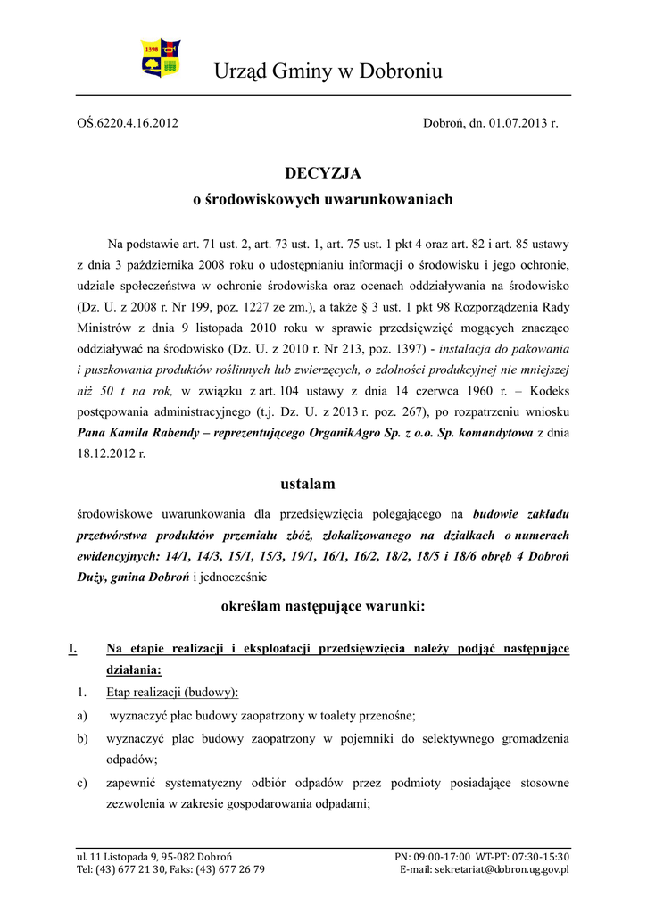 Urząd Gminy w Dobroniu OŚ.6220.4.16.2012 Dobroń, dn. 01.07.2013 r. DECYZJA o środowiskowych uwarunkowaniach Na podstawie art. 71 ust. 2, art. 73 ust. 1, art. 75 ust. 1 pkt 4 oraz art. 82 i art. 85 ustawy z dnia 3 października 2008 roku o udostępnianiu informacji o środowisku i jego ochronie, udziale społeczeństwa w ochronie środowiska oraz ocenach oddziaływania na środowisko (Dz. U. z 2008 r. Nr 199, poz. 1227 ze zm.), a także § 3 ust. 1 pkt 98 Rozporządzenia Rady Ministrów z dnia 9 listopada 2010 roku w sprawie przedsięwzięć mogących znacząco oddziaływać na środowisko (Dz. U. z 2010 r. Nr 213, poz. 1397) - instalacja do pakowania i puszkowania produktów roślinnych lub zwierzęcych, o zdolności produkcyjnej nie mniejszej niż 50 t na rok, w związku z art. 104 ustawy z dnia 14 czerwca 1960 r. – Kodeks postępowania administracyjnego (t.j. Dz. U. z 2013 r. poz. 267), po rozpatrzeniu wniosku Pana Kamila Rabendy – reprezentującego OrganikAgro Sp. z o.o. Sp. komandytowa z dnia 18.12.2012 r. ustalam środowiskowe uwarunkowania dla przedsięwzięcia polegającego na budowie zakładu przetwórstwa produktów przemiału zbóż, zlokalizowanego na działkach o numerach ewidencyjnych: 14/1, 14/3, 15/1, 15/3, 19/1, 16/1, 16/2, 18/2, 18/5 i 18/6 obręb 4 Dobroń Duży, gmina Dobroń i jednocześnie określam następujące warunki: Na etapie realizacji i eksploatacji przedsięwzięcia należy podjąć następujące I. działania: 1. Etap realizacji (budowy): a) wyznaczyć płac budowy zaopatrzony w toalety przenośne; b) wyznaczyć plac budowy zaopatrzony w pojemniki do selektywnego gromadzenia odpadów; c) zapewnić systematyczny odbiór odpadów przez podmioty posiadające stosowne zezwolenia w zakresie gospodarowania odpadami; ul. 11 Listopada 9, 95-082 Dobroń Tel: (43) 677 21 30, Faks: (43) 677 26 79 PN: 09:00-17:00 WT-PT: 07:30-15:30 E-mail: [email protected] d) realizować zasadę ograniczania ilości odpadów i ich negatywnego oddziaływania na środowisko także poprzez prowadzenie następujących działań organizacyjnych: - kontrolowanie ilości wytwarzanych odpadów poprzez prowadzenie ilościowej i jakościowej ewidencji odpadów; - prowadzenie racjonalnej gospodarki materiałami wykorzystywanymi do realizacji robót budowlano - montażowych, w tym w szczególności materiałów izolacyjnych i antykorozyjnych zawierających substancje niebezpieczne; e) ze względu na klimat akustyczny i emisje substancji pyłowych i gazowych należy: - stosować sprzęt budowlany i środki transportu w dobrym stanie technicznym i spełniające wymogi regulowane prawem; - wykonywać roboty budowlane poza godzinami ciszy nocnej; - przestrzegać zasad wyłączania silników w czasie przerw w pracy; - maksymalnie ograniczyć czas budowy poprzez odpowiednie zaplanowanie procesu budowlanego; - stosować środki techniczne i organizacyjne mające na celu ograniczenie emisji pyłu z terenu inwestycji, powstającego podczas prowadzenia prac budowlanych, jak i podczas transportu materiałów budowlanych; f) zorganizować zaplecze budowy w sposób zapewniający zabezpieczenie przed zanieczyszczeniem środowiska gruntowo-wodnego poprzez: - uszczelnienie nawierzchni placów postojowych dla maszyn, środków transportu, parkingów dla pracowników itp. i miejsca awaryjnych napraw sprzętu; - uszczelnienie nawierzchni, gdzie magazynowane będą odpady niebezpieczne, np.: zanieczyszczone grunty; - właściwe gromadzenie odpadów w szczelnych i oznakowanych pojemnikach uniemożliwiających przenikanie substancji niebezpiecznych do gruntu i zabezpieczających przed wpływem czynników atmosferycznych; g) w trakcie wykonywania prac budowlanych warstwę żyzną gleby zdeponować i wykorzystać do zagospodarowania terenu po zakończeniu prac; h) prace przygotowawcze do budowy i prace budowlane należy prowadzić w taki sposób, by uniknąć przypadkowego niszczenia zwierząt (ich jaj, larw, osobników dorosłych); i) inwestycję należy realizować pod nadzorem inwestorskim przyrodniczym; przed rozpoczęciem prac teren inwestycji należy skontrolować na obecność gatunków chronionych w ramach nadzoru inwestorskiego przyrodniczego; j) w przypadku zasiedlenia terenu inwestycji (zwłaszcza istniejących zbiorników dawnych zawodnionych wykopów pod fundamenty) przez gatunki chronione, co powinno zostać zweryfikowane w ramach nadzoru przyrodniczego, przed rozpoczęciem ul. 11 Listopada 9, 95-082 Dobroń Tel: (43) 677 21 30, Faks: (43) 677 26 79 PN: 09:00-17:00 WT-PT: 07:30-15:30 E-mail: [email protected] prac mogących mieć wpływ na te gatunki należy wystąpić o zezwolenie na odstępstwa od zakazów w stosunku do gatunków objętych ochroną; k) wycinkę drzew i krzewów należy przeprowadzić poza sezonem lęgowym ptaków (w terminie od 16 października do końca lutego) lub w terminie innym, ale po uprzedniej kontroli specjalisty ornitologa i pod jego nadzorem - kontrola ma wykazać brak lub obecność lęgów ptaków; w przypadku zasiedlenia zadrzewienia przez chronione gatunki, z wycinką należy wstrzymać się do uzyskania stosownego zezwolenia właściwego organu na odstępstwa od zakazów w stosunku do gatunków objętych ochroną, a wycinkę przeprowadzić zgodnie z warunkami określonymi w tym zezwoleniu; w przypadku drzew i krzewów, których wiek przekrocza 10 lat należy uzyskać stosowne zezwolenie na wycinkę; l) zniszczenie stanowiska roślin podlegających ochronie (objęty ochroną częściową płonnik pospolity zinwentaryzowany na obszarze nr 2) może nastąpić po uzyskaniu zezwolenia właściwego organu na odstępstwa od zakazów w stosunku do gatunków objętych ochroną i zgodnie z warunkami określonymi w tym zezwoleniu; m) likwidację zbiorników (dawnych zawodnionych wykopów pod fundamenty) należy prowadzić pod nadzorem inwestorskim przyrodniczym w terminie sierpień-wrzesień lub w terminie wcześniejszym ale w przypadku obecności gatunków chronionych - po 