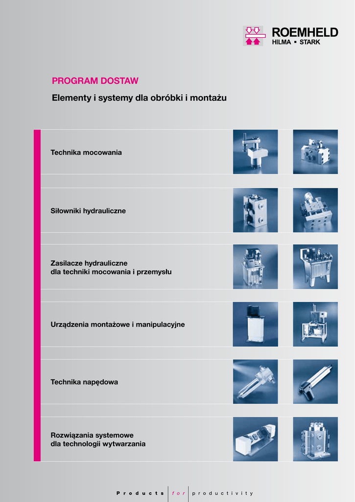 PROGRAM DOSTAW Elementy i systemy dla obróbki i montażu Technika mocowania Siłowniki hydrauliczne Zasilacze hydrauliczne dla techniki mocowania i przemysłu Urządzenia montażowe i manipulacyjne Technika napędowa Rozwiązania systemowe dla technologii wytwarzania Siłowniki hydrauliczne Katalog – Spanntechnik Siłowniki cylindryczne Siłowniki hydrauliczne z cylindrem rurowym Średnice tłoków od 25 do 80 mm Skoki robocze od 60 do 1200 mm Max. ciśnienie robocze 200 / 250 bar Siłowniki uniwersalne Siłowniki hydrauliczne z okrągłą obudową Średnice tłoków od 10 do 63 mm Skoki robocze od 8 do 100 mm Max. ciśnienie robocze od 200 do 500 bar Siłowniki wkręcane Siłowniki hydrauliczne i tłoki do bezpośredniej zabudowy w korpusie urządzenia Średnice tłoków od 4 do 50 mm Skoki robocze od 4 do 40 mm Max. ciśnienie robocze od 160 do 500 bar Siłowniki blokowe Siłowniki z korpusami w kształcie bloku ze stali, aluminium lub brązu Średnice tłoków od 16 do 200 mm Skoki robocze od 8 do 200 mm Max. ciśnienie robocze od 160 do 500 bar Siłowniki z prowadzeniem Siłowniki hydrauliczne z zintegrowanymi prowadnicami i płytą czołową Średnice tłoków od 25 do 100 mm Skoki robocze od 8 do 200 mm Max. ciśnienie robocze 250 / 500 bar Siłowniki z drążonym tłoczyskiem Siłowniki hydrauliczne z otworem przelotowym w tłoczysku lub otworem gwintowanym Średnice tłoków od 20 do 80 mm Skoki robocze od 6 do 40 mm Max. ciśnienie robocze 500 bar Elementy do transferu oleju Katalog – Spanntechnik Złącza obrotowe Sterowalne i niesterowalne złącza obrotowe do transferu oleju w układach obrotowych i wahliwych Max. ciśnienie robocze 250 / 500 bar Sprzęgła Sprzęgła do połączenia i rozłączania hydrauliki, pneumatyki oraz próżni Elementy pojedyncze lub wielokrotne Średnice nominalne 3, 5 i 8 mm Max. ciśnienie robocze od 300 do 500 bar Elementy połączeniowe Złączki i śrubunki, rury precyzyjne, oleje hydrauliczne, manometry, przewody wysokociśnieniowe, akumulatory ciśnienia, wyłączniki ciśnienia Wszystkie siłowniki hydrauliczne znajdziecie Państwo też w naszym katalogu Katalog - Hydraulikzylinder Hydrauliczne elementy mocujące Katalog – Spanntechnik Siłowniki do otworów Siłowniki mocujące do mocowania w otworach Max. siły ciągnące do 9,8 kN Średnice otworów od 7,8 do 46 mm Max. ciśnienie robocze od 50 do 500 bar Adaptacyjne elementy mocujące PosiFlex Elementy mocujące dla adaptacyjnej pozycji lub »pływające« mocowania detali Max. siły mocujące od 5,0 kN do 25,5 kN Skok/zakres mocowania od 4 do 12 mm Max. ciśnienie robocze od 250 do 500 bar Dociski / siłowniki mocujące Hydrauliczne dociski i siłowniki mocujące Max. siły mocujące od 2,2 do 50 kN Skoki mocowania od 3 do 16 mm Max. ciśnienie robocze od 70 do 500 bar Siłowniki/dociski dźwigniowe Elementy mocujące z odchylanym do tyłu ramieniem Max. siły mocujące od 2,2 do 15 kN Skoki mocowania od 3 do 7 mm Max. ciśnienie robocze od 70 do 250 bar Siłowniki/dociski skrętne Elementy mocujące z obrotowym tłokiem Max. siły mocujące od 0,6 do 41,0 kN Skoki mocowania od 6 do 50 mm Max. ciśnienie robocze od 70 do 500 bar Dociski szczękowe Katalog – Spanntechnik Dociski szczękowe Kompaktowe hydrauliczne dociski szczękowe ze szczęką stałą, centrujące lub adaptacyjne Max. siły mocujące od 4 od 15 kN Skoki mocowania od 5 do 45 mm Max. ciśnienie robocze 250 bar Centrujące elementy mocujące Katalog – Spanntechnik Centrujące elementy mocujące Hydraulicznie elementy do centrowania, pozycjonowania i mocowania detali Do mocowania wewnętrznego i zewnętrznego Skoki mocowania od 2,8 do 85 kN Powtarzalność mocowania do ± 0,005 mm Hydrauliczne elementy podporowe Elementy podporowe Hydrauliczne elementy podporowe do podparcia detali Max. obciążenia od 6 do 102 kN Skoki robocze od 6 do 20 mm Max. ciśnienie robocze 500 bar Katalog – Spanntechnik Zasilacze hydrauliczne | dla techniki mocowania i przemysłu Katalog – Spanntechnik Zasilacze hydrauliczne W pełni wyposażone standardowe jednostki zasilające Z pompami zębatymi lub tłokowymi. Programowalne, ze sterowaniem lub skrzynką przyłączeniową Max. przepływ od 0,82 do 24,0 l/min Ciśnienia robocze od 50 do 500 bar Zasilacze powietrzno-olejowe Pneumatycznie zasilane jednostki wytwarzające ciśnienie hydrauliczne Do siłowników jedno- i dwustronnego działania Max. przepływ od 0,85 do 1,5 l/min Max. ciśnienie robocze 500 bar Przekładnie ciśnienia Hydrauliczne oraz pneumatyczno-hydrauliczne przekładnie ciśnienia Do siłowników jedno- i dwustronnego działania Max. ciśnienie wyjściowe 300 do 500 bar Pompy ręczne Pompy zasilające do przyrządów obróbkowych i do wielu innych zastosowań Z dźwignią ręczną lub nożną Przepływ medium od 2 do 12 cm³ na skok Pompy śrubowe z przepływem 21 cm³ na skok Zawory hydrauliczne Katalog – Spanntechnik Zawory hydrauliczne Zawory, zawory zwrotne, zawory motylkowe, hydrauliczne zawory zwrotne, zawory bezpieczeństwa, zawory regulacyjne ciśnienia, zawory sekwencyjne, kombinacje zaworów Elementy pneumatyczne Pneumatyczne dociski skrętne Dociski skrętne w trzech typach aluminiowej obudowy z regulowanymi czujnikami magnetycznymi Max. siła mocowania od 140 do 1400 N Skoki od 7 do 18 mm Max. ciśnienie robocze 7 bar Pneumatyczne złącza obrotowe Sterowalne złącza obrotowe do transferu ciśnienia powietrza w układach obrotowych oraz wahliwych Max. ciśnienie robocze 10 bar Katalog – Spanntechnik Urządzenia montażowe i manipulacyjne Katalog – Montage- und Handhabungstechnik System modułowy modulog Modułu do podnoszenia, obracania, przechylania i przesuwania detali do 1.000 kg Wszystkie moduły są w pełni funkcjonalnymi urządzeniami, które z łatwością mogą być połączone w jednostki wielofunkcyjne. Prasy montażowe Hydrauliczne prasy montażowe z zasilaniem i sterowaniem do wszelkich procesów montażowych i produkcyjnych Ze stoja