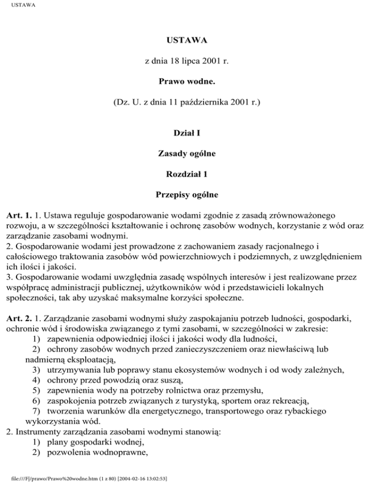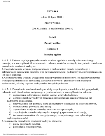 USTAWA z dnia 18 lipca 2001 r. Prawo wodne.