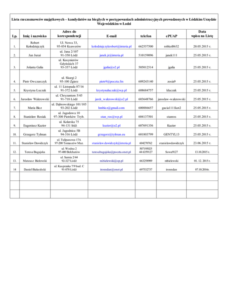 Lp. Imię i nazwisko E-mail telefon ePUAP Lista rzeczoznawców