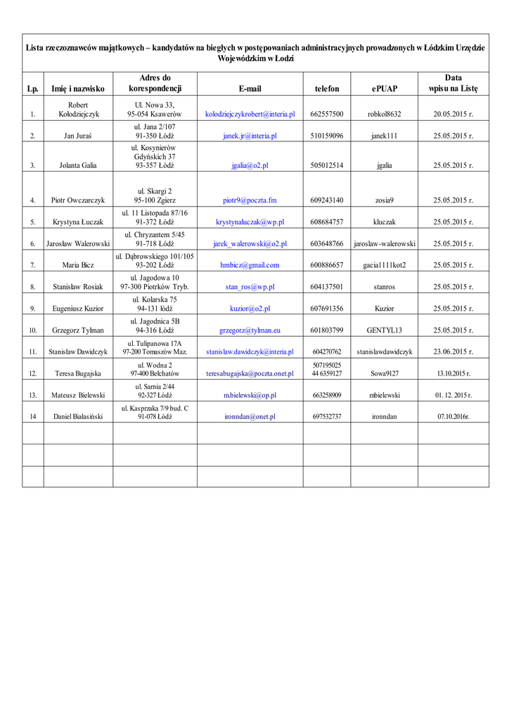 Lista rzeczoznawców majątkowych – kandydatów na biegłych w postępowaniach administracyjnych prowadzonych w Łódzkim Urzędzie Wojewódzkim w Łodzi Lp. Imię i nazwisko Adres do korespondencji E-mail telefon ePUAP Data wpisu na Listę 1. Robert Kołodziejczyk Ul. Nowa 33, 95-054 Ksawerów [email protected] 662557500 robkol8632 20.05.2015 r. [email protected] 510159096 janek111 25.05.2015 r. [email protected] 505012514 jgalia 25.05.2015 r. 2. Jan Juraś 3. Jolanta Galia ul. Jana 2/107 91-350 Łódź ul. Kosynierów Gdyńskich 37 93-357 Łódź 4. Piotr Owczarczyk ul. Skargi 2 95-100 Zgierz [email protected] 609243140 zosia9 25.05.2015 r. 5. Krystyna Łuczak ul. 11 Listopada 87/16 91-372 Łódź [email protected] 608684757 kluczak 25.05.2015 r. 6. Jarosław Walerowski ul. Chryzantem 5/45 91-718 Łódź [email protected] 603648766 jaroslaw-walerowski 25.05.2015 r. 7. Maria Bicz ul. Dąbrowskiego 101/105 93-202 Łódź [email protected] 600886657 gacia1111kot2 25.05.2015 r. 8. Stanisław Rosiak ul. Jagodowa 10 97-300 Piotrków Tryb. [email protected] 604137501 stanros 25.05.2015 r. 9. Eugeniusz Kuzior ul. Kolarska 75 94-131 łódź [email protected] 607691356 Kuzior 25.05.2015 r. 10. Grzegorz Tylman ul. Jagodnica 5B 94-316 Łódź [email protected] 601803799 GENTYL13 25.05.2015 r. 11. Stanisław Dawidczyk ul. Tulipanowa 17A 97-200 Tomaszów Maz. [email protected] 604270762 stanislawdawidczyk 23.06.2015 r. 12. Teresa Bugajska ul. Wodna 2 97-400 Bełchatów [email protected] 507195025 44 6359127 Sowa9127 13.10.2015 r. 13. Mateusz Bielewski ul. Sarnia 2/44 92-327 Łódź [email protected] 663258909 mbielewski 01. 12. 2015 r. 14 Daniel Białasiński ul. Kasprzaka 7/9 bud. C 91-078 Łódź [email protected] 697532737 ironndan 07.10.2016r.