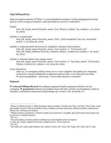 Zapis bibliograficzny: Zapis jest sprawą umowną. W Polsce i w naszej dziedzinie stosujemy zwykle następującą konwencję (proszę zwrócić uwagę na kolejność, znaki przestankowe, kursywę i cudzysłów): książki: Imię_lub_inicjał_autora Nazwisko_autora, Tytuł, Miejsce_wydania1 rok_wydania, s. od_stronydo_strony artykuły w czasopismach: Imię_lub_inicjał_autora Nazwisko_autora, Tytuł, „Tytuł czasopisma” tom, rok, ewentualnie numer2, s. od_strony-do_strony artykuły w wydawnictwach zbiorowych (tj. książkach z tekstami wielu autorów): Imię_lub_inicjał_autora Nazwisko_autora, Tytuł artykułu, w:3 Tytuł książki, red.4 Imię_lub_inicjał_redaktora Nazwisko_redaktora, Miejsce_wydania rok_wydania, s. od_stronydo_strony artykuły w zbiorach studiów tego samego autora: Imię_lub_inicjał_autora Nazwisko_autora, Tytuł artykułu, w:5 Nazwisko_autora6, Tytuł książki, Miejsce_wydania rok_wydania, s. od_strony-do_strony strony internetowe: zdaje się, że wymagania polskiej normy nie są w tym względzie zbyt praktyczne. Proponuję (zwłaszcza w pracach składanych na papierze) podawać adres www tylko jeśli jest krótki. W innych przypadkach – tytuł strony. I zawsze datę odczytu (w nawiasie) Paginacja: W wykazach bibliograficznych nie podajemy paginacji książek; paginacja artykułów nie jest wymagana. W przypisach konieczne jest podanie strony lub stron, na które się powołujemy, chyba że odsyłamy czytelnika do całej pozycji (poprzedzając np. zwrotem: zob., porównaj, cf.). Miejsce wydania piszemy w takim brzmieniu, jak jest podane w książce (np. Paris, nie Paryż. Paryż tylko wtedy, gdy książka wyszła w Paryżu po polsku i Paryż widnieje na stronie tytułowej). Można też podać wydawnictwo (firmę), ale ważniejsze jest miejsce. 2 Podanie numeru czasopisma w ramach rocznika jest konieczne w wypadku, gdy liczbowanie stron rozpoczyna się od nowa w każdym numerze. 3 lub: [w:] 4 lub: pod redakcją. Zamiast podawać redaktora po tytule książki można też napisać: w: Imię_lub_inicjał_redaktora Nazwisko_redaktora (red.), Tytuł książki itd. 5 lub: [w:] 6 lub: Idem, lub: eadem (gdy kobieta), lub: eidem (ci sami), lub: Tenże, lub: Tegoż, lub: Tejże, lub: Ci sami 1 Skróty stosowane w przypisach: 1 Gdy powołujemy się na tego samego autora co poprzednio, ale na inną jego pracę, zamiast imienia i nazwiska piszemy: Idem lub: eadem (gdy kobieta) lub: eidem (ci sami)7, 2 Gdy powołujemy się na tę samą pracę danego autora co poprzednio, ale inne miejsce w tej pracy: Nazwisko_autora, op. cit., s. od_strony-do_strony. 3 Gdy powołujemy się na to samo miejsce w ostatnio cytowanej pracy danego autora: Nazwisko_autora, loc. cit. 4 Gdy w poprzednim przypisie powoływaliśmy się tylko na jedną pracę i teraz powołujemy się na nią znowu: Ibidem*, s. od_strony-do_strony. 5 jw. i do tego powołujemy się na to samo miejsce w tej pracy: Ibidem*. 6 Gdy w ramach jednego artykułu lub rozdziału książki powołujemy się na kilka prac danego autora, należy dla jasności każdorazowo przytoczyć w przypisie początek tytułu danej pracy lub skrót wprowadzony za pierwszym razem, gdy dany tytuł się pojawia. Gdy jedną z tych prac cytujemy kilka razy pod rząd i nie ma możliwości pomyłki, można zrezygnować z przytaczania tytułu. Niekiedy oprócz skrótowego zapisu stosuje się odesłania do przypisu, w którym jest pełny tytuł. Oprac. MZ, 2005-2010 7 * lub: Tenże, Taż sama, Ta sama, Ci sami, lub: Ibid. lub: Tamże lub: jw.