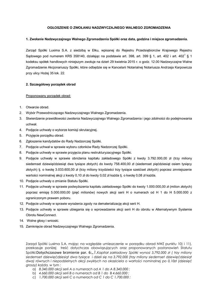OGŁOSZENIE O ZWOŁANIU NADZWYCZAJNEGO WALNEGO ZGROMADZENIA 1. Zwołanie Nadzwyczajnego Walnego Zgromadzenia Spółki oraz data, godzina i miejsce zgromadzenia. Zarząd Spółki Luxima S.A. z siedzibą w Ełku, wpisanej do Rejestru Przedsiębiorców Krajowego Rejestru Sądowego pod numerem KRS 358140, działając na podstawie art. 398, art. 399 § 1, art. 402 i art. 402 1 § 1 kodeksu spółek handlowych niniejszym zwołuje na dzień 29 kwietnia 2015 r. o godz. 12.00 Nadzwyczajne Walne Zgromadzenie Akcjonariuszy Spółki, które odbędzie się w Kancelarii Notarialnej Notariusza Andrzeja Karpowicza przy ulicy Hożej 35 lok. 22. 2. Szczegółowy porządek obrad Proponowany porządek obrad: 1. Otwarcie obrad. 2. Wybór Przewodniczącego Nadzwyczajnego Walnego Zgromadzenia. 3. Stwierdzenie prawidłowości zwołania Nadzwyczajnego Walnego Zgromadzenia i jego zdolności do podejmowania uchwał. 4. Podjęcie uchwały o wyborze komisji skrutacyjnej. 5. Przyjęcie porządku obrad. 6. Zgłoszenie kandydatów do Rady Nadzorczej Spółki. 7. Podjęcie uchwał w sprawie wyboru członków Rady Nadzorczej Spółki. 8. Podjęcie uchwały w sprawie przyjęcia planu restrukturyzacyjnego Spółki. 9. Podjęcie uchwały w sprawie obniżenia kapitału zakładowego Spółki z kwoty 3.792.000,00 zł (trzy miliony siedemset dziewięćdziesiąt dwa tysiące złotych) do kwoty 758.400,00 zł (siedemset pięćdziesiąt osiem tysięcy złotych) tj. o kwotę 3.033.600,00 zł (trzy miliony trzydzieści trzy tysiące sześćset złotych) poprzez zmniejszenie wartości nominalnej akcji z kwoty 0,10 zł do kwoty 0,02 zł każda tj. o kwotę 0,08 zł każda. 10. Podjęcie uchwały o zmianie Statutu Spółki. 11. Podjęcie uchwały w sprawie podwyższenia kapitału zakładowego Spółki do kwoty 1.000.000,00 zł (milion złotych) poprzez emisję 5.000.000,00 (pięć milionów) nowych akcji serii H o numerach od H 1 do H 5.000.000 z ograniczonym prawem poboru. 12. Podjęcie uchwały w sprawie wyrażenia zgody na dematerializację akcji serii H. 13. Podjęcie uchwały w sprawie ubiegania się o wprowadzenie akcji serii H do obrotu w Alternatywnym Systemie Obrotu NewConnect. 14. Wolne głosy i wnioski. 15. Zamknięcie obrad Nadzwyczajnego Walnego Zgromadzenia. Zarząd Spółki Luxima S.A. mając na względzie umieszczenie w porządku obrad NWZ punktu 10) i 11), przekazuje poniżej treść dotychczas obowiązujących oraz proponowanych postanowień Statutu Spółki:Dotychczasowe brzmienie par. 6:„1.Kapitał zakładowy Spółki wynosi 3.792.000 zł ( trzy miliony siedemset dziewięćdziesiąt dwa tysiące i dzieli się na 3.792.000 (trzy miliony siedemset dziewięćdziesiąt dwa) równych i niepodzielnych akcji zwykłych na okaziciela o wartości nominalnej po 0,10zł (dziesięć groszy) każda, w tym : a) 8.340.000 akcji serii A o numerach od A 1 do A 8.340.000 ; b) 4.660.000 akcji serii B o numerach od B 1 do B 4.660.000 ; c) 1.700.000 akcji serii C o numerach od C 1 do C 1.700.000 ; d) 1.700.000 akcji serii D o numerach od D 1 do D 1.700.000 ; e) 16.400.000 akcji serii F o numerach od F 1 do F 16.400.000 ; f) 5.120.000 akcji serii G o numerach od G 1 do G 5.120.000. 2.Kapitał zakładowy Społki zostaje warunkowo podwyższony o kwotę nie więcej niż 170.000 zł ( słownie: sto siedemdziesiąt tysięcy złotych ) poprzez emisję nie więcej niż 1.700.000 ( jeden milion siedemset tysięcy ) akcji zwykłych na okaziciela serii E o wartosci nominalnej 0.10 zł ( dziieść groszy ) każda. 3.Warunkowe podwyższenie kapitału zakąłdowego spółki, o którym mowa w ust.1 powyżej zostało dokonane celem przyznania praw do objćeia akcji posiadaczom warrantów subskrypcyjnych serii A wyemitowanych na podstawie uchwały Nadzwyczajnego Walnego Zgromadzenia znr 3 z dnia 24 września 2010. 4.Spółka ma prawo emitować akcje imienne i akcje na okaziciela. 5. Zebranie kapitału akcyjnego następuje poprzez objęcie akcji przez założycieli Spółki. 6.Zamiana akcji imiennych na okaziciela jest dopuszczalna za żadanie akcjonariusza za zgodą Rady Nadzorczej. 7.Kapiatał zakładowy może być pokryty wkładem pieniężnym lub niepieniężnym. 8.Kwota wpłacona na pokrycie kapitału zakładowego przed zarejestrowaniem Spółki wynosi 834.000 ( osiemset trzydzieści cztery tysiące ) złotych. Proponowane brzmienie par. 6: 1.„Kapitał zakładowy Spółki wynosi 758.400,00 zł (siedemset pięćdziesiąt osiem tysięcy czterysta złotych) i dzieli się na 3.792.000 (trzy miliony siedemset dziewięćdziesiąt dwa) równych i niepodzielnych akcji zwykłych na okaziciela o wartości nominalnej po 0,02 zł (dwa grosze) każda, w tym : g) 8.340.000 akcji serii A o numerach od A 1 do A 8.340.000 ; h) 4.660.000 akcji serii B o numerach od B 1 do B 4.660.000 ; i) 1.700.000 akcji serii C o numerach od C 1 do C 1.700.000 ; j) 1.700.000 akcji serii D o numerach od D 1 do D 1.700.000 ; k) 16.400.000 akcji serii F o numerach od F 1 do F 16.400.000 ; 5.120.000 akcji serii G o numerach od G 1 do G 5.120.000. 2..Spółka ma prawo emitować akcje imienne i akcje na okaziciela 3. Zebranie kapitału akcyjnego następuje poprzez objęcie akcji przez założycieli Spółki. l) 4.Zamiana akcji imiennych na okaziciela jest dopuszczalna za żadanie akcjonariusza za zgodą Rady Nadzorczej. m) 5.Kapiatał zakładowy może być pokryty wkładem pieniężnym lub niepieniężnym. n) 6.Kwota wpłacona na pokrycie kapitału zakładowego przed zarejestrowaniem Spółki wynosi 834.000 ( osiemset trzydzieści cztery tysiące ) złotych. Opis procedur uczestnictwa i wykonywania prawa głosu a) Prawo do żądania umieszczenia określonych spraw w porządku obrad Akcjonariusz lub akcjonariusze reprezentujący co najmniej 1/20 kapitału zakładowego mogą żądać umieszczenia określonych spraw w porządku obrad tego zgromadzenia. Żądanie takie winno być przesłane do Spółki na piśmie bądź w postaci elektronicznej na skrzynkę e-mail: [email protected] w jęz