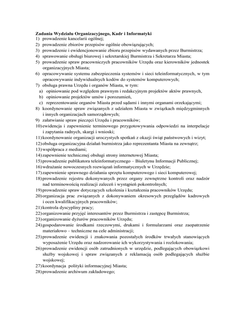 Zadania Wydziału Organizacyjnego, Kadr i Informatyki 1) prowadzenie kancelarii ogólnej; 2) prowadzenie zbiorów przepisów ogólnie obowiązujących; 3) prowadzenie i ewidencjonowanie zbioru przepisów wydawanych przez Burmistrza; 4) sprawowanie obsługi biurowej i sekretarskiej Burmistrza i Sekretarza Miasta; 5) prowadzenie spraw pracowniczych pracowników Urzędu oraz kierowników jednostek organizacyjnych Miasta; 6) opracowywanie systemu zabezpieczenia systemów i sieci teleinformatycznych, w tym opracowywanie indywidualnych kodów do systemów komputerowych; 7) obsługa prawna Urzędu i organów Miasta, w tym: a) opiniowanie pod względem prawnym i redakcyjnym projektów aktów prawnych, b) opiniowanie projektów umów i porozumień, c) reprezentowanie organów Miasta przed sądami i innymi organami orzekającymi; 8) koordynowanie spraw związanych z udziałem Miasta w związkach międzygminnych i innych organizacjach samorządowych; 9) załatwianie spraw pieczęci Urzędu i pracowników; 10) ewidencja i zapewnienie terminowego przygotowywania odpowiedzi na interpelacje i zapytania radnych, skargi i wnioski; 11) koordynowanie organizacji uroczystych spotkań z okazji świąt państwowych i wizyt; 12) obsługa organizacyjna działań burmistrza jako reprezentanta Miasta na zewnątrz; 13) współpraca z mediami; 14) zapewnienie technicznej obsługi strony internetowej Miasta; 15) prowadzenie publikatora teleinformatycznego – Biuletynu Informacji Publicznej; 16) wdrażanie nowoczesnych rozwiązań informatycznych w Urzędzie; 17) zapewnienie sprawnego działania sprzętu komputerowego i sieci komputerowej; 18) prowadzenie rejestru dokonywanych przez organy zewnętrzne kontroli oraz nadzór nad terminowością realizacji zaleceń i wystąpień pokontrolnych; 19) prowadzenie spraw dotyczących szkolenia i kształcenia pracowników Urzędu; 20) organizacja prac związanych z dokonywaniem okresowych przeglądów kadrowych i ocen kwalifikacyjnych pracowników; 21) kontrola dyscypliny pracy; 22) organizowanie przyjęć interesantów przez Burmistrza i zastępcę Burmistrza; 23) organizowanie dyżurów pracowników Urzędu; 24) gospodarowanie środkami rzeczowymi, drukami i formularzami oraz zaopatrzenie materiałowo – techniczne na cele administracji; 25) prowadzenie ewidencji i znakowania pozostałych środków trwałych stanowiących wyposażenie Urzędu oraz nadzorowanie ich wykorzystywania i rozlokowania; 26) prowadzenie ewidencji osób zatrudnionych w urzędzie, podlegających obowiązkowi służby wojskowej i spraw związanych z reklamacją osób podlegających służbie wojskowej; 27) koordynacja polityki informacyjnej Miasta; 28) prowadzenie archiwum zakładowego; 29) prowadzenie spraw związanych z zarządzaniem budynkami administracyjnymi, gospodarczymi i garażami oraz gospodarowaniem lokalami biurowymi i mieszkaniem zakładowym Urzędu; 30) ochrona fizyczna budynku Urzędu; 31) współpraca z Powiatowym Urzędem Pracy w zakresie zatrudniania w Urzędzie pracowników w ramach prac interwencyjnych, robót publicznych i odbywania staży absolwenckich; 32) prowadzenie centralnej ewidencji umów, których stroną jest Miasto; 33) prowadzenie stałego monitoringu funduszy Unii Europejskiej i innych podobnych źródeł finansowania ( dotacji, pożyczek, kredytów) w zakresie możliwości realizacji zadań Miasta; 34) wskazywanie finansowych i organizacyjno – prawnych możliwości zapewnienia środków dla realizacji inwestycji wynikających z przyjętych priorytetów; 35) koordynowanie działań w zakresie przygotowywania wniosków aplikacyjnych o uzyskanie środków z funduszy unijnych; 36) koordynacja realizacji zawartych umów na dofinansowanie projektów z funduszy unijnych.