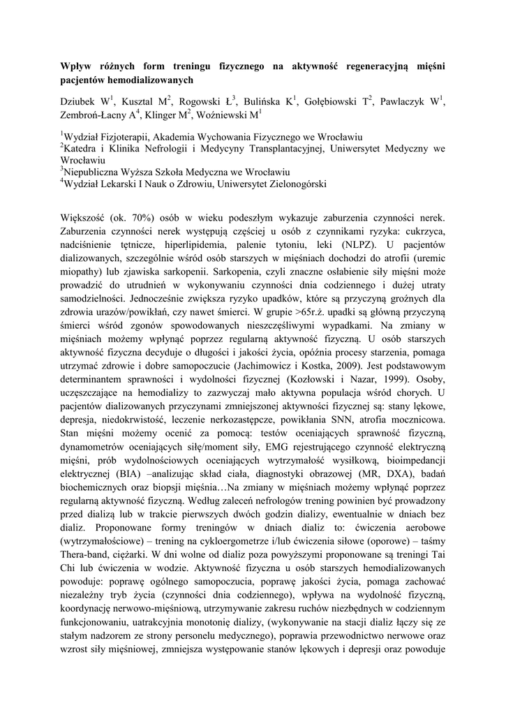 Wpływ różnych form treningu fizycznego na aktywność regeneracyjną mięśni pacjentów hemodializowanych Dziubek W1, Kusztal M2, Rogowski Ł3, Bulińska K1, Gołębiowski T2, Pawlaczyk W1, Zembroń-Łacny A4, Klinger M2, Woźniewski M1 1 Wydział Fizjoterapii, Akademia Wychowania Fizycznego we Wrocławiu Katedra i Klinika Nefrologii i Medycyny Transplantacyjnej, Uniwersytet Medyczny we Wrocławiu 3 Niepubliczna Wyższa Szkoła Medyczna we Wrocławiu 4 Wydział Lekarski I Nauk o Zdrowiu, Uniwersytet Zielonogórski 2 Większość (ok. 70%) osób w wieku podeszłym wykazuje zaburzenia czynności nerek. Zaburzenia czynności nerek występują częściej u osób z czynnikami ryzyka: cukrzyca, nadciśnienie tętnicze, hiperlipidemia, palenie tytoniu, leki (NLPZ). U pacjentów dializowanych, szczególnie wśród osób starszych w mięśniach dochodzi do atrofii (uremic miopathy) lub zjawiska sarkopenii. Sarkopenia, czyli znaczne osłabienie siły mięśni może prowadzić do utrudnień w wykonywaniu czynności dnia codziennego i dużej utraty samodzielności. Jednocześnie zwiększa ryzyko upadków, które są przyczyną groźnych dla zdrowia urazów/powikłań, czy nawet śmierci. W grupie >65r.ż. upadki są główną przyczyną śmierci wśród zgonów spowodowanych nieszczęśliwymi wypadkami. Na zmiany w mięśniach możemy wpłynąć poprzez regularną aktywność fizyczną. U osób starszych aktywność fizyczna decyduje o długości i jakości życia, opóźnia procesy starzenia, pomaga utrzymać zdrowie i dobre samopoczucie (Jachimowicz i Kostka, 2009). Jest podstawowym determinantem sprawności i wydolności fizycznej (Kozłowski i Nazar, 1999). Osoby, uczęszczające na hemodializy to zazwyczaj mało aktywna populacja wśród chorych. U pacjentów dializowanych przyczynami zmniejszonej aktywności fizycznej są: stany lękowe, depresja, niedokrwistość, leczenie nerkozastępcze, powikłania SNN, atrofia mocznicowa. Stan mięśni możemy ocenić za pomocą: testów oceniających sprawność fizyczną, dynamometrów oceniających siłę/moment siły, EMG rejestrującego czynność elektryczną mięśni, prób wydolnościowych oceniających wytrzymałość wysiłkową, bioimpedancji elektrycznej (BIA) –analizując skład ciała, diagnostyki obrazowej (MR, DXA), badań biochemicznych oraz biopsji mięśnia…Na zmiany w mięśniach możemy wpłynąć poprzez regularną aktywność fizyczną. Według zaleceń nefrologów trening powinien być prowadzony przed dializą lub w trakcie pierwszych dwóch godzin dializy, ewentualnie w dniach bez dializ. Proponowane formy treningów w dniach dializ to: ćwiczenia aerobowe (wytrzymałościowe) – trening na cykloergometrze i/lub ćwiczenia siłowe (oporowe) – taśmy Thera-band, ciężarki. W dni wolne od dializ poza powyższymi proponowane są treningi Tai Chi lub ćwiczenia w wodzie. Aktywność fizyczna u osób starszych hemodializowanych powoduje: poprawę ogólnego samopoczucia, poprawę jakości życia, pomaga zachować niezależny tryb życia (czynności dnia codziennego), wpływa na wydolność fizyczną, koordynację nerwowo-mięśniową, utrzymywanie zakresu ruchów niezbędnych w codziennym funkcjonowaniu, uatrakcyjnia monotonię dializy, (wykonywanie na stacji dializ łączy się ze stałym nadzorem ze strony personelu medycznego), poprawia przewodnictwo nerwowe oraz wzrost siły mięśniowej, zmniejsza występowanie stanów lękowych i depresji oraz powoduje lepsze funkcjonowanie psychospołeczne. Badania w ramach projektu z NCN nr 2011/03/B/NZ7/01764 pt. „Wpływ treningu fizycznego na aktywność regeneracyjną mięśni u pacjentów hemodializowanych”.