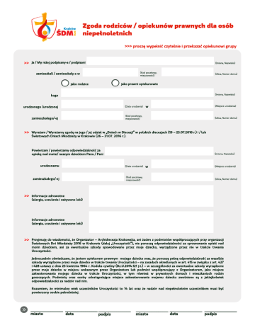 Zgoda rodziców / opiekunów prawnych dla osób niepełnoletnich >>> proszę wypełnić czytelnie i przekazać opiekunowi grupy >> Ja / My niżej podpisany-a / podpisani (Imiona, Nazwisko) (Kod pocztowy, miejscowość) zamieszkali / zamieszkały-a w jako rodzice jako prawni opiekunowie (Imiona, Nazwisko) kogo urodzonego /urodzonej (Data urodzenia) zamieszkałego/-ej (Kod pocztowy, miejscowość) >> w (Miejsce urodzenia) (Ulica, Numer domu) Wyrażam / Wyrażamy zgodę na jego / jej udział w „Dniach w Diecezji“ w polskich diecezjach (19 – 25.07.2016 r.) i / lub Światowych Dniach Młodzieży w Krakowie (26 – 31.07. 2016 r.). Powierzam / powierzamy odpowiedzialność za opiekę nad moim/ naszym dzieckiem Panu / Pani >> (Ulica, Numer domu) (Imiona, Nazwisko) urodzonemu (Data urodzenia) zamieszkałego/-ej (Kod pocztowy, miejscowość) w (Miejsce urodzenia) (Ulica, Numer domu) Informacje zdrowotne (alergia, uczulenia i zażywane leki) Informacje zdrowotne (alergia, uczulenia i zażywane leki) >> Przyjmuję do wiadomości, że Organizator – Archidiecezja Krakowska, ani żaden z podmiotów współpracujących przy organizacji Światowych Dni Młodzieży 2016 w Krakowie (dalej „Uroczystość“), nie ponoszą odpowiedzialności za sprawowanie opieki nad moim dzieckiem, ani za ewentualne szkody spowodowane przez moje dziecko, wyrządzone przez nie w trakcie trwania Uroczystości. Jednocześnie oświadczam, że jestem opiekunem prawnym mojego dziecka oraz, że ponoszę pełną odpowiedzialność za wszelkie szkody wyrządzone przez moje dziecko w trakcie trwania Uroczystości – na zasadach określonych w art. 415 w związku z art. 427 i 428 ustawy z dnia 23 kwietnia 1964 r. Kodeks cywilny (Dz.U.2014.121 j.t.) – w szczególności za ewentualne szkody wyrządzone przez moje dziecko w miejscu wskazanym przez Organizatora lub podmiot współpracujący z Organizatorem, jako miejsce zakwaterowania mojego dziecka w trakcie Uroczystości, w tym również w prywatnych domach i mieszkaniach rodzin goszczących. Podmioty oraz osoby udostępniające miejsce zakwaterowania mojemu dziecku zwolnione są z jakiejkolwiek odpowiedzialności za nadzór nad nim. Rozumiem, że minimalny wiek uczestników Uroczystości to 14 lat oraz że nadzór nad niepełnoletnim uczestnikiem musi być powierzony osobie pełnoletniej. ________________ ________________ ________________ miasto data podpis ________________ ________________ ________________ data podpis miasto
