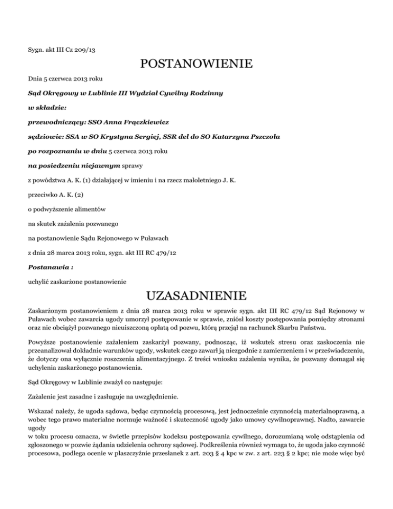 Sygn. akt III Cz 209/13 POSTANOWIENIE Dnia 5 czerwca 2013 roku Sąd Okręgowy w Lublinie III Wydział Cywilny Rodzinny w składzie: przewodniczący: SSO Anna Frączkiewicz sędziowie: SSA w SO Krystyna Sergiej, SSR del do SO Katarzyna Pszczoła po rozpoznaniu w dniu 5 czerwca 2013 roku na posiedzeniu niejawnym sprawy z powództwa A. K. (1) działającej w imieniu i na rzecz małoletniego J. K. przeciwko A. K. (2) o podwyższenie alimentów na skutek zażalenia pozwanego na postanowienie Sądu Rejonowego w Puławach z dnia 28 marca 2013 roku, sygn. akt III RC 479/12 Postanawia : uchylić zaskarżone postanowienie UZASADNIENIE Zaskarżonym postanowieniem z dnia 28 marca 2013 roku w sprawie sygn. akt III RC 479/12 Sąd Rejonowy w Puławach wobec zawarcia ugody umorzył postępowanie w sprawie, zniósł koszty postępowania pomiędzy stronami oraz nie obciążył pozwanego nieuiszczoną opłatą od pozwu, którą przejął na rachunek Skarbu Państwa. Powyższe postanowienie zażaleniem zaskarżył pozwany, podnosząc, iż wskutek stresu oraz zaskoczenia nie przeanalizował dokładnie warunków ugody, wskutek czego zawarł ją niezgodnie z zamierzeniem i w przeświadczeniu, że dotyczy ona wyłącznie roszczenia alimentacyjnego. Z treści wniosku zażalenia wynika, że pozwany domagał się uchylenia zaskarżonego postanowienia. Sąd Okręgowy w Lublinie zważył co następuje: Zażalenie jest zasadne i zasługuje na uwzględnienie. Wskazać należy, że ugoda sądowa, będąc czynnością procesową, jest jednocześnie czynnością materialnoprawną, a wobec tego prawo materialne normuje ważność i skuteczność ugody jako umowy cywilnoprawnej. Nadto, zawarcie ugody w toku procesu oznacza, w świetle przepisów kodeksu postępowania cywilnego, dorozumianą wolę odstąpienia od zgłoszonego w pozwie żądania udzielenia ochrony sądowej. Podkreślenia również wymaga to, że ugoda jako czynność procesowa, podlega ocenie w płaszczyźnie przesłanek z art. 203 § 4 kpc w zw. z art. 223 § 2 kpc; nie może więc być sprzeczna z prawem, z zasadami współżycia społecznego ani też zmierzać do obejścia prawa. W każdym wypadku zawarcie ugody podlega kontroli Sądu, analogicznie jak w razie cofnięcia pozwu i zrzeczenia się roszczenia. W niniejszej sprawie, przedstawicielka małoletniego powoda domagała się podwyższenia zasądzonych od pozwanego alimentów. Na rozprawie w dniu 28 marca 2013 roku strony zawarły ugodę, w której pozwany zobowiązał się do łożenia na rzecz swojego małoletniego syna alimentów podwyższonych do kwoty po 450 zł miesięcznie jak również zobowiązał się odwozić małoletniego syna z miejsca zamieszkania na zajęcia karate w godzinach 19.30 do godziny 22.00 do bursy przy ul. (...) w P. i z powrotem do miejsca zamieszkania małoletniego w dniach: poniedziałek, środa, czwartek każdego tygodnia zaś przedstawicielka małoletniego wyraziła na to zgodę. W tym miejscu wskazać należy, że każda strona, aż do uprawomocnienia się postanowienia o umorzeniu postępowania wydanego wobec zawarcia ugody może odwołać ugodę jako czynność procesową. Jednakże podkreślić trzeba, że środki prawne służące zniweczeniu skutków ugody są sformalizowane i wymagają istnienia określonych przesłanek, jest to bowiem dwustronna czynność prawna, podlegająca ochronie. Uchylenie się od skutków materialnoprawnych uzależniona jest od wykazania wady oświadczenia woli ujawnionej w uzasadnieniu zażalenia na umorzenie postępowania lub poprzez wykazanie, że ugoda została zawarta w sprzeczności z prawem, zasadami współżycia społecznego lub, że zmierzała do obejścia prawa. W przedmiotowej sprawie, Sąd Rejonowy zajął stanowisko, że ugoda spełnia wszelkie wymagania jak również, że strony zapoznały się z jej treścią przed złożeniem podpisów. Nie można się zgodzić ze stanowiskiem Sądu. Podnieść należy, że w treści ugody rozstrzygnięte zostało roszczenie niezgłoszone w pozwie. Nadto, z treści protokołu rozprawy z dnia 28 marca 2013 roku wynika wyłącznie, że pozwany uznał powództwo do kwoty po 450 zł poczynając od dnia 1 maja 2013 roku zaś przedstawicielka małoletniego powoda oświadczyła, że wyraża zgodę na alimenty w kwocie po 450 zł miesięcznie. Istotę zawartej ugody stanowić zatem powinno wyłącznie roszczenie alimentacyjne wyrażone w kwocie po 450 zł miesięcznie. Tymczasem, treść ugody reguluje także obowiązek pozwanego odwożenia i przywożenia syna z zajęć karate trzy razy w tygodniu. Sąd Rejonowy w tym zakresie podał w uzasadnieniu zaskarżonego postanowienia, iż „Pozwany deklarował gotowość zawożenia małoletniego osobiście na zajęcia karate podając, że woził już syna przez pół roku na treningi karate”. Jednakże takie oświadczenie pozwanego nie jest zawarte w treści protokołów z rozpraw z dnia 26 listopada 2012 roku jak i z dnia 28 marca 2013 roku jak również nie wynika ono z żadnego ze składanych przez pozwanego pism procesowych. W protokole z dnia 26 listopada 2012 roku widnieje jedynie zapis wyjaśnień pozwanego o treści „Woziłem syna przez pół roku na karate”. Zadaniem protokołu jest wierne odtworzenie przebiegu posiedzenia i przeprowadzonych na nim czynności. W szczególności protokół sporządzony pisemnie powinien zawierać wymienienie zarządzeń i orzeczeń wydanych na posiedzeniu oraz stwierdzenie, czy zostały ogłoszone, a także czynności stron wpływające na rozstrzygnięcie sądu (ugoda, zrzeczenie się roszczenia, uznanie powództwa, cofnięcie, zmiana, rozszerzenie lub ograniczenie żądania pozwu) oraz inne czynności stron, które według szczególnych przepisów ustawy powinny być wciągnięte, wpisane, przyjęte, złożone, zgłoszone lub wniesione do protokołu – art. 158 § 1 zd. 2 kpc. Wobec tego, że ewentualne zobowiązanie się pozwanego do wożenia syna na zajęcia karate trzykrotnie w ciągu każdego tygodn