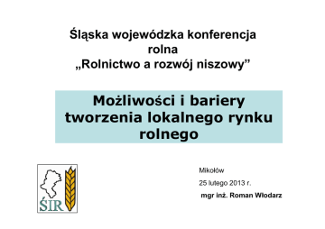 Śląska wojewódzka konferencja rolna „Rolnictwo a rozwój niszowy” Możliwości i bariery tworzenia lokalnego rynku rolnego Mikołów 25 lutego 2013 r. mgr inż. Roman Włodarz • Zarówno w Europie, jak i na świecie obserwuje się spadek udziału rolników w cenach detalicznych produktów finalnych. Jest to zazwyczaj spowodowane wzrostem stopnia przetwarzania i związaną z tym wartością dodatnią artykułów spożywczych oraz rosnącymi wydatkami marketingowymi • Przyczyną spadku udziału rolników w cenie detalicznej było pogłębianie przetwórstwa, wzrost wartości dodanej, uatrakcyjnianie opakowań, rosnące koszty marketingu i sprzedaży, a przede wszystkim zmniejszanie ilości surowca w produkcie finalnym. Przyczyną jest także znaczna przewaga rynkowa handlu i przetwórstwa w stosunku do producentów rolnych. Jest to zjawisko powszechnie znane w krajach o rozwiniętej gospodarce rynkowej. • Na poziom cen, jakie rolnicy otrzymują przy niezorganizowanych rynkach rolnych, wpływ mają pośrednicy, którzy skutecznie zaniżają ceny, a sobie naliczają wysokie marże handlowe, niejednokrotnie przewyższające cenę, jaką płacą producentowi. Im więcej jest pośredników w łańcuchu od producenta do konsumenta, tym wyższa ostateczna cena. W tych warunkach należy skracać ten łańcuch i wchodzić w kooperację poziomą i pionową. Maleje udział rolnika w cenie końcowej produktu spożywczego • Rolnik jest pierwszym i coraz słabszym ogniwem łańcucha agrobiznesu. Dostarcza podstawowych produktów, jakim są surowce rolne, i najmniej na nich zarabia. W gotowym produkcie, np. w chlebie, tylko ok.. 15% jego ceny końcowej jest udziałem rolnika, czyli kosztem zboża. • Jednym ze sposobów na zwiększenie dochodów rolniczych szczególnie w małych gospodarstwach jest przechwytywanie marży przetwórczej i handlowej – czyli pominięcie pośredników w łańcuchu żywnościowym. ROZPORZĄDZENIE PARLAMENTU EUROPEJSKIEGO I RADY w sprawie wsparcia rozwoju obszarów wiejskich przez Europejski Fundusz Rolny na rzecz Rozwoju Obszarów Wiejskich (EFRROW) • Wsparcie horyzontalnej i wertykalnej współpracy między podmiotami łańcucha dostaw oraz wsparcie działań promocyjnych w kontekście lokalnym powinno być katalizatorem racjonalnego gospodarczo rozwoju krótkich łańcuchów dostaw, rynków lokalnych i lokalnych łańcuchów żywnościowych. ROZPORZĄDZENIE PARLAMENTU EUROPEJSKIEGO I RADY w sprawie wsparcia rozwoju obszarów wiejskich przez Europejski Fundusz Rolny na rzecz Rozwoju Obszarów Wiejskich (EFRROW) - cytat • Art.. 2 t) „krótki łańcuch dostaw”: łańcuch dostaw, który obejmuje ograniczoną liczbę podmiotów gospodarczych zaangażowanych we współpracę, przynosi lokalny rozwój gospodarczy oraz charakteryzuje się ścisłymi związkami geograficznymi i społecznymi między producentami i konsumentami; [PROJEKT] ROZPORZĄDZENIE PARLAMENTU EUROPEJSKIEGO I RADY w sprawie wsparcia rozwoju obszarów wiejskich przez Europejski Fundusz Rolny na rzecz Rozwoju Obszarów Wiejskich (EFRROW) • • • Zgodnie ze strategią „Europa 2020” te ogólne cele wsparcia rozwoju obszarów wiejskich na lata 2014-2020 są w bardziej szczegółowy sposób wyrażone w następujących sześciu priorytetach ogólnounijnych: – ułatwianie transferu wiedzy i innowacji w rolnictwie i leśnictwie oraz na obszarach wiejskich; – poprawa konkurencyjności wszystkich rodzajów gospodarki rolnej i zwiększenie rentowności gospodarstw rolnych; • – poprawa organizacji łańcucha żywnościowego i promowanie zarządzania ryzykiem w rolnictwie; • • • odtwarzanie, chronienie i wzmacnianie ekosystemów zależnych od rolnictwa i leśnictwa; – wspieranie efektywnego gospodarowania zasobami i przechodzenia na gospodarkę niskoemisyjną i odporną na zmianę klimatu w sektorach rolnym, spożywczym i leśnym; – zwiększanie włączenia społecznego, ograniczenie ubóstwa i promowanie rozwoju gospodarczego na obszarach wiejskich. • System aktów prawnych regulujących kwestie prowadzenia działalności w zakresie rolnictwa i przetwórstwa jest niezwykle skomplikowany i złożony i dla przeciętnej, dla średnio wyedukowanej osoby właściwie niedostępny. • Powoduje to, że przeciętny rolnik – „gospodarz”, nie jest w stanie w tym systemie się odnaleźć. • Przepisy są wyraźnie skonstruowane „pod” dużych producentów i stąd tworzą wysoką kompetencyjną i finansowa barierę wejścia na rynek produktów lokalnych dla większości lokalnych producentów. Podstawowe pojęcia związane ze sprzedażą bezpośrednią -produkcja pierwotna - produkcja, uprawa lub hodowla produktów podstawowych, w tym zbiory, dojenie i hodowlę zwierząt gospodarskich przed ubojem, oznacza także łowiectwo i rybołówstwo oraz zbieranie runa leśnego; -dostawca bezpośredni – producent małych ilości żywności nieprzetworzonej, sprzedawanej konsumentowi finalnemu na targowiskach, placach targowych, w bramach własnych gospodarstw rolnych, handlu obwoźnym, jak również lokalnym sklepom i zakładom gastronomicznym; -konsument finalny - ostateczny konsument środka spożywczego, który nie wykorzystuje żywności w ramach działalności przedsiębiorstwa sektora żywnościowego. Co to jest sprzedaż bezpośrednia ? • Rolnik może sprzedawać konsumentowi bezpośrednio tj. bez rejestrowania działalności gosp. i płacenia podatków produkty produkcji pierwotnej pochodzenia roślinnego i zwierzęcego. Co się mieści w bezpośredniej sprzedaży? • W obowiązującym stanie prawnym rolnicy mogą wytwarzać i następnie sprzedawać, bez konieczności rejestrowania działalności gospodarczej i płacenia podatku dochodowego od osób fizycznych, jedynie nieprzetworzone produkty roślinne i zwierzęce, a sprzedaż przetworzonej żywności odbywa się obecnie poza legalnym obrotem, w tzw. szarej strefie. Rodzaje sprzedaży bezpośredniej • model klasyczny b