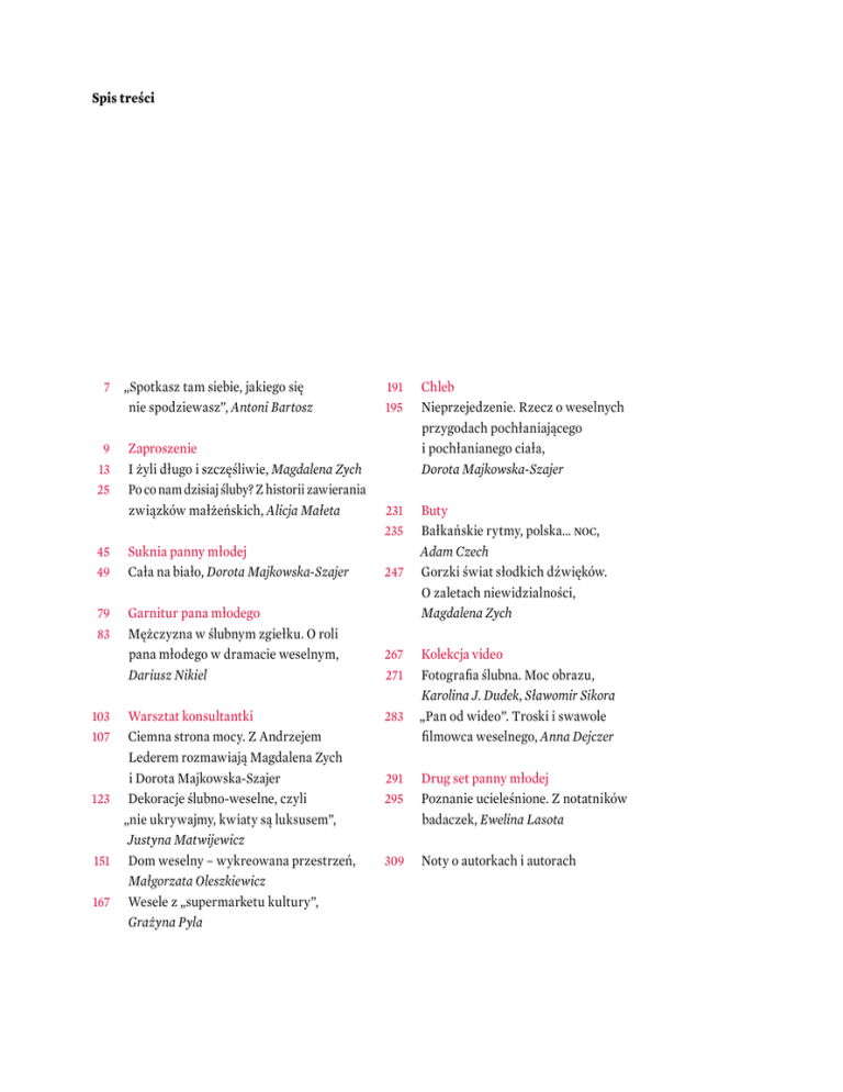 Spis treści 7 „Spotkasz tam siebie, jakiego się nie spodziewasz”, Antoni Bartosz 191 195 Chleb Nieprzejedzenie. Rzecz o weselnych przygodach pochłaniającego i pochłanianego ciała, Dorota Majkowska-Szajer 231 2 35 Buty Bałkańskie rytmy, polska… NOC, Adam Czech Gorzki świat słodkich dźwięków. O zaletach niewidzialności, Magdalena Zych 9Zaproszenie 13 I żyli długo i szczęśliwie, Magdalena Zych 25 Po co nam dzisiaj śluby? Z historii zawierania związków małżeńskich, Alicja Małeta 45 49 Suknia panny młodej Cała na biało, Dorota Majkowska-Szajer 2 47 79 83 Garnitur pana młodego Mężczyzna w ślubnym zgiełku. O roli pana młodego w dramacie weselnym, Dariusz Nikiel 2 67 271 103 107 Warsztat konsultantki Ciemna strona mocy. Z Andrzejem Lederem rozmawiają Magdalena Zych i Dorota Majkowska-Szajer 123 Dekoracje ślubno-weselne, czyli „nie ukrywajmy, kwiaty są luksusem”, Justyna Matwijewicz 151 Dom weselny – wykreowana przestrzeń, Małgorzata Oleszkiewicz 167 Wesele z „supermarketu kultury”, Grażyna Pyla 283 Kolekcja video Fotografia ślubna. Moc obrazu, Karolina J. Dudek, Sławomir Sikora „Pan od wideo”. Troski i swawole filmowca weselnego, Anna Dejczer 291 2 95 Drug set panny młodej Poznanie ucieleśnione. Z notatników badaczek, Ewelina Lasota 309 Noty o autorkach i autorach