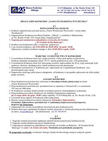 Biura Podr Podróży óży Albicja 15-879 Białystok, ul. Św. Rocha 10 lok. 218 tel. + +48 48 727 846 739; tel./fax +48 85 746 00 95 e-mail: [email protected] www.albicja.pl REGULAMIN KONKURSU „NASZA WYMARZONA WYCIECZKA” §1 POSTANOWIENIA OGÓLNE 1. Konkurs organizowany jest pod nazwą „Nasza Wymarzona Wycieczka”, zwany dalej "Konkursem". 2. Organizatorem Konkursu jest Biuro Podróży „Albicja”, z siedzibą w Białymstoku, ul. Św. Rocha 10 lok. 218, zwane dalej „Organizatorem”. 3. Nagrodą jest autokarowa jednodniowa wycieczka do Grodna „ W Grodzie Króla Batorego”. 4. Konkurs jest konkursem tylko i wyłącznie grupowym. 5. Czas trwania konkursu: od 14.03.2016 do 20.05.2016 do godz. 18.00 Ogłoszenie wyników konkursu nastąpi w dniu 23.05.2016 o godz. 12.00 §2 WARUNKI UCZESTNICTWA W KONKURSIE 1. Uczestnikiem Konkursu może być grupa uczniów z klasy pod opieką wychowawcy. Konkurs obejmuje następujące klasy: IV-VI szkoły podstawowej oraz I-III gimnazjum. 2. Uczestnikiem Konkursu może być inna grupa uczniów maksymalnie do 20 os. typu samorząd, koło naukowe, drużyna działająca przy szkole podstawowej lub gimnazjum. 3. Warunkiem uczestnictwa w Konkursie jest zapoznanie się z regulaminem Konkursu oraz przestrzeganie jego zasad. 4. Organizator zastrzega sobie prawo odstąpienia od konkursu w przypadku zgłoszenia się tylko jednej grupy uczniów. §3 ZASADY KONKURSU 1. Praca konkursowa powinna być wykonana w dowolnej technice plastycznej na temat: „Nasza Wymarzona Wycieczka”. 2. Praca konkursowa powinna być przedstawiona co najmniej w formacie B1 ( o wymiarach: 707 mm na 1000 mm). 3. W Konkursie oceniany będzie przede wszystkim pomysł i niestandardowe wykonanie. 4. Pracę konkursową należy dostarczyć do siedziby Organizatora najpóźniej do 13 maja 2016, do godz. 18.00 ( adres siedziby: 15-879 Białystok, ul. Św. Rocha 10 lok. 218) 5. Uczestnik może zgłosić do konkursu tylko jedna pracę. 6. Razem z pracą konkursową należy dostarczyć Formularz Zgłoszeniowy. Formularz Zgłoszeniowy powinien być w zamkniętej nieprzezroczystej kopercie. Koperta nie oznaczona. 7. Organizator nie zwraca uczestnikom otrzymanych prac konkursowych. 8. Pytania dotyczące regulaminu Konkursu można przesyłać w formie pisemnej pocztą elektroniczną na adres: [email protected] lub telefonicznie tel. 85 746 00 95 §4 NAGRODY 1. Nagroda zostanie przyznana najlepszej spośród dostarczonych prac konkursowych. 2. Nagroda została ufundowana przez Organizatora. 3. Nagrodą jest autokarowa jednodniowa wycieczka do Grodna na Białorusi „ W Grodzie Króla Batorego” w cenie 1 zł. brutto od osoby. Niezbędne jest posiadanie paszportu. W programie wycieczki: zwiedzanie Starego Zamku Królewskiego-miejsca walnych sejmów Biura Podr Podróży óży Albicja 15-879 Białystok, ul. Św. Rocha 10 lok. 218 tel. + +48 48 727 846 739; tel./fax +48 85 746 00 95 e-mail: [email protected] www.albicja.pl Rzeczpospolitej, zwiedzanie Nowego Zamku wzniesionego za panowania Augusta III jako letnią rezydencję królów polskich i wielkich książąt litewskich, zwiedzanie kościoła farnego z cudownym obrazem N.M.P. Studenckiej, najstarszej cerkwi śśw. Borysa i Gleba oraz zwiedzanie Domu- Muzeum Elizy Orzeszkowej. 4. W ramach nagrody, fundator Organizator zapewnia: transport autokarowy, usługę przewodnika w j. polskim, bilety wstępu, opiekę pilota, usługę wizową, opłatę konsularną, ubezpieczenie NNW i KL oraz nieodpłatny wyjazd dla opiekunów grupy: na każde 10 os. 1 opiekun nieodpłatnie. 5. Termin realizacji nagrody uzgodniony ze zwycięzcą konkursu: do 23.06.2016 lub od 2.09.2016 do 30.10.2016. 6. Opiekun zwycięskiej klasy zostanie powiadomiony o wygranej pocztą elektroniczną oraz telefonicznie w dniu 23.05.2016 po godzinie 12:00. Wyniki zostaną również ogłoszone na stronie internetowej www.albicja.pl 7. Opiekun zwycięskiej klasy powinien wolę przyjęcia nagrody potwierdzić pisemnie na pocztę elektroniczną na adres [email protected] w terminie 3 dni od dnia otrzymania powiadomienia wraz z listą osób biorących udział w konkursie. §5 JURY KONKURSU 1. Jury Konkursu powołuje organizator. 2. W skład 3 osobowego jury wejdzie: artysta plastyk, arteterapeuta, lokalny dziennikarz. 3. Członkowie Jury będą oceniać prace konkursowe na podstawie punktacji w skali od 1 do 6. 4. Nagroda zostanie przyznana pracy konkursowej, która otrzyma najwięcej punktów. 5. Wszystkie decyzje Jury Konkursu są nieodwołalne. §6 NAGRODY POCIESZENIA 1. Wszyscy uczestnicy konkursu będą uprawnieni do wykupienia dowolnej wycieczki u Organizatora w sezonie 2016/2017 korzystając z następujących zniżek: Wycieczka jednodniowa do 200 zł/os 15% od wartości wycieczki Wycieczka wielodniowa od 201 zł/os do 400 zł/os 10% od wartości wycieczki Wycieczka wielodniowa od 401 zł/os do 900 zł/os 5% od wartości wycieczki §7 DANE OSOBOWE UCZESTNIKÓW KONKURSU 1. Warunkiem udziału w Konkursie jest podanie przez Uczestnika Konkursu prawdziwych danych osobowych. 2. Organizator zobowiązuje się do ochrony danych osobowych zgodnie z ustawą o Ochronie danych osobowych oraz oświadcza, że podane dane będą przetwarzane wyłącznie w celu przeprowadzenia niniejszego Konkursu oraz w celu zrealizowania nagrody. §8 POSTANOWIENIA KOŃCOWE 1. Wszelkie wątpliwości dotyczące zasad Konkursu, postanowień jego Regulaminu oraz interpretacji rozstrzyga Organizator. 2. Organizator jest uprawniony do zmiany postanowień niniejszego Regulaminu o ile nie wpłynie to na pogorszenie warunków uczestnictwa w Konkursie. Dotyczy to w szczególności zmian terminów poszczególnych czynności konkursowych oraz zmian specyfikacji nagrody. Zmieniony Regulamin obowiązuje od czasu opublikowania go na stronie www.albicja.pl