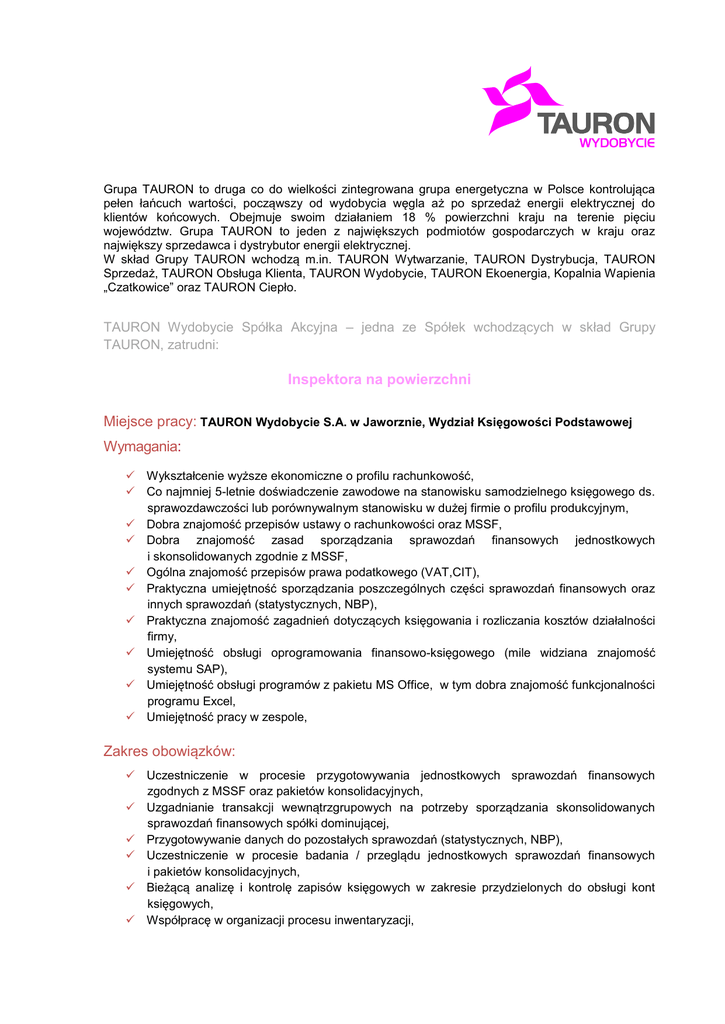 Grupa TAURON to druga co do wielkości zintegrowana grupa energetyczna w Polsce kontrolująca pełen łańcuch wartości, począwszy od wydobycia węgla aż po sprzedaż energii elektrycznej do klientów końcowych. Obejmuje swoim działaniem 18 % powierzchni kraju na terenie pięciu województw. Grupa TAURON to jeden z największych podmiotów gospodarczych w kraju oraz największy sprzedawca i dystrybutor energii elektrycznej. W skład Grupy TAURON wchodzą m.in. TAURON Wytwarzanie, TAURON Dystrybucja, TAURON Sprzedaż, TAURON Obsługa Klienta, TAURON Wydobycie, TAURON Ekoenergia, Kopalnia Wapienia „Czatkowice” oraz TAURON Ciepło. TAURON Wydobycie Spółka Akcyjna – jedna ze Spółek wchodzących w skład Grupy TAURON, zatrudni: Inspektora na powierzchni Miejsce pracy: TAURON Wydobycie S.A. w Jaworznie, Wydział Księgowości Podstawowej Wymagania: Wykształcenie wyższe ekonomiczne o profilu rachunkowość, Co najmniej 5-letnie doświadczenie zawodowe na stanowisku samodzielnego księgowego ds. sprawozdawczości lub porównywalnym stanowisku w dużej firmie o profilu produkcyjnym, Dobra znajomość przepisów ustawy o rachunkowości oraz MSSF, Dobra znajomość zasad sporządzania sprawozdań finansowych jednostkowych i skonsolidowanych zgodnie z MSSF, Ogólna znajomość przepisów prawa podatkowego (VAT,CIT), Praktyczna umiejętność sporządzania poszczególnych części sprawozdań finansowych oraz innych sprawozdań (statystycznych, NBP), Praktyczna znajomość zagadnień dotyczących księgowania i rozliczania kosztów działalności firmy, Umiejętność obsługi oprogramowania finansowo-księgowego (mile widziana znajomość systemu SAP), Umiejętność obsługi programów z pakietu MS Office, w tym dobra znajomość funkcjonalności programu Excel, Umiejętność pracy w zespole, Zakres obowiązków: Uczestniczenie w procesie przygotowywania jednostkowych sprawozdań finansowych zgodnych z MSSF oraz pakietów konsolidacyjnych, Uzgadnianie transakcji wewnątrzgrupowych na potrzeby sporządzania skonsolidowanych sprawozdań finansowych spółki dominującej, Przygotowywanie danych do pozostałych sprawozdań (statystycznych, NBP), Uczestniczenie w procesie badania / przeglądu jednostkowych sprawozdań finansowych i pakietów konsolidacyjnych, Bieżącą analizę i kontrolę zapisów księgowych w zakresie przydzielonych do obsługi kont księgowych, Współpracę w organizacji procesu inwentaryzacji, Strona 2 z 2 Uczestnictwo we wdrażaniu nowych metod i zasad prowadzenia rachunkowości. Oferujemy: Możliwość pracy w stabilnej firmie, Atrakcyjne warunki wynagrodzenia, Możliwość pogłębienia doświadczeń zawodowych, Możliwość dokształcania się. CV oraz list motywacyjny ze wskazaniem nazwy stanowiska prosimy przesyłać do 21.08.2014r. na adres: TAURON Wydobycie S.A., Wydział Zarządzania Zasobami Pracowniczymi i Doskonalenia Zawodowego, ul. Grunwaldzka 37, 43-600 Jaworzno lub na e-mail: [email protected] z dołączoną klauzulą: Wyrażam zgodę na przetwarzanie moich danych osobowych dla potrzeb procesu rekrutacji zgodnie z Ustawą o ochronie danych osobowych z dn. 29.08.1997r., tekst jednolity: Dziennik Ustaw z 2002 r. nr 101, poz. 926 z późn. zm. Informujemy, że skontaktujemy się z wybranymi Kandydatami.