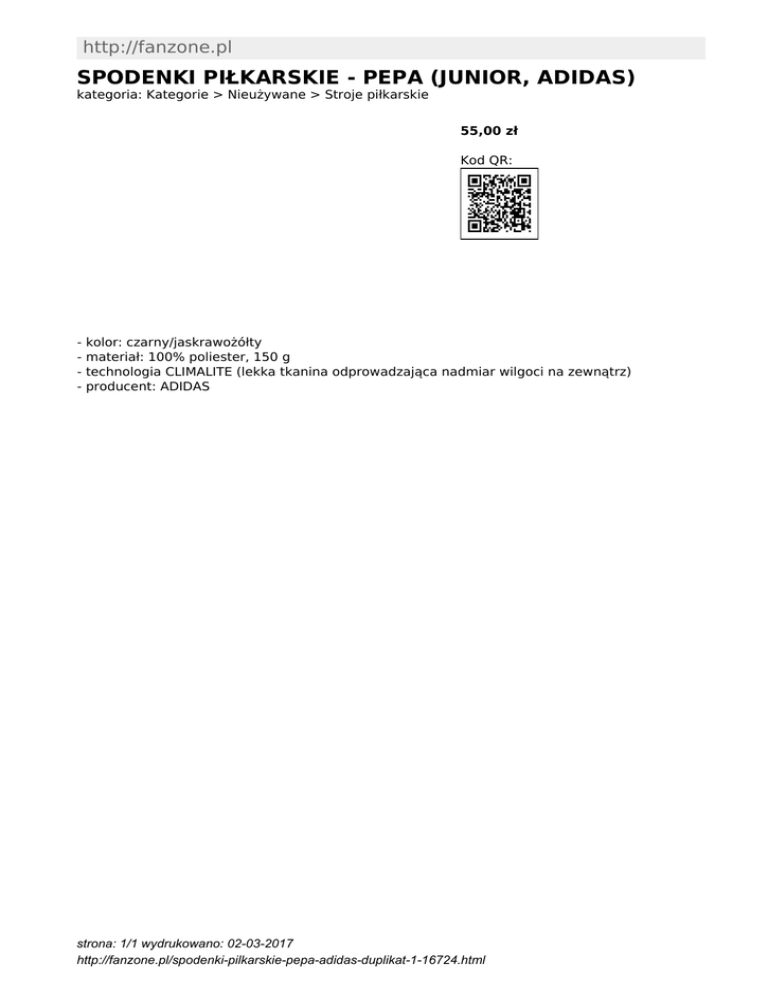 http://fanzone.pl SPODENKI PIŁKARSKIE - PEPA (JUNIOR, ADIDAS) kategoria: Kategorie > Nieużywane > Stroje piłkarskie 55,00 zł Kod QR: - kolor: czarny/jaskrawożółty materiał: 100% poliester, 150 g technologia CLIMALITE (lekka tkanina odprowadzająca nadmiar wilgoci na zewnątrz) producent: ADIDAS strona: 1/1 wydrukowano: 02-03-2017 http://fanzone.pl/spodenki-pilkarskie-pepa-adidas-duplikat-1-16724.html