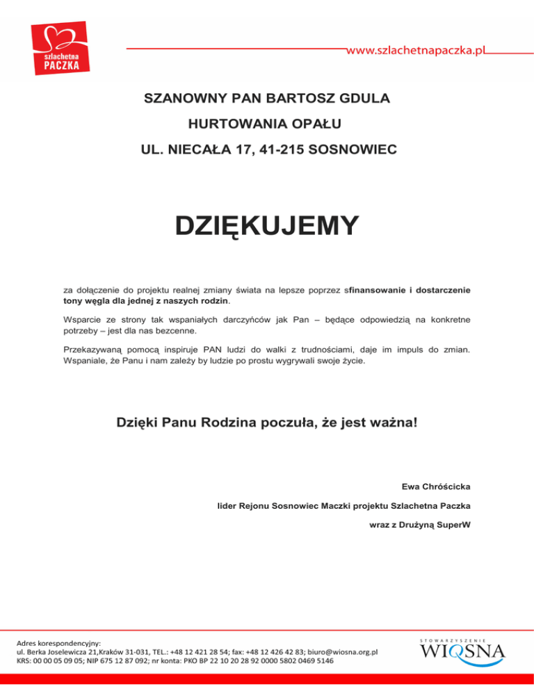 SZANOWNY PAN BARTOSZ GDULA HURTOWANIA OPAŁU UL. NIECAŁA 17, 41-215 SOSNOWIEC DZIĘKUJEMY za dołączenie do projektu realnej zmiany świata na lepsze poprzez sfinansowanie i dostarczenie tony węgla dla jednej z naszych rodzin. Wsparcie ze strony tak wspaniałych darczyńców jak Pan – będące odpowiedzią na konkretne potrzeby – jest dla nas bezcenne. Przekazywaną pomocą inspiruje PAN ludzi do walki z trudnościami, daje im impuls do zmian. Wspaniale, że Panu i nam zależy by ludzie po prostu wygrywali swoje życie. Dzięki Panu Rodzina poczuła, że jest ważna! Ewa Chróścicka lider Rejonu Sosnowiec Maczki projektu Szlachetna Paczka wraz z Drużyną SuperW