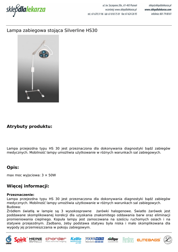 Lampa zabiegowa stojąca Silverline HS30 Atrybuty produktu: Lampa przejezdna typu HS 30 jest przeznaczona dla dokonywania diagnostyki bądź zabiegów medycznych. Mobilność lampy umożliwia użytkowanie w różnych warunkach sal zabiegowych. Opis: max moc wyjsciowa: 3 × 50W Więcej informacji: Przeznaczenie: Lampa przejezdna typu HS 30 jest przeznaczona dla dokonywania diagnostyki bądź zabiegów medycznych. Mobilność lampy umożliwia użytkowanie w różnych warunkach sal zabiegowych. Budowa: Źródłem światłą w lampie są 3 wysokosprawne żarówki halogenowe. Światło żarówek jest poddawane skomplikowanej korekcji dla uzyskania znakomitego oddawania barw oraz eliminacji promieniowania cieplnego. Kopuła lampy jest zamocowana na sześciu ruchomych osiach i na statywie przejezdnym. Zadbano, żeby podstawa statywu była niska i mało skomplikowana dla wygody jej przemieszczania w pokoju zabiegowym. Lampa jest wyposażona w regulację ogniskowania, co pozwala na regulację wielkości pola operacyjnego dla różnych ustawień lamp. Intensywność oświetlenia jest regulowana w sposób elektroniczny. Lampa HS 30 może być na życzenie użytkownika wyposażona w awaryjny zasilacz akumulatorowy zapewniający co najmniej 3 godziny pracy. Zasilacz akumulatorowy jest automatycznym urządzeniem nie wymagającym obsługi. Lampa z dodatkowym zasilaczem akumulatorowym jest oznaczona dodatkowo literą A, tzn. jej pełne oznaczenie brzmi „HS 30A”. Cechy użytkowe: Wysokie parametry świetlne i wysoka intensywność oświetlenia dochodząca do 110 000 lx osiągnięte dzięki wysokiej jakości optyce. Bardzo dobra manewrowość lampy uzyskana z pomocą układu wieloosiowego zawieszenia. Bardzo niska podstawa dla łatwego ustawiania. Wysoka trwałość komponentów i łatwo dostępne żarówki obniżające koszty eksploatacji. Parametry użytkowe: Regulowana intensywność oświetlenia: 110 000 lx. Regulowana średnica pola roboczego: 14-28 cm. Zakres ogniskowania: 60-150 cm. Emisja ciepła przy 100 000 lx: 360 W/m2. Temperatura barwowa: 4300±200 K. Współczynnik oddawania barw: 96. Przyrost temperatury na wysokości głowy: 2°C. Zakres regulacji wysokości kopuły: 1.2-2 m. Średnica kopuły: 460 mm. Moc zainstalowanych żarówek: 3 × 50W. Pobór mocy lampy: 250 W. Trwałość żarówek: 3000 h. Czas pracy przy zasilaniu akumulatorowym: 3 h. Klasa zabezpieczenia elektrycznego przeciwporażeniowego: II. Typ zabezpieczenia elektrycznego przeciwporażeniowego: B. Zgodność z normami międzynarodowymi: IEC 601-1. EN 60601-2-41. EN 60601-1. Powered by TCPDF (www.tcpdf.org)